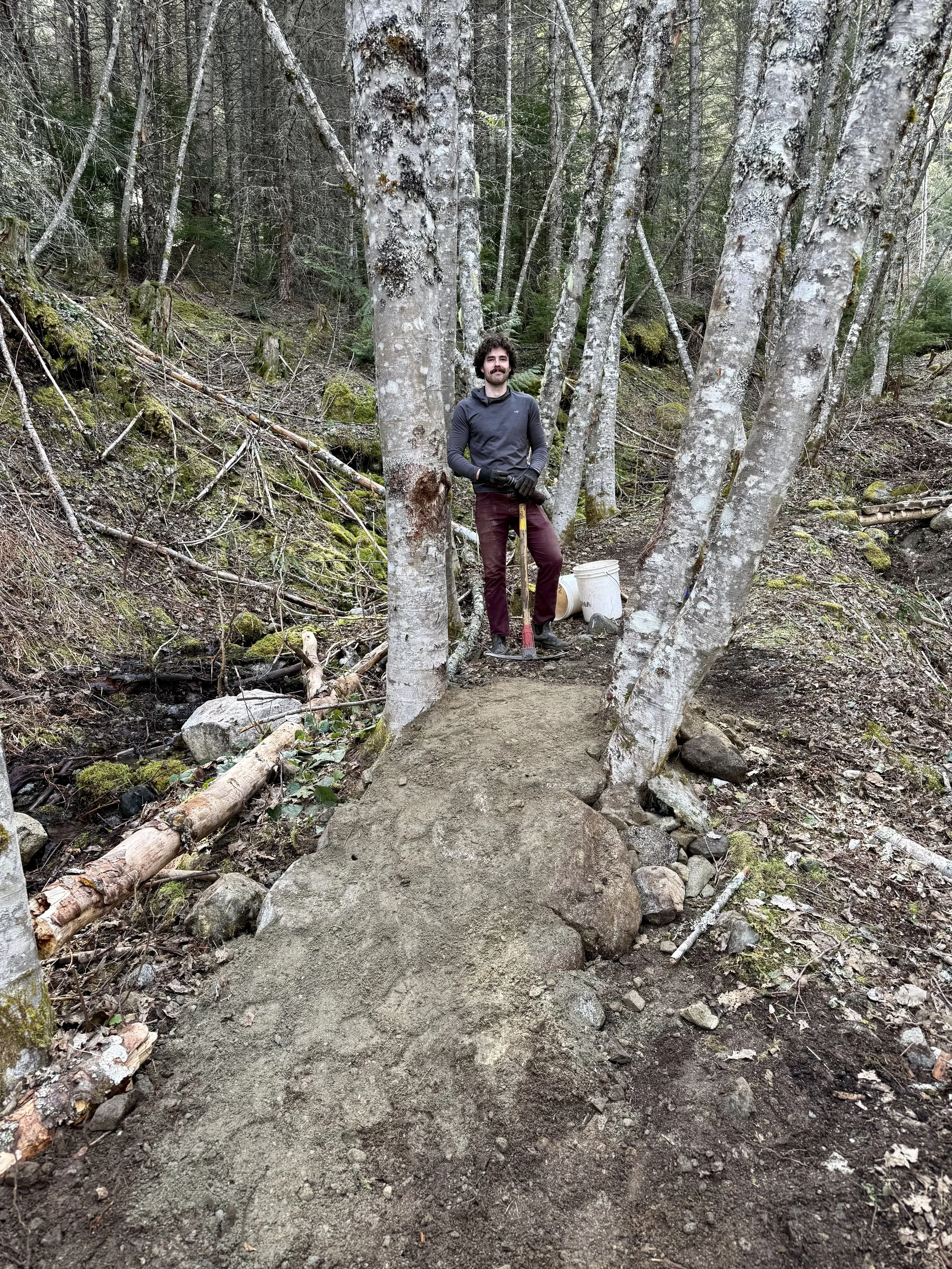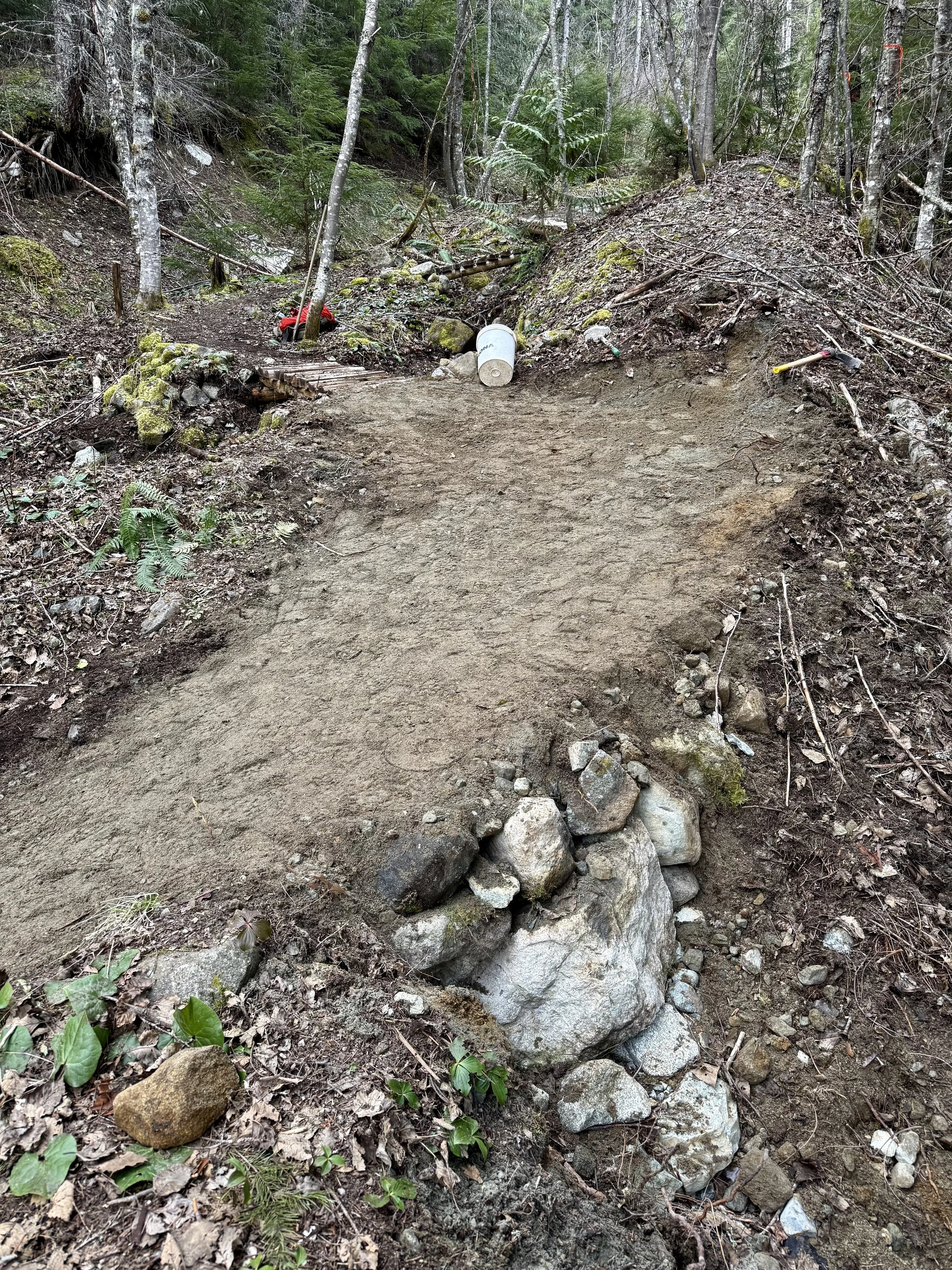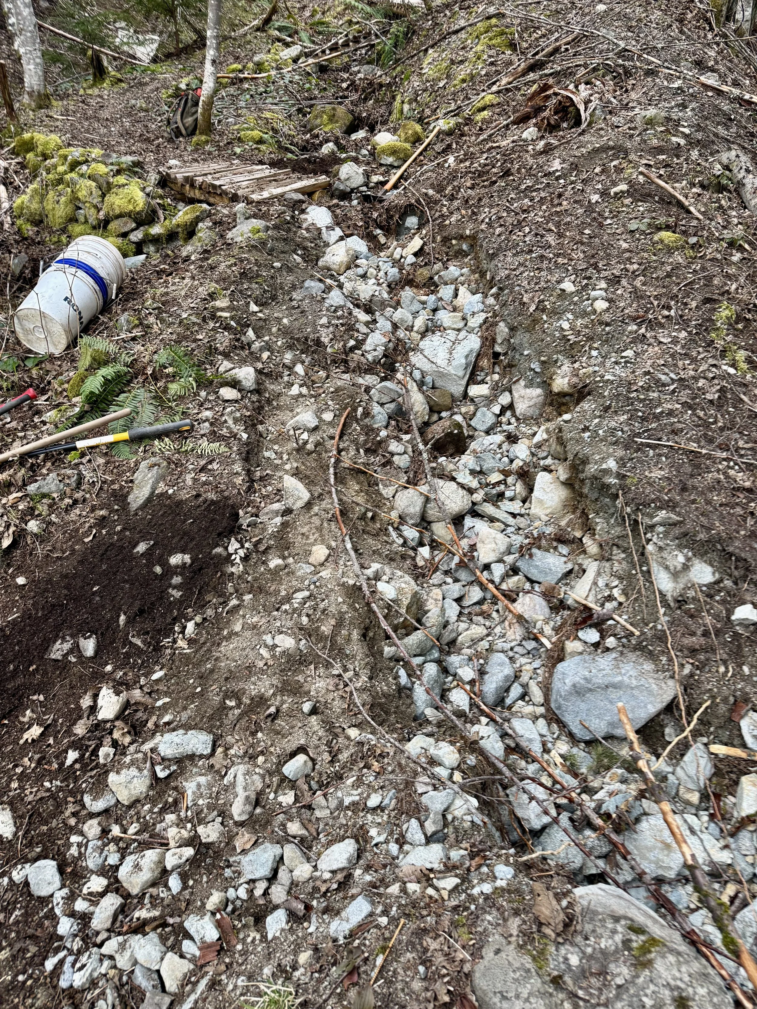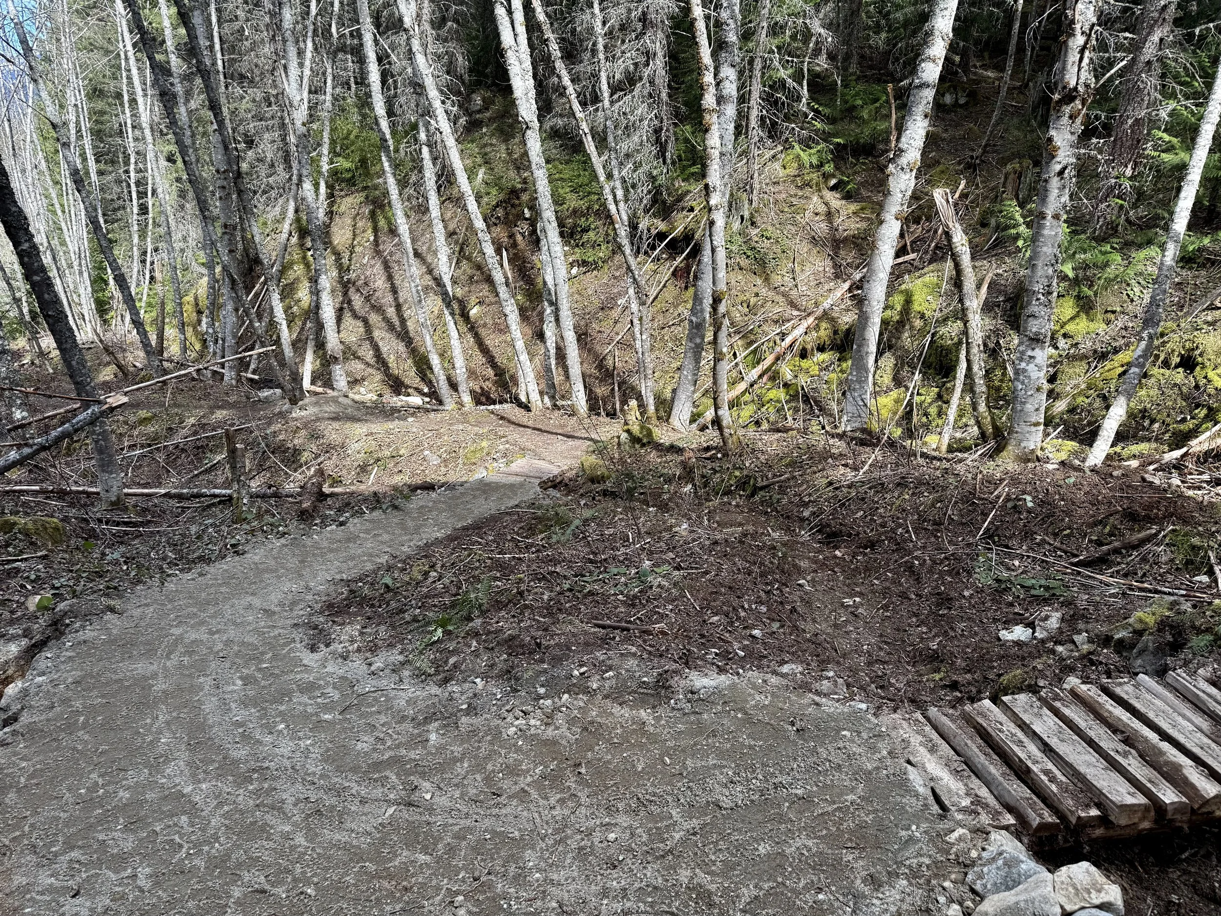 A pattern does emerge though… more “urgent” projects bumped them to “we’ll deal with this later this season…” and I found myself in that pattern again this week. Winter atmospheric rivers overwhelmed culverts and toppled trailside trees, ripping trail tread apart. We shifted our work to the access for Young Lust and the NEW Al Grey suspension bridge. We put in a full team effort rebuilding 5 metres of an old forestry service road and clearing deadfall. We also managed to fill a few holes and armour some transitions. “Did you cut down that finger smashing choke point between the alders?...” No we didn’t. We elevated the tread so that the handle bar squiggle is more reasonable. We were “under gunned” to deal with the huge trees on the south side of the suspension bridge so clearing those is moving to the top of next week’s priority list. The 2025 leftovers will get pushed back yet again…
