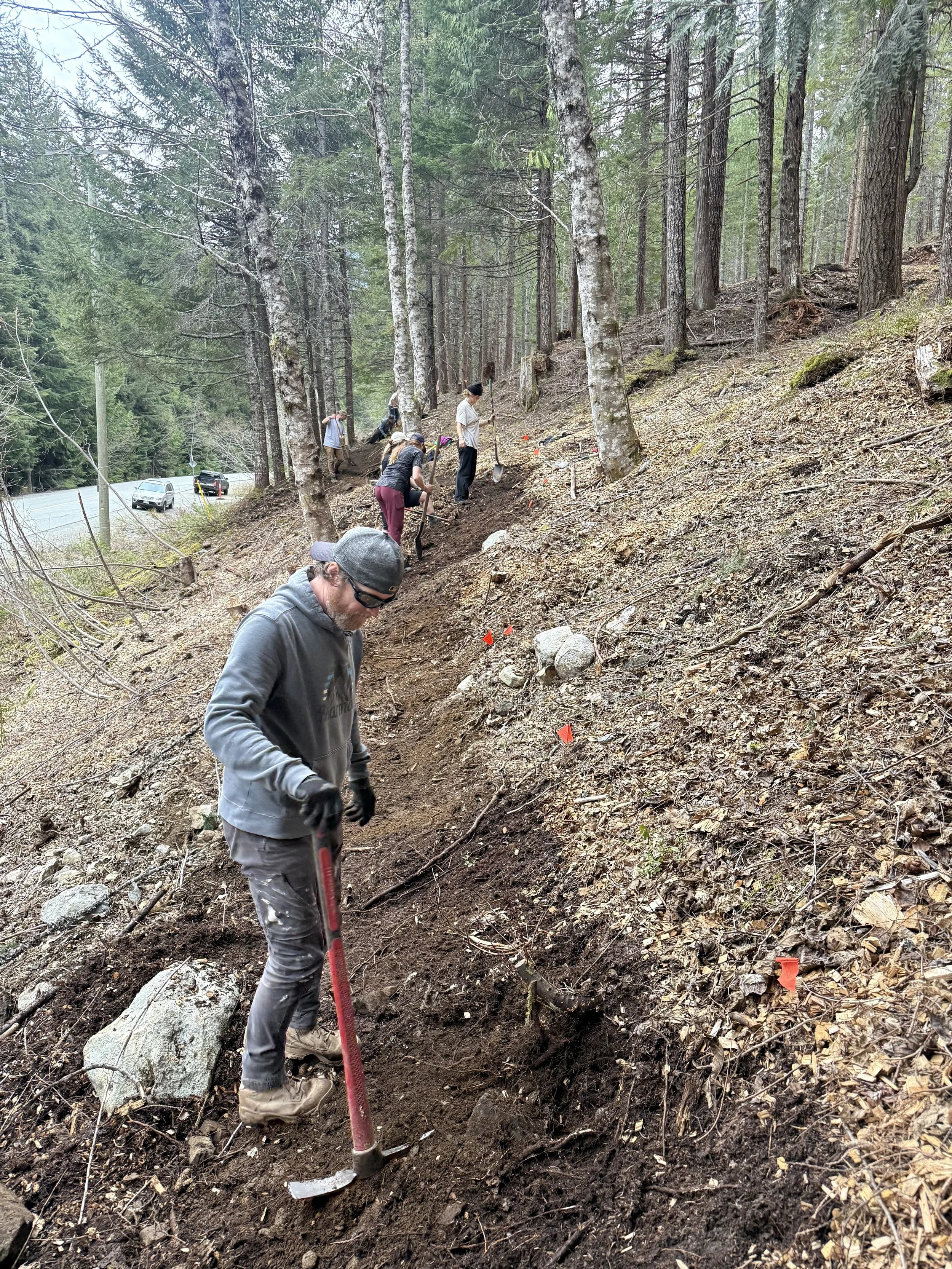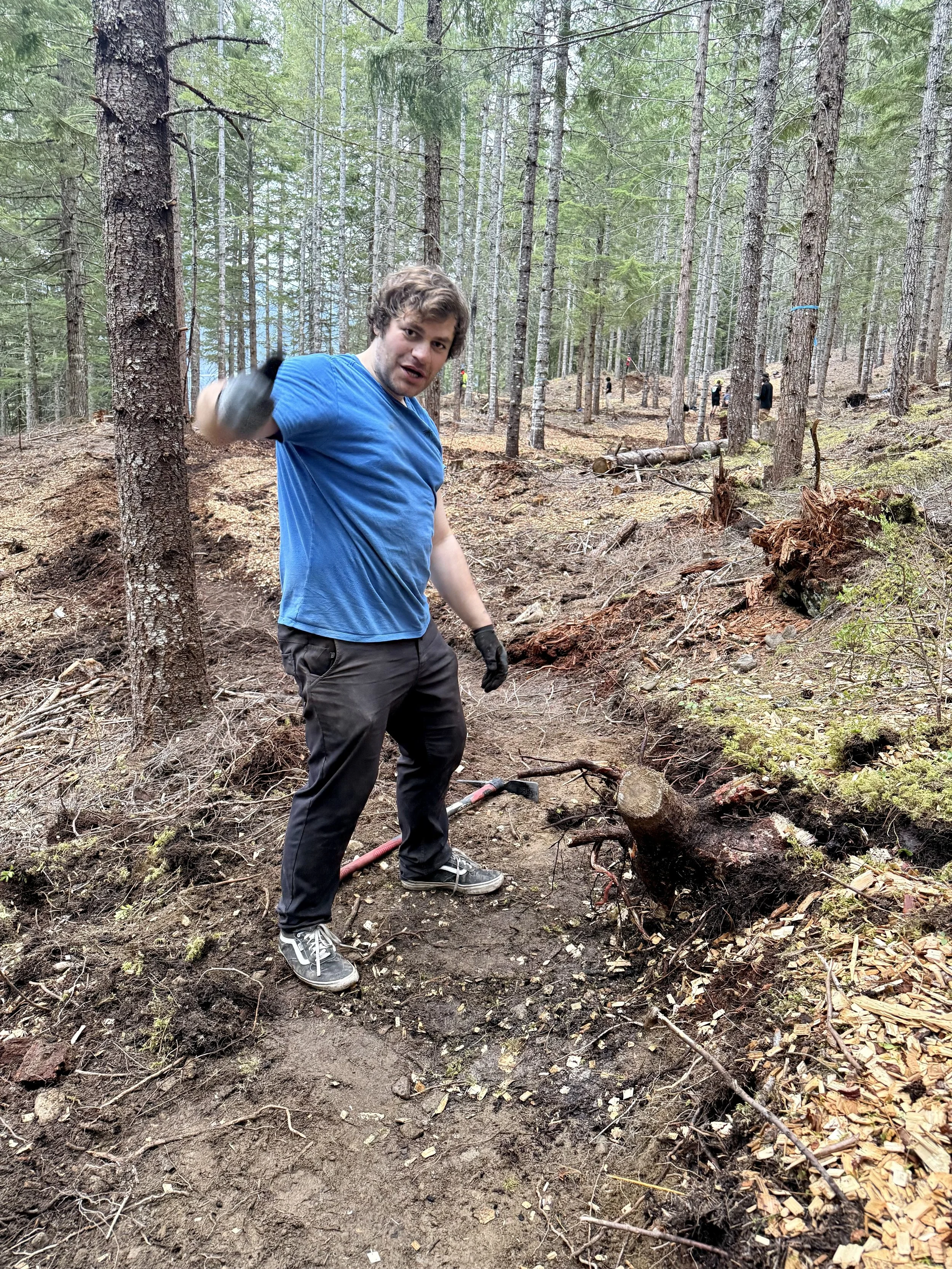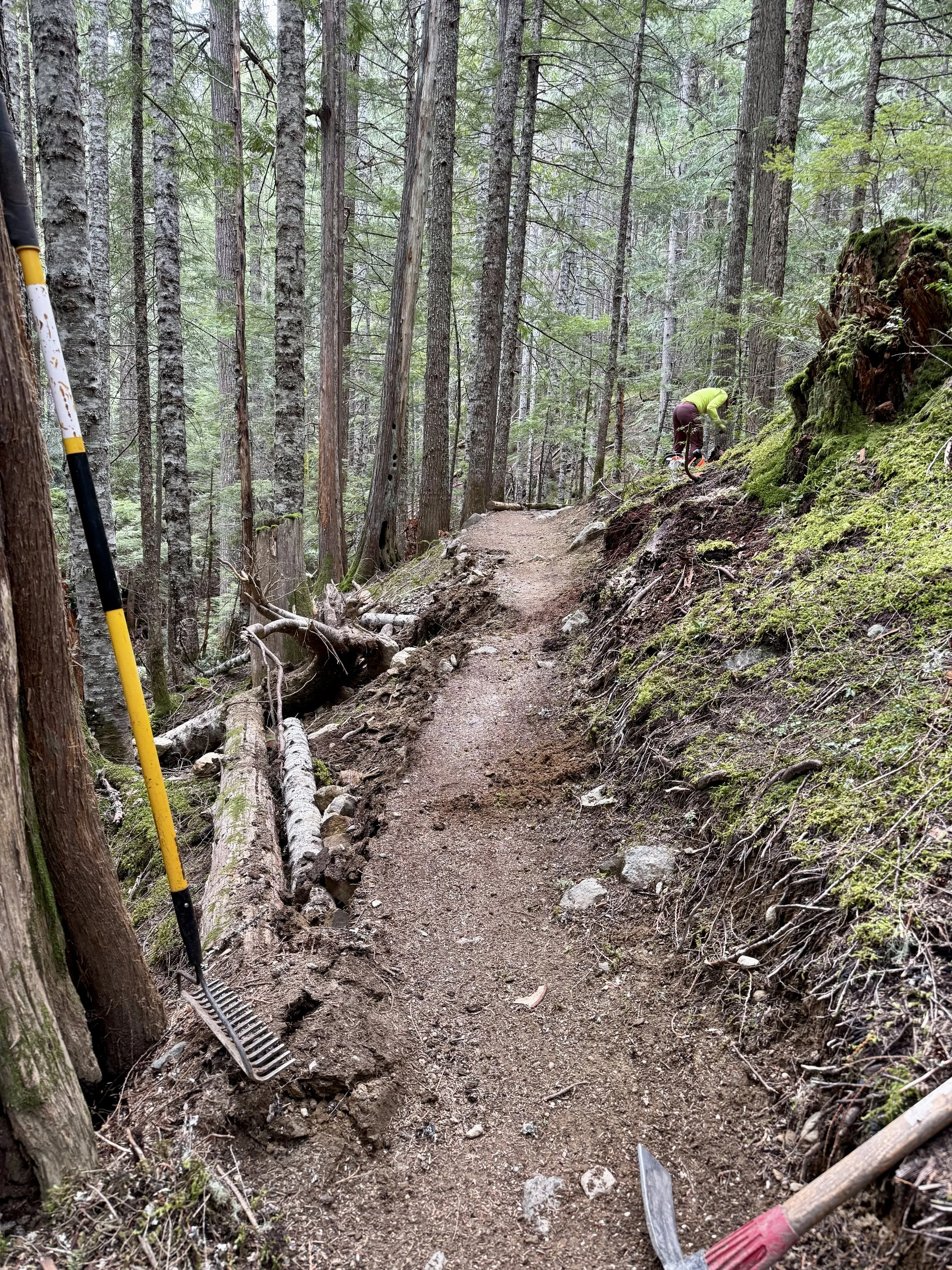 A pattern does emerge though… more “urgent” projects bumped them to “we’ll deal with this later this season…” and I found myself in that pattern again this week. Winter atmospheric rivers overwhelmed culverts and toppled trailside trees, ripping trail tread apart. We shifted our work to the access for Young Lust and the NEW Al Grey suspension bridge. We put in a full team effort rebuilding 5 metres of an old forestry service road and clearing deadfall. We also managed to fill a few holes and armour some transitions. “Did you cut down that finger smashing choke point between the alders?...” No we didn’t. We elevated the tread so that the handle bar squiggle is more reasonable. We were “under gunned” to deal with the huge trees on the south side of the suspension bridge so clearing those is moving to the top of next week’s priority list. The 2025 leftovers will get pushed back yet again…