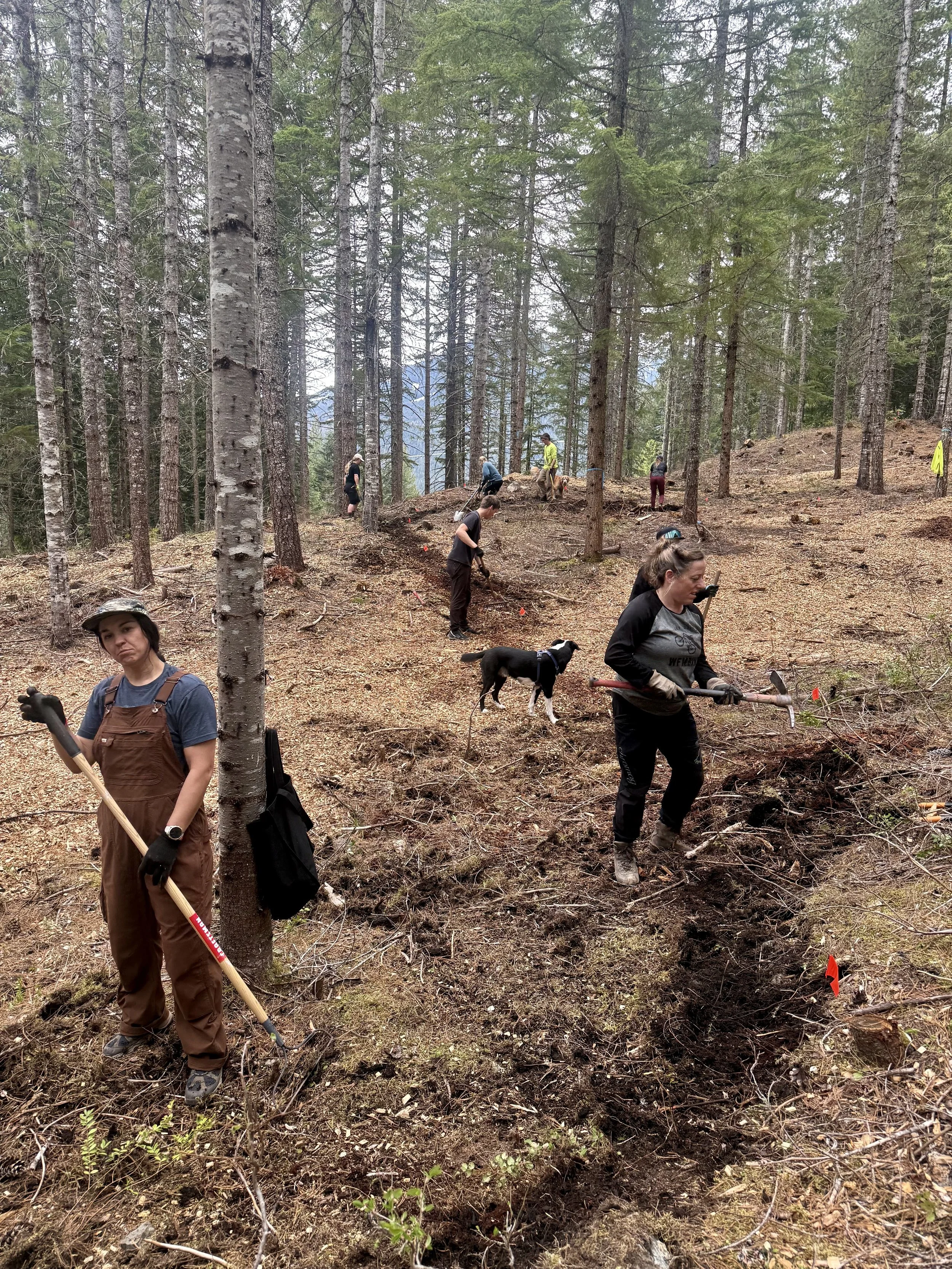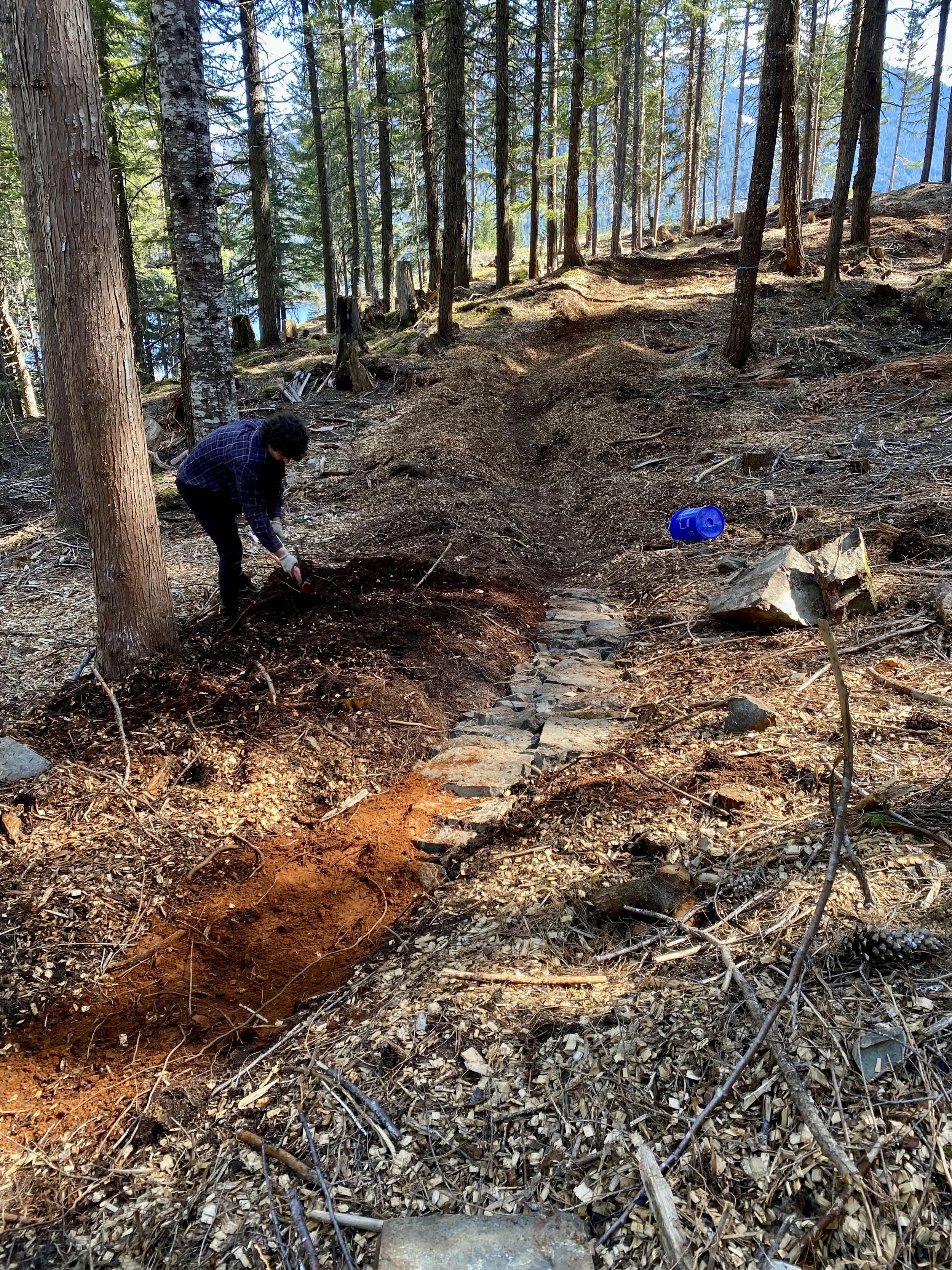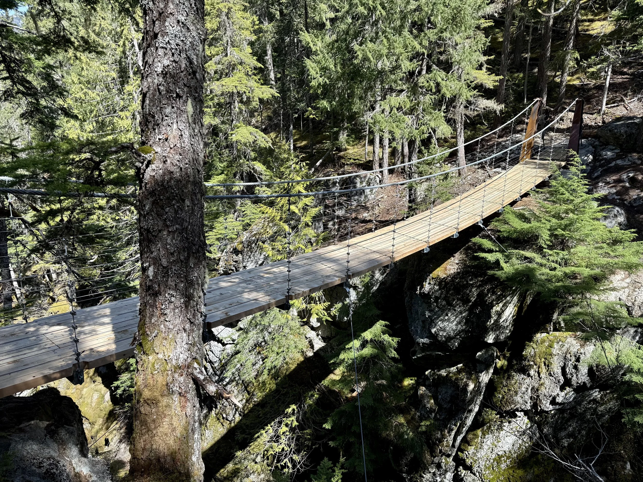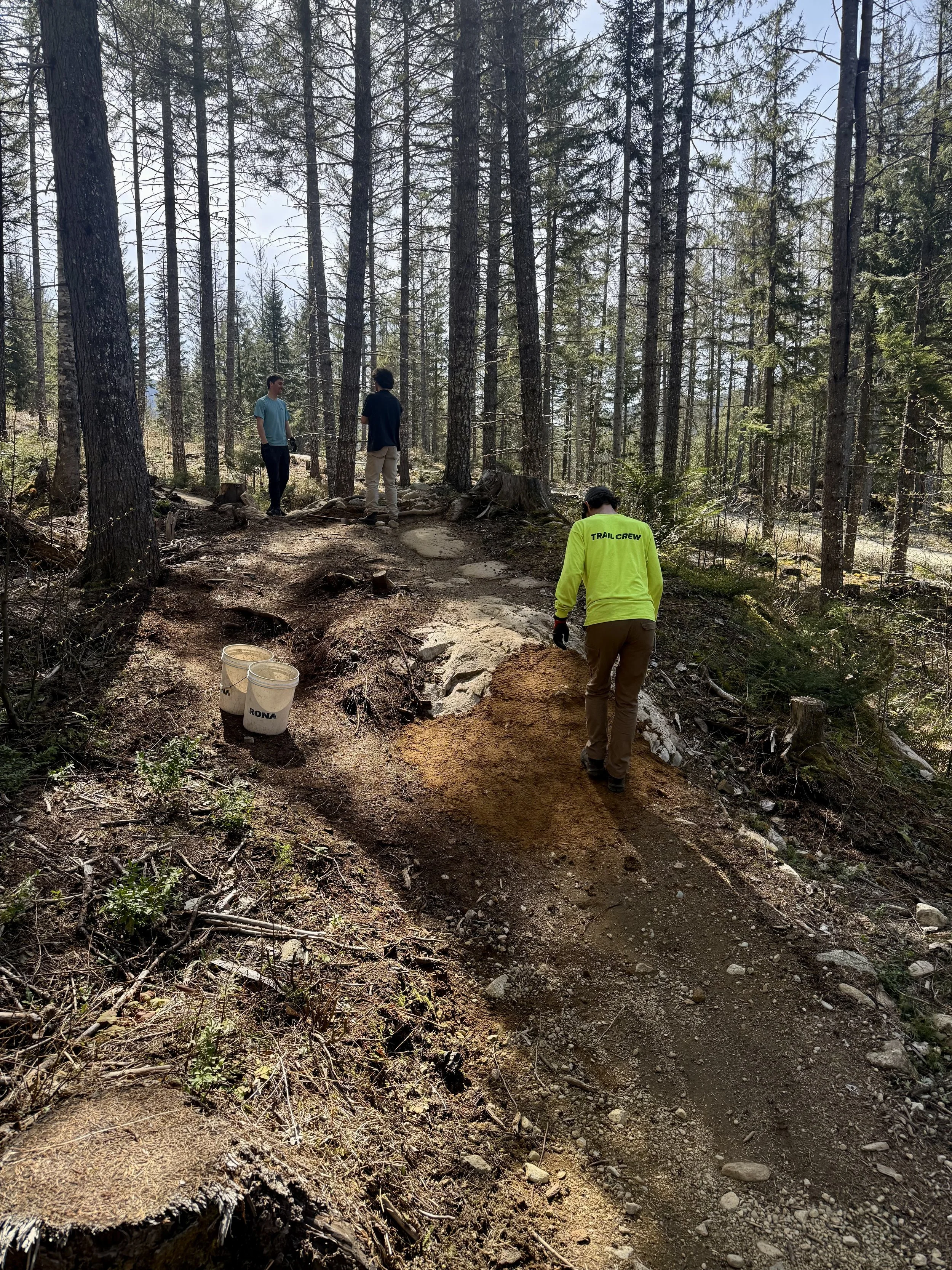 A pattern does emerge though… more “urgent” projects bumped them to “we’ll deal with this later this season…” and I found myself in that pattern again this week. Winter atmospheric rivers overwhelmed culverts and toppled trailside trees, ripping trail tread apart. We shifted our work to the access for Young Lust and the NEW Al Grey suspension bridge. We put in a full team effort rebuilding 5 metres of an old forestry service road and clearing deadfall. We also managed to fill a few holes and armour some transitions. “Did you cut down that finger smashing choke point between the alders?...” No we didn’t. We elevated the tread so that the handle bar squiggle is more reasonable. We were “under gunned” to deal with the huge trees on the south side of the suspension bridge so clearing those is moving to the top of next week’s priority list. The 2025 leftovers will get pushed back yet again…