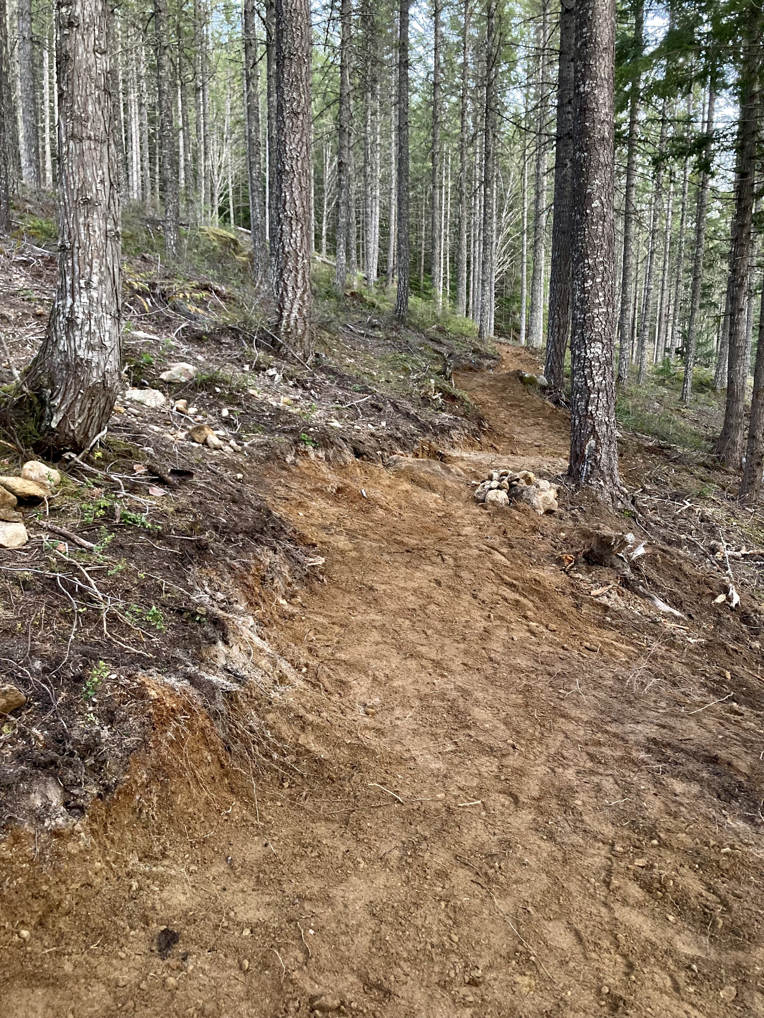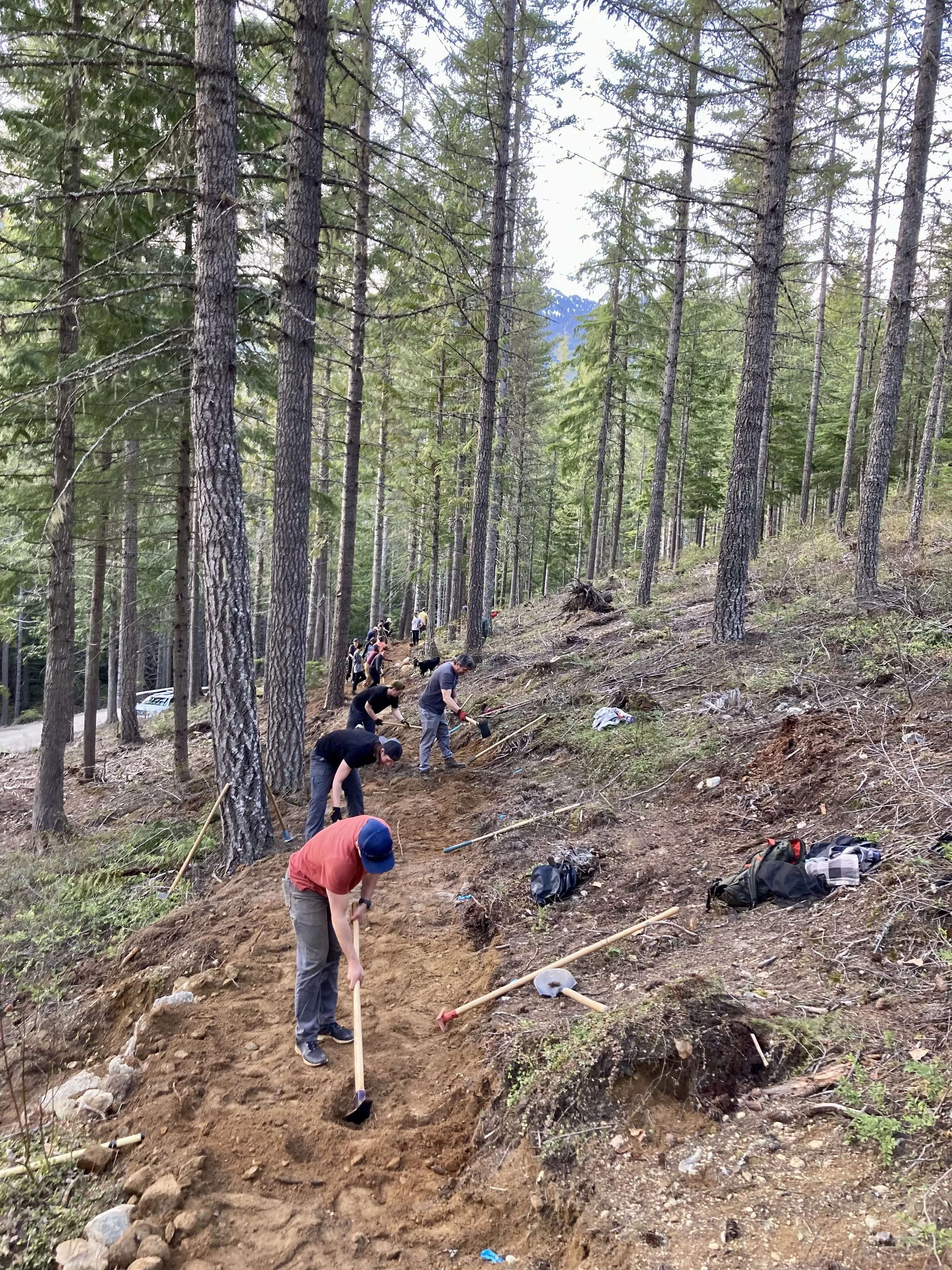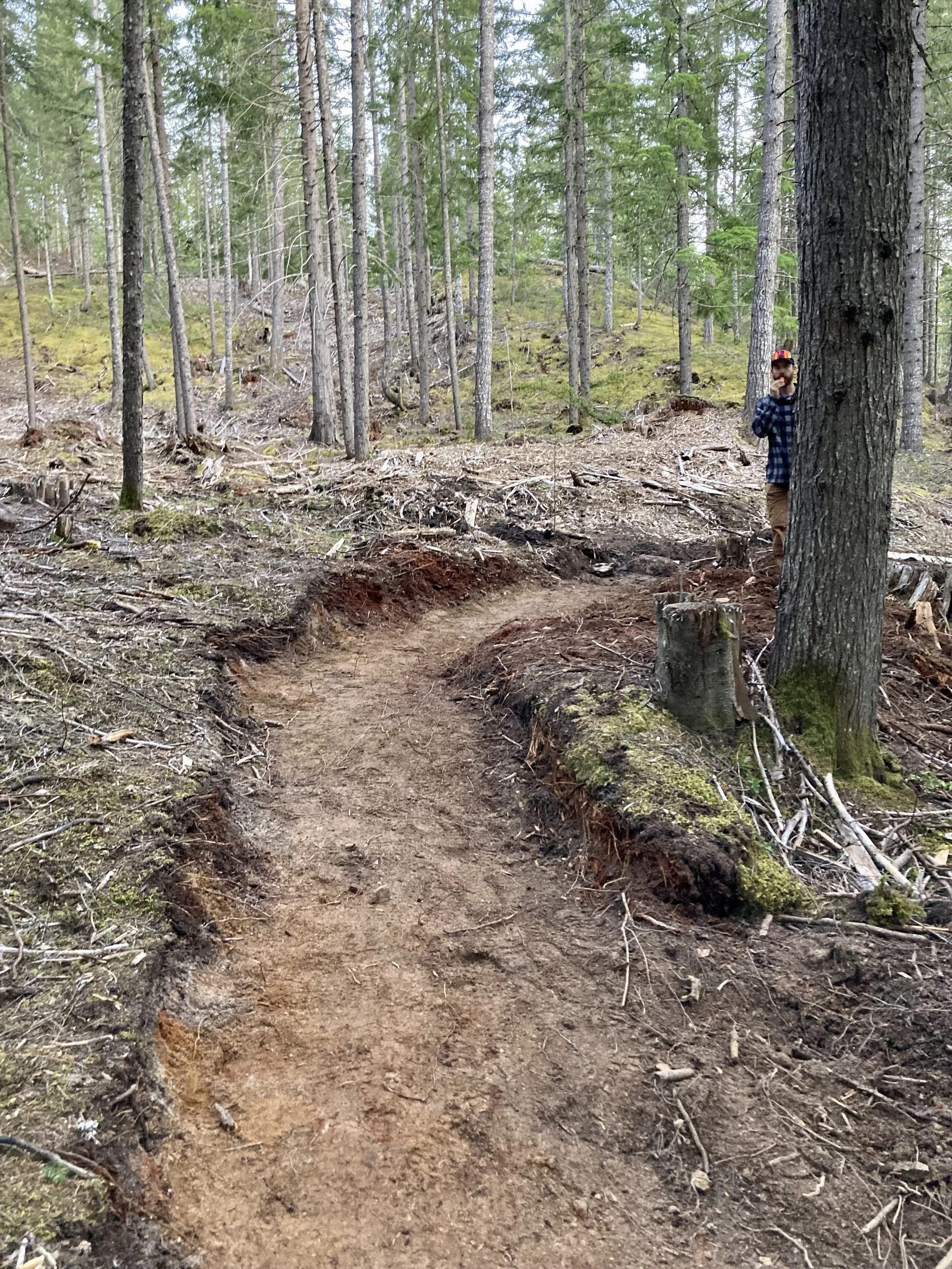 Our dig night volunteers’ enthusiasm is keeping us busy with preparing enough “ready to build” projects. Josh, Jacob and I encountered our first bear of the season while lining up the missing trail corridor. It wasn’t much of an encounter… The shiny coated bear was camera-shy and scurried away (towards Java Time) as soon as I got my phone out. Getting back to the task at hand, we managed to fight our way through the last bit of steep, dense, unruly second growth forest. Our battery powered chainsaw made short work of the crowded, stunted dead trees. Emerging into the next (fire-thinned) cut block, I immediately recognized the large Douglas Firs atop a prominent rise.