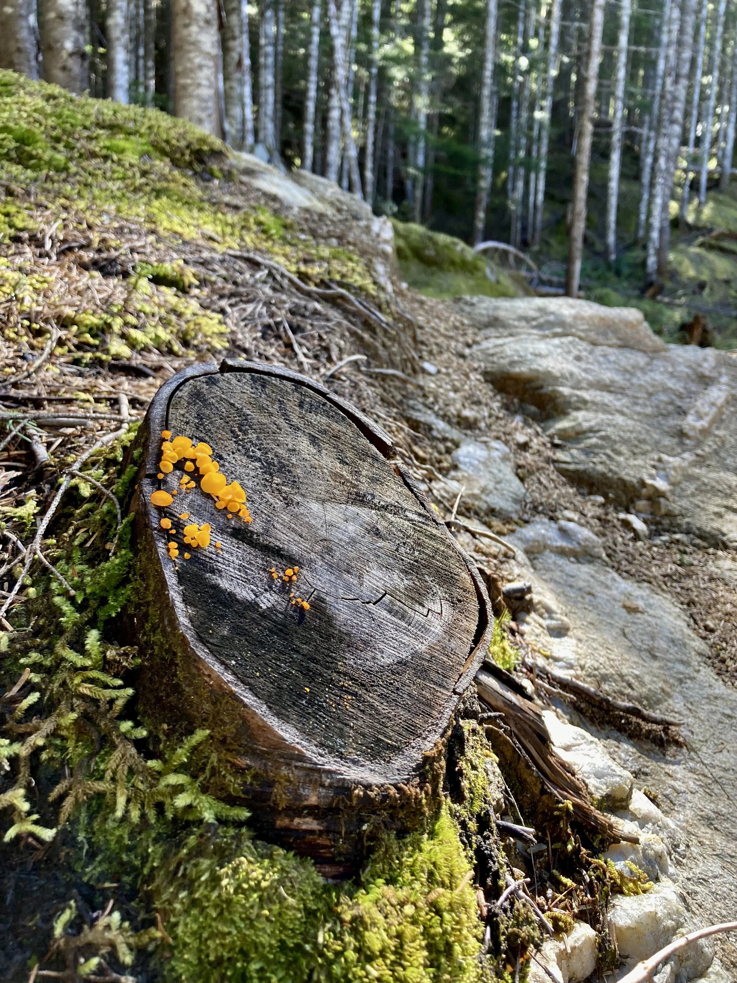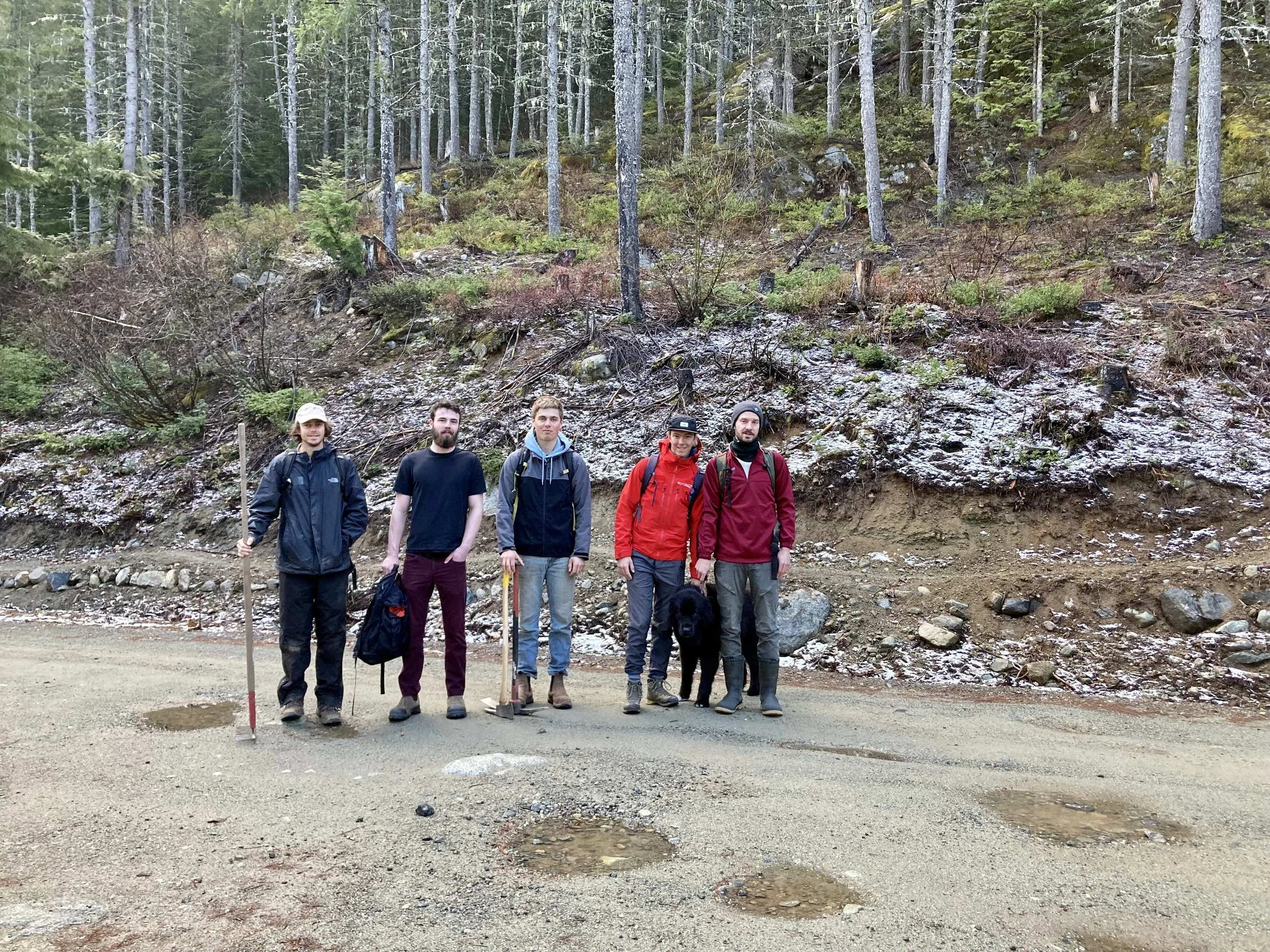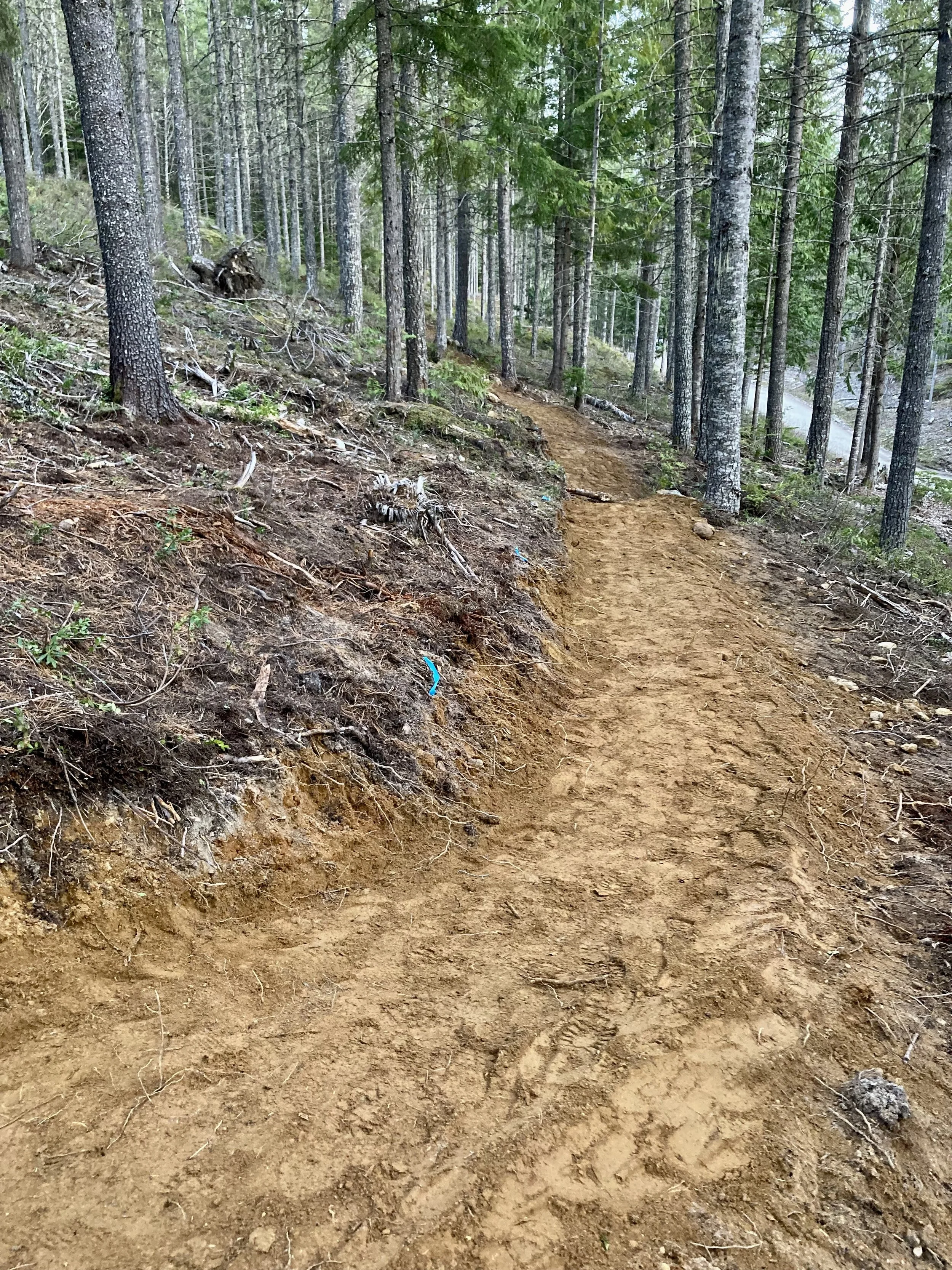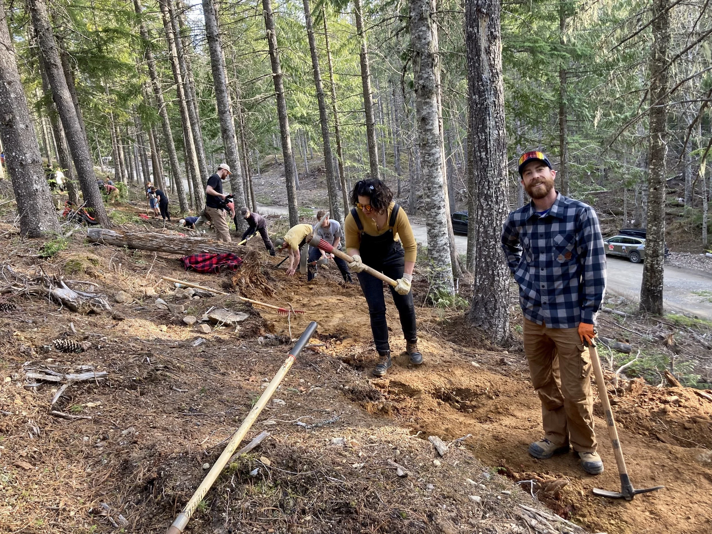 Our dig night volunteers’ enthusiasm is keeping us busy with preparing enough “ready to build” projects. Josh, Jacob and I encountered our first bear of the season while lining up the missing trail corridor. It wasn’t much of an encounter… The shiny coated bear was camera-shy and scurried away (towards Java Time) as soon as I got my phone out. Getting back to the task at hand, we managed to fight our way through the last bit of steep, dense, unruly second growth forest. Our battery powered chainsaw made short work of the crowded, stunted dead trees. Emerging into the next (fire-thinned) cut block, I immediately recognized the large Douglas Firs atop a prominent rise.
