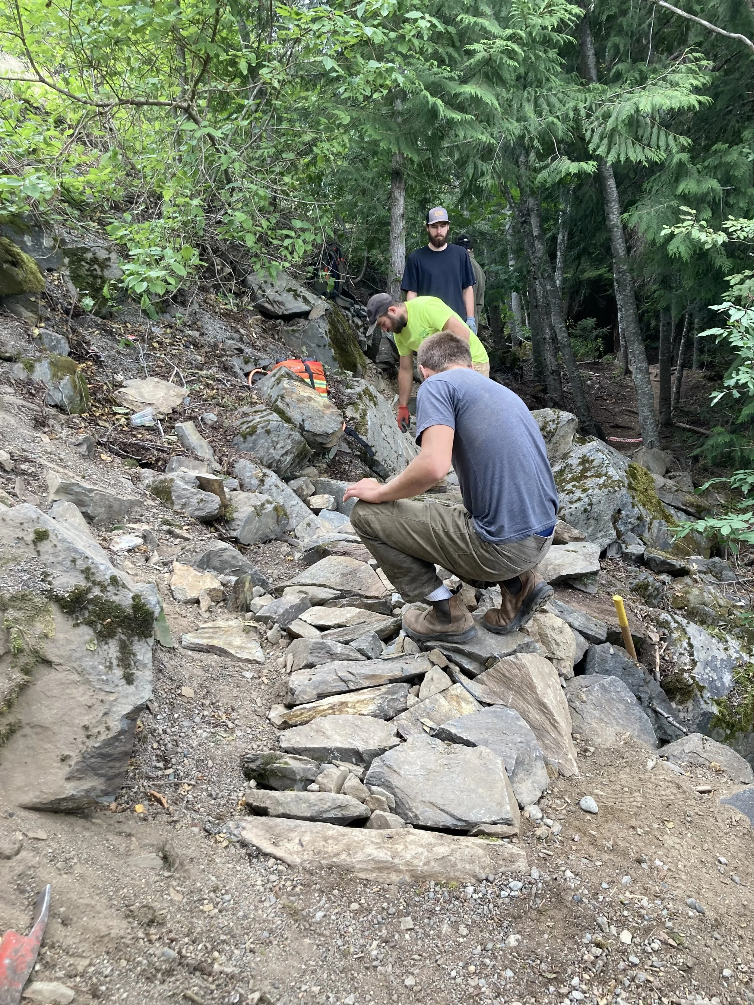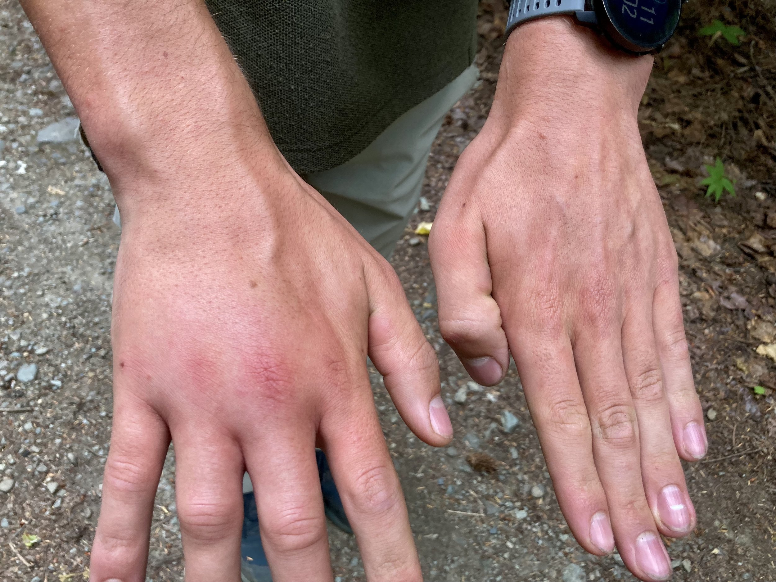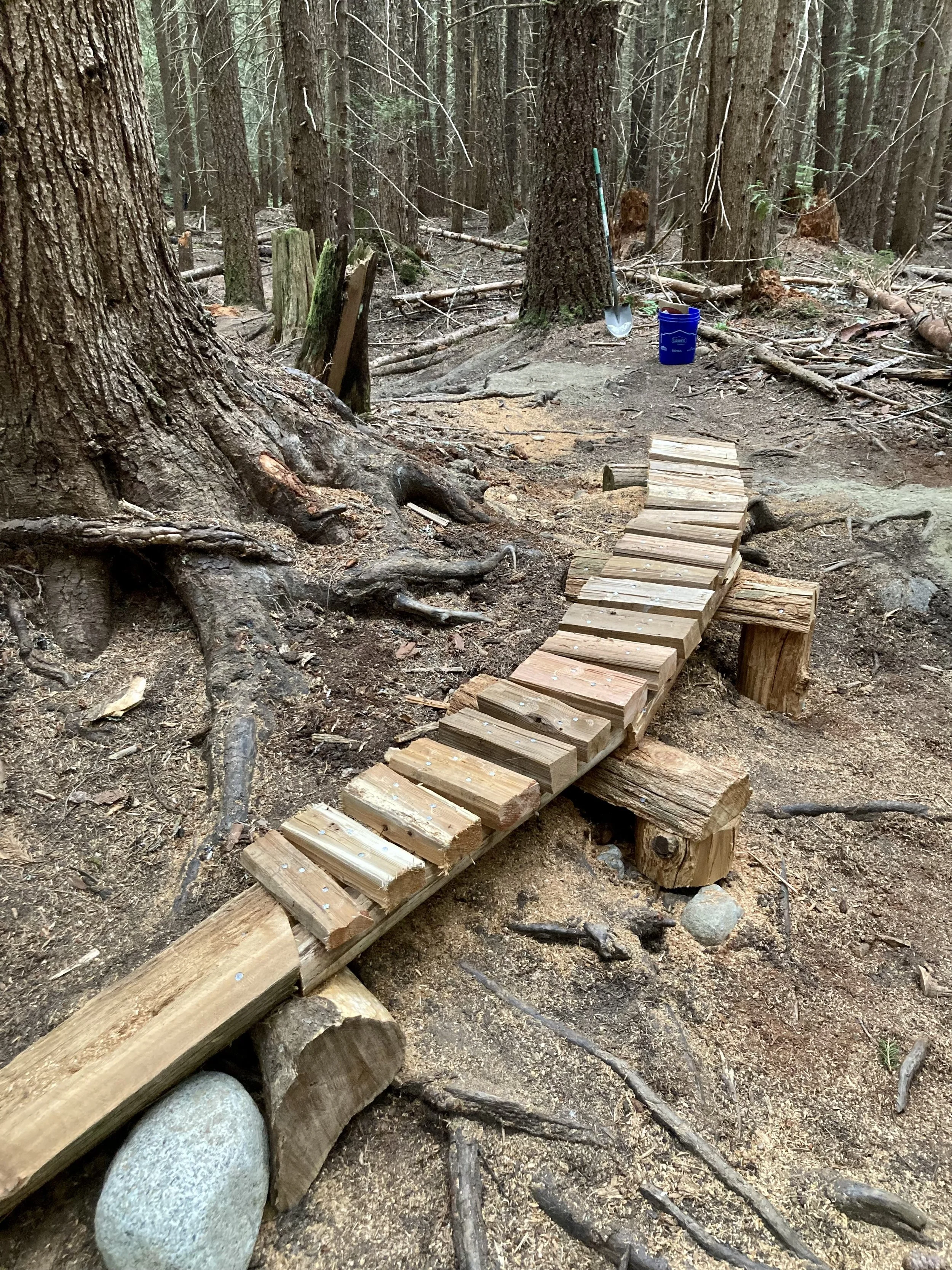 It has been satisfying to work on A River Runs Through It for the last few weeks. We managed to replace a few more expired features and smooth out some of the flow sucking eroded root sections. “Mike’s Garage has collapsed!” This iconic feature dared riders through a large Cedar stump before a series of gap step downs. Modern handlebars no longer fit through the arch… I thought, this is our chance to renovate it! Upon lifting the collapsed portion of the stump, I was stormed by Wasps! I suspect a bear must have vandalized the feature to snack on some spicy critters. We’ll leave that alone for a while! In other Wasp related stories, Jacob and Braden had to escape 2 different spots while trying to install sign posts. Braden once again lost at sting-roulette! (that’s his hand in the photos). Be careful at the bottom of Between the Creeks and, ride fast through the last 100m of Wizard Burial Ground: Those Wasps confiscated my chainsaw! It was a screenplay-worthy horror-comedy but I managed to clear the fallen tree.