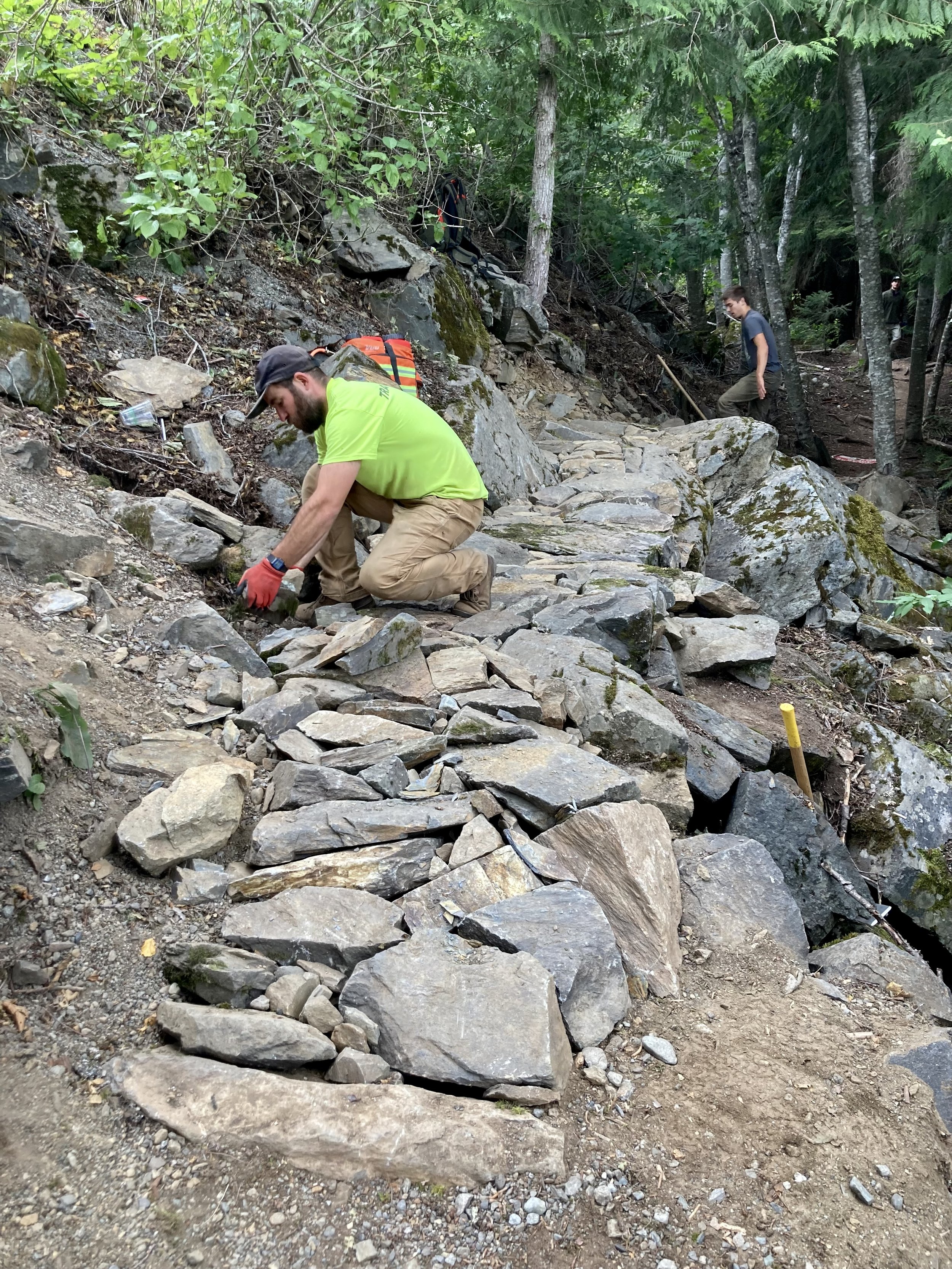 Meanwhile, back at A River Runs Through It, the entire team performed some rockwork as we moved closer to Rainbow park. Given the dry conditions, filling holes with dust would have been futile, so we were presented with a good opportunity to perfect the crew’s dry-lock armouring skills. “Rock Tetris” requires creativity, attention to detail and patience… from the crew and from passing riders. “Watch your step!” There was no easy way through our worksite along the narrow ledge squeezed between the road and the swamp. A Wasp’s nest nearby added extra thrill to our hike-a-bike obstacle course but everyone that came through was stoked about the fresh work. I’m always delighted to see so many mid-week “customers” and A River Runs Through It has set the bar for high ridership this season. The South segment now meets the Blue rating standard and the trail crew will return later to complete some more optional advanced skill features.