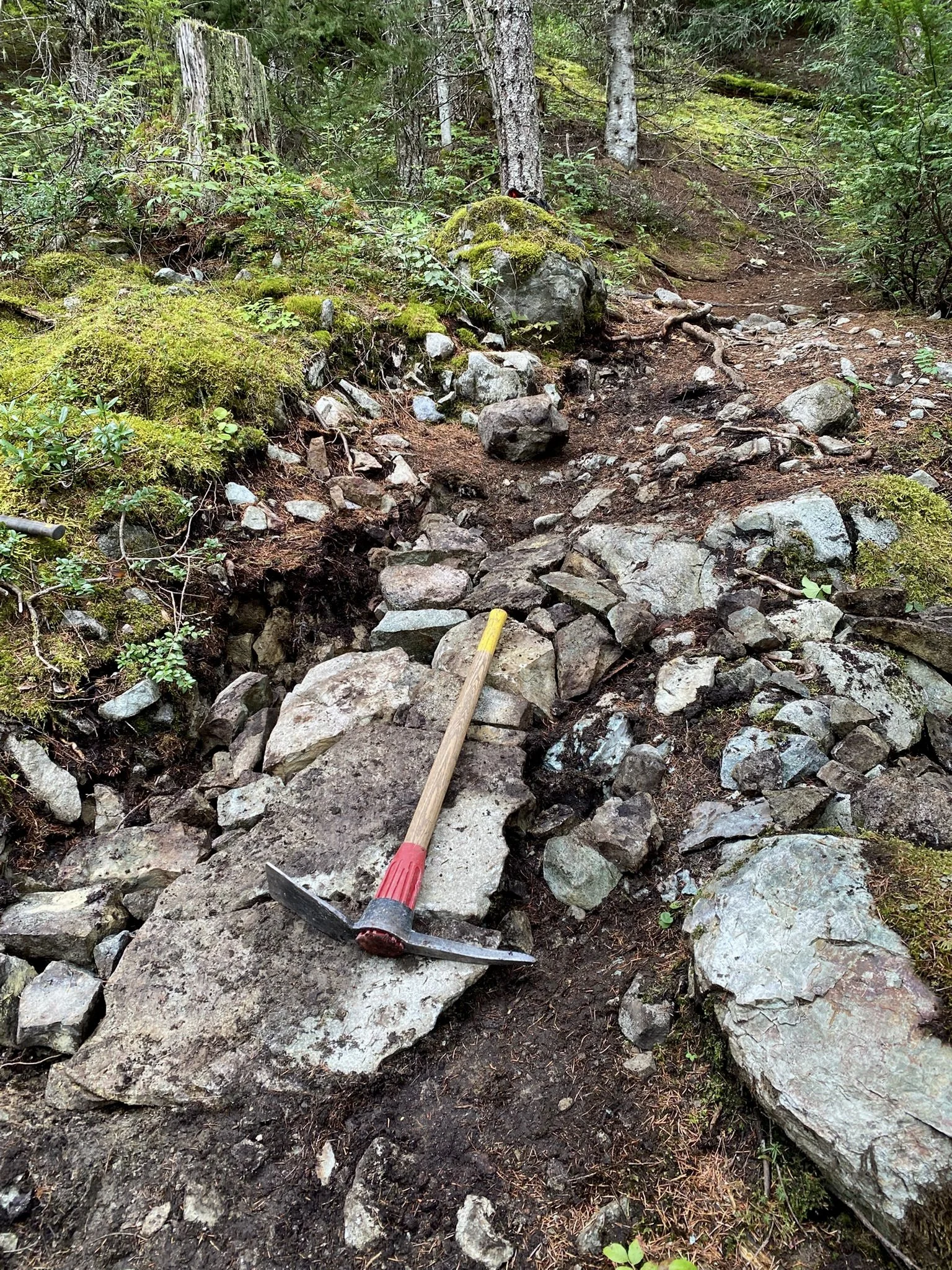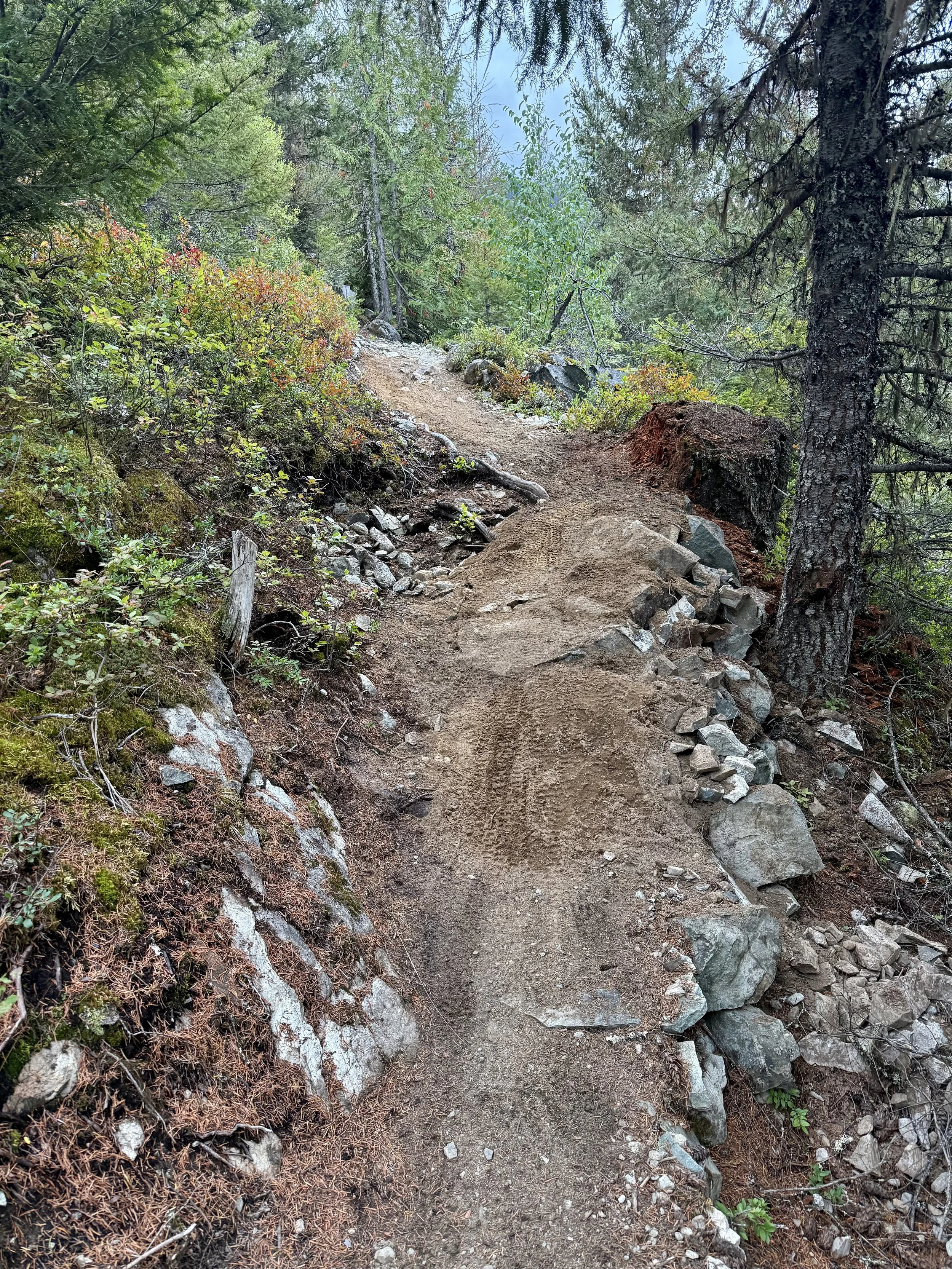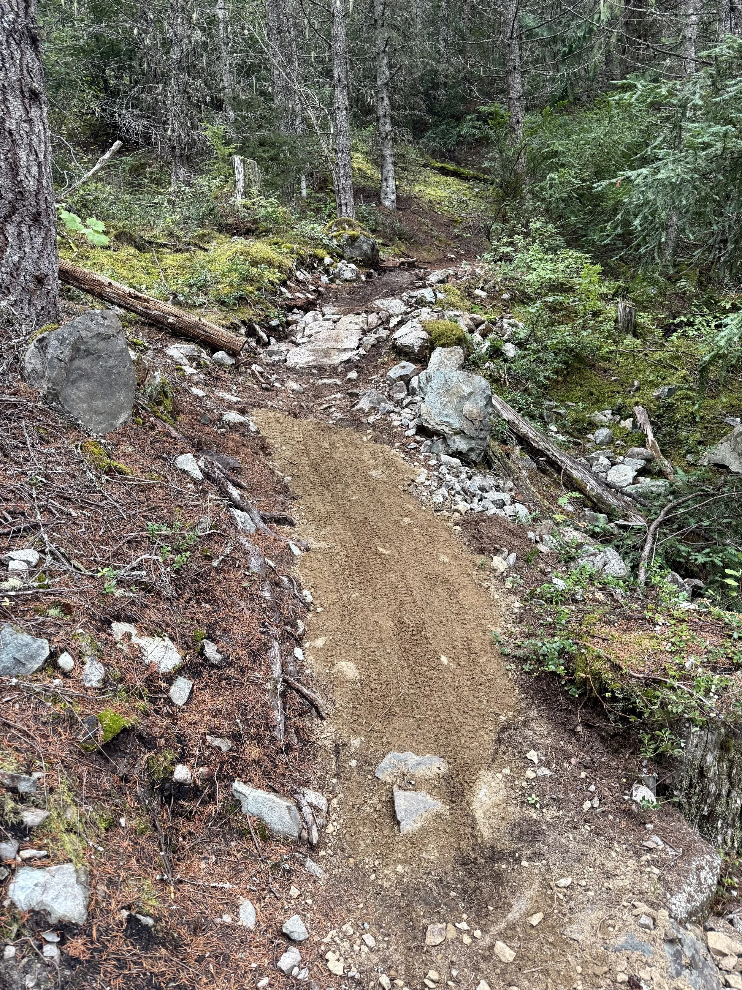 Our tools have embarked on another “long” trip this week: check out this popular route. Although our ultimate mission is to renovate the (Comfortably Numb) Land of Confusion segment which leads to Bring on the Weekend, we have a hard time ignoring spot repairs along the way. We didn’t get very far before we encountered some projects scheduled for 2026 that needed to bump up the priority queue. First, we added a railing to the high climbing bridge near the start of Yummy Numby 2.0 (the original line was on the golf cart track). That slippery bridge’s fall hazard was substantial so we “played carpenter” to retro-fit appropriate railings. Climbing further, Yummy Numby was showing its age… as the trail erodes over time due to weather/tires/etc., rocks and roots tend to stand “taller.” This makes the tread generally more challenging. Most riders, regardless of ability, naturally navigate their bikes to avoid the momentum-killing taller obstacles. When a critical mass of riders dodges the same obstacle, it leads to what we call “trail creep” (widening). We sometimes “choke” the trail to block the creepers or try to make the original line more inviting again (if appropriate). We armoured plenty of root steps on our way up Yummy Numby this week, with a few more projects to go before pushing the tools towards the Golden Door. I’m looking forward to testing this refreshed climb!