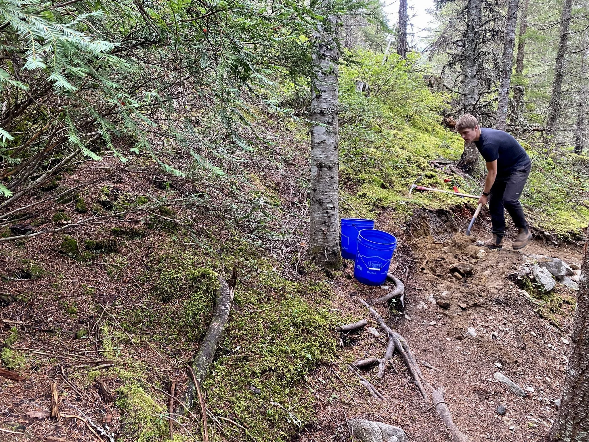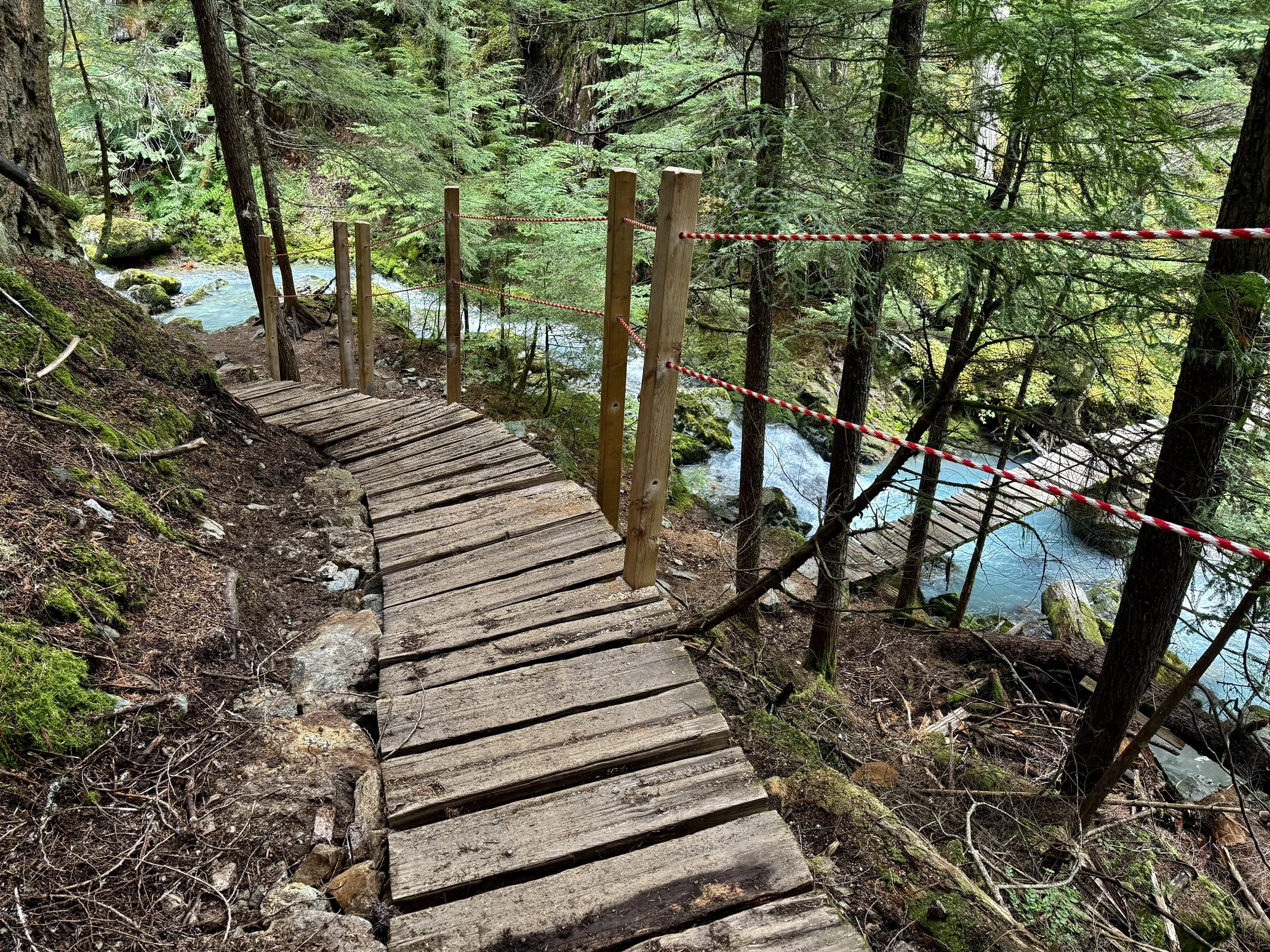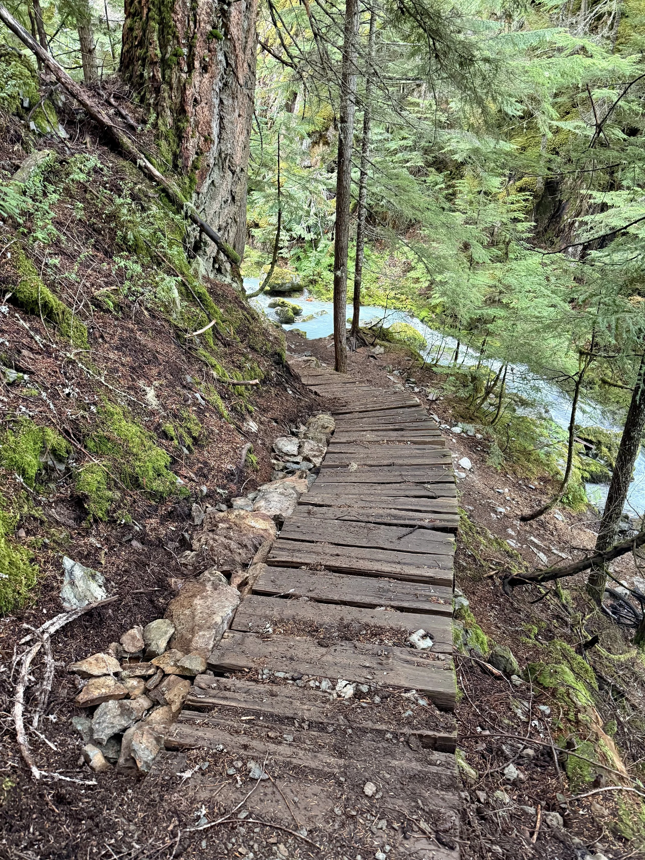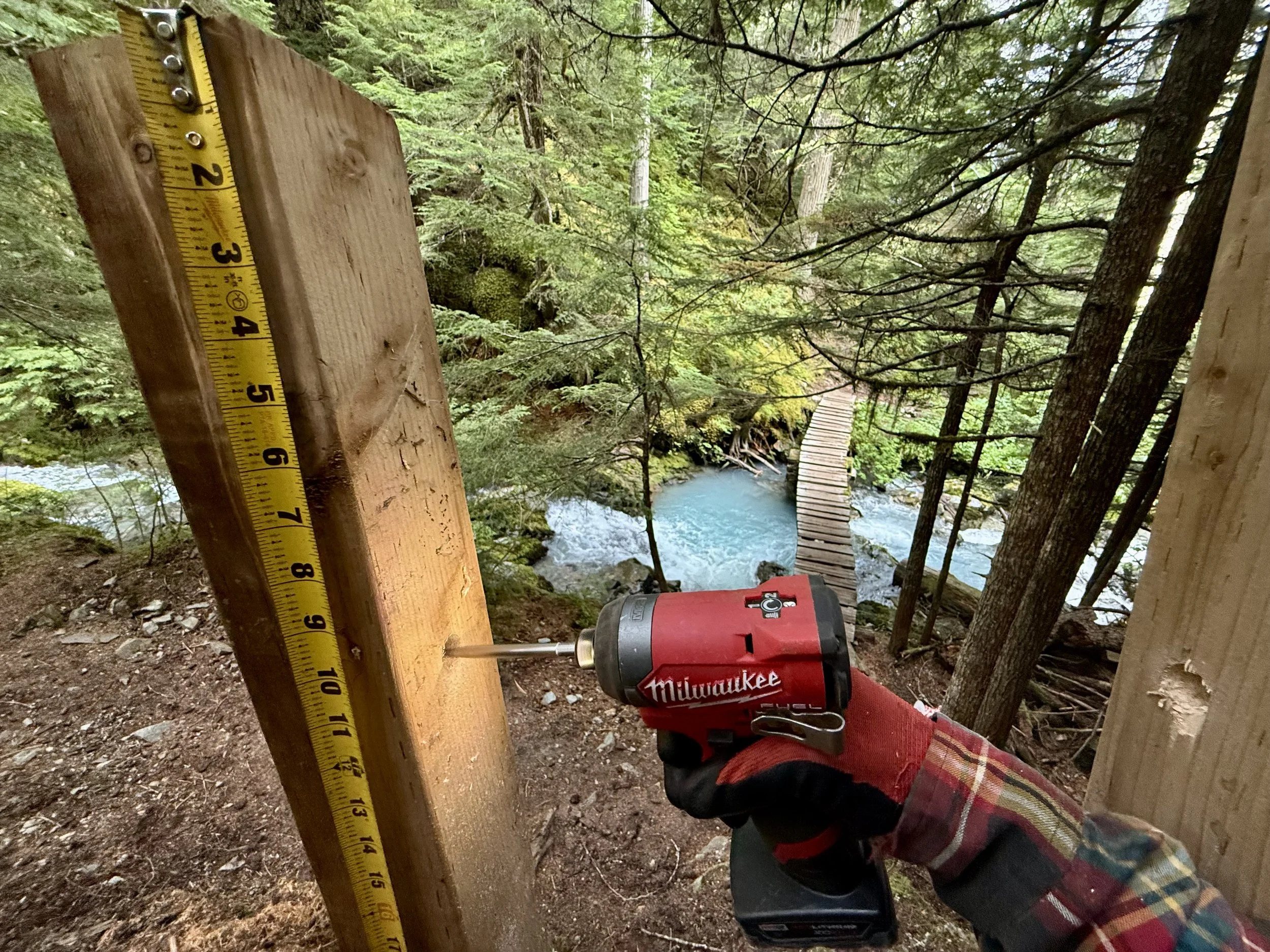 Our tools have embarked on another “long” trip this week: check out this popular route. Although our ultimate mission is to renovate the (Comfortably Numb) Land of Confusion segment which leads to Bring on the Weekend, we have a hard time ignoring spot repairs along the way. We didn’t get very far before we encountered some projects scheduled for 2026 that needed to bump up the priority queue. First, we added a railing to the high climbing bridge near the start of Yummy Numby 2.0 (the original line was on the golf cart track). That slippery bridge’s fall hazard was substantial so we “played carpenter” to retro-fit appropriate railings. Climbing further, Yummy Numby was showing its age… as the trail erodes over time due to weather/tires/etc., rocks and roots tend to stand “taller.” This makes the tread generally more challenging. Most riders, regardless of ability, naturally navigate their bikes to avoid the momentum-killing taller obstacles. When a critical mass of riders dodges the same obstacle, it leads to what we call “trail creep” (widening). We sometimes “choke” the trail to block the creepers or try to make the original line more inviting again (if appropriate). We armoured plenty of root steps on our way up Yummy Numby this week, with a few more projects to go before pushing the tools towards the Golden Door. I’m looking forward to testing this refreshed climb!