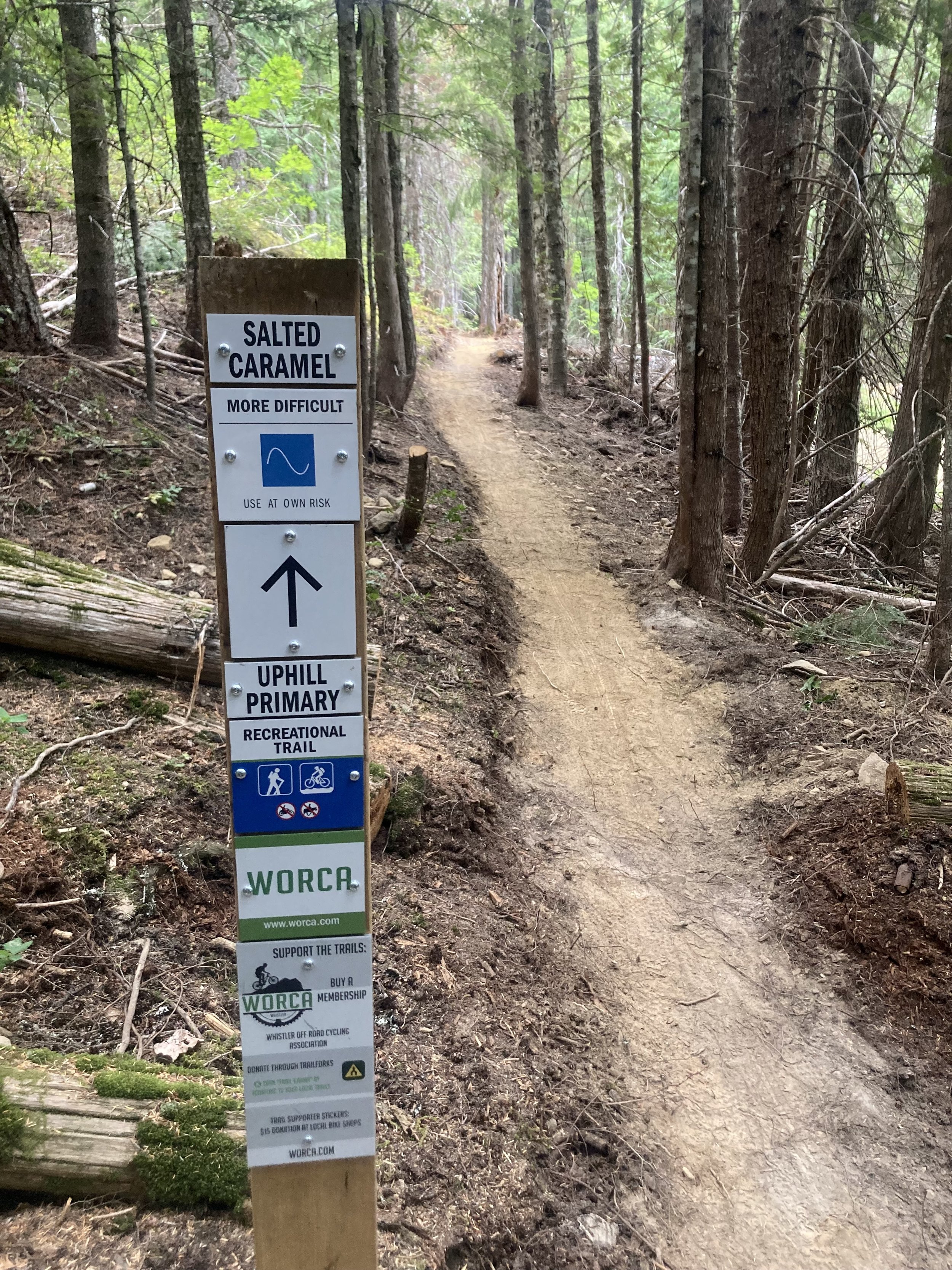 Earlier this spring, WORCA announced that we are upgrading the Far Out / Flashback loop to adaptive-MTB standard. Tuesday night volunteers bought-in and delivered a supersized (1.2m wide) ribbon of flowy goodness. While standards on paper are easy to follow (like a recipe), I know that what matters most is the quality of the experience. It so happens that Hannah and Adria from Whistler Adaptive reached out, curious about this project. I invited them to have a test run on the loop… to see how much upgrading the Far Out climb will need and to find out what they think of the finished sections of Flashback. Adria was riding a three wheeled bike that spanned 1m wide and slightly longer wheelbase than a 2 wheeled bike. The unchanged trail sections presented obvious width challenges but also some obstacles like jumps and drops were too “sharp” or didn’t span across both front wheels, threatening to flip the 3-wheeled rig. Once we rolled into Flashback 3 and 4 Adria was stoked: “OMG that was sooo fun! You can see where the trail will take you, relax and start to play with the flow!” (The section of Flashback 1 after the “swamp” was also a highlight). This was a great learning experience for me, I have a better understanding of how adaptive bikes navigate. This will help guide the trail’s design moving forward. High five! to everyone that has helped so far on this exciting project. We’re lining up another test ride with adaptive competitors during Crankworx…
