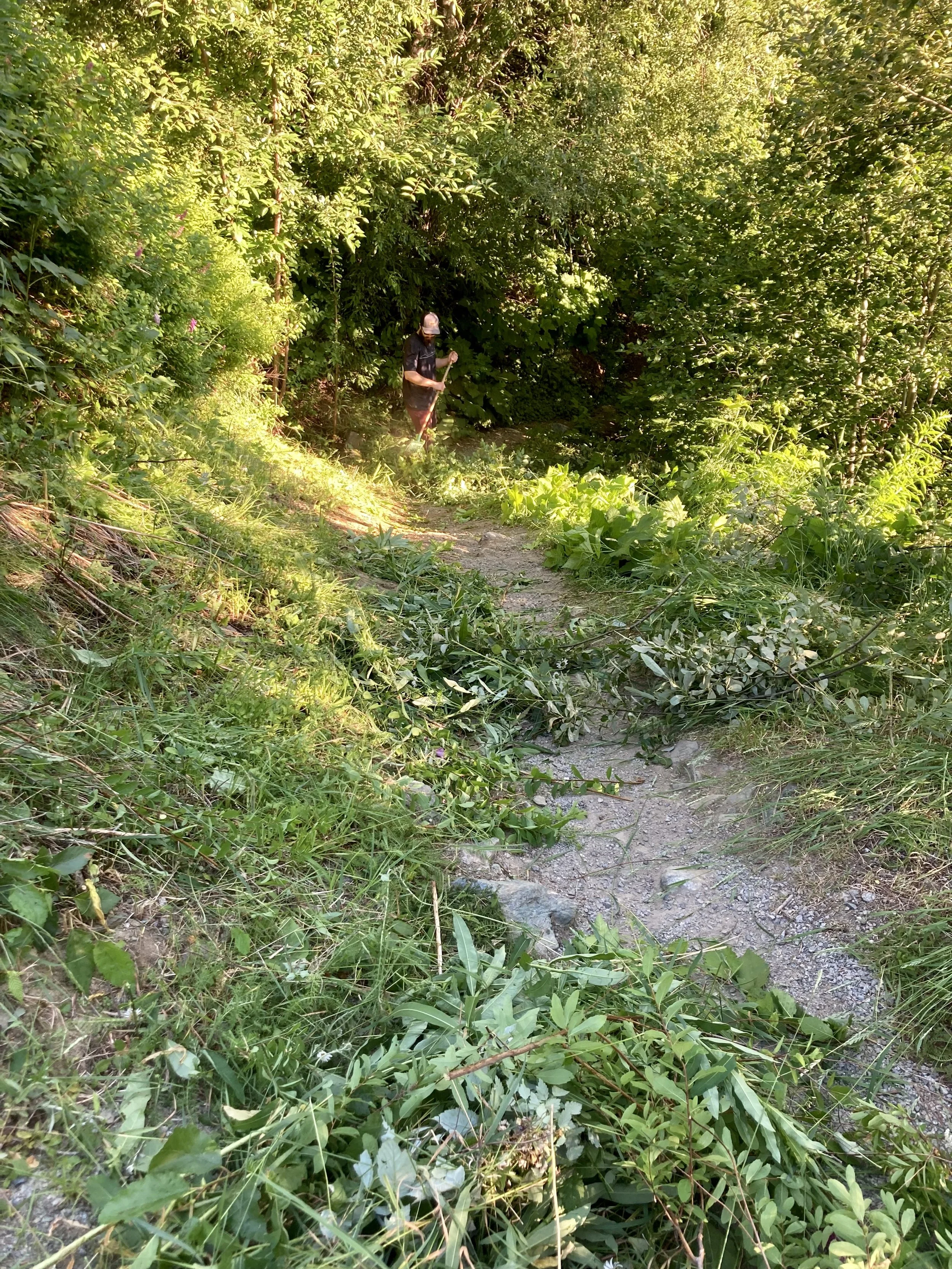 “No one will notice the dust on the baseboards!” Regardless, we did everything we could: Put up sign placards, de-branched the eye pokers, brush cut it all and even managed to finally break off that pointy rock. I’m pretty sure we found most of the tools and stashed leftover decking. I also filled my pockets with pink and blue flagging tape that will soon get laid down in another part of town…