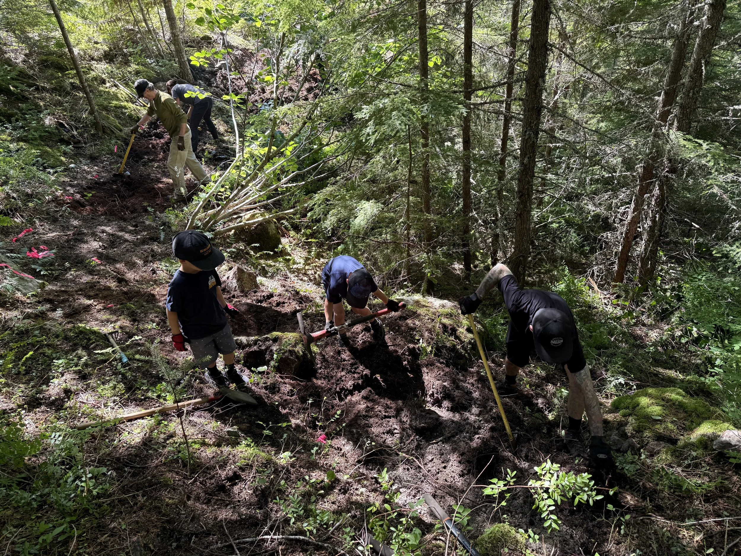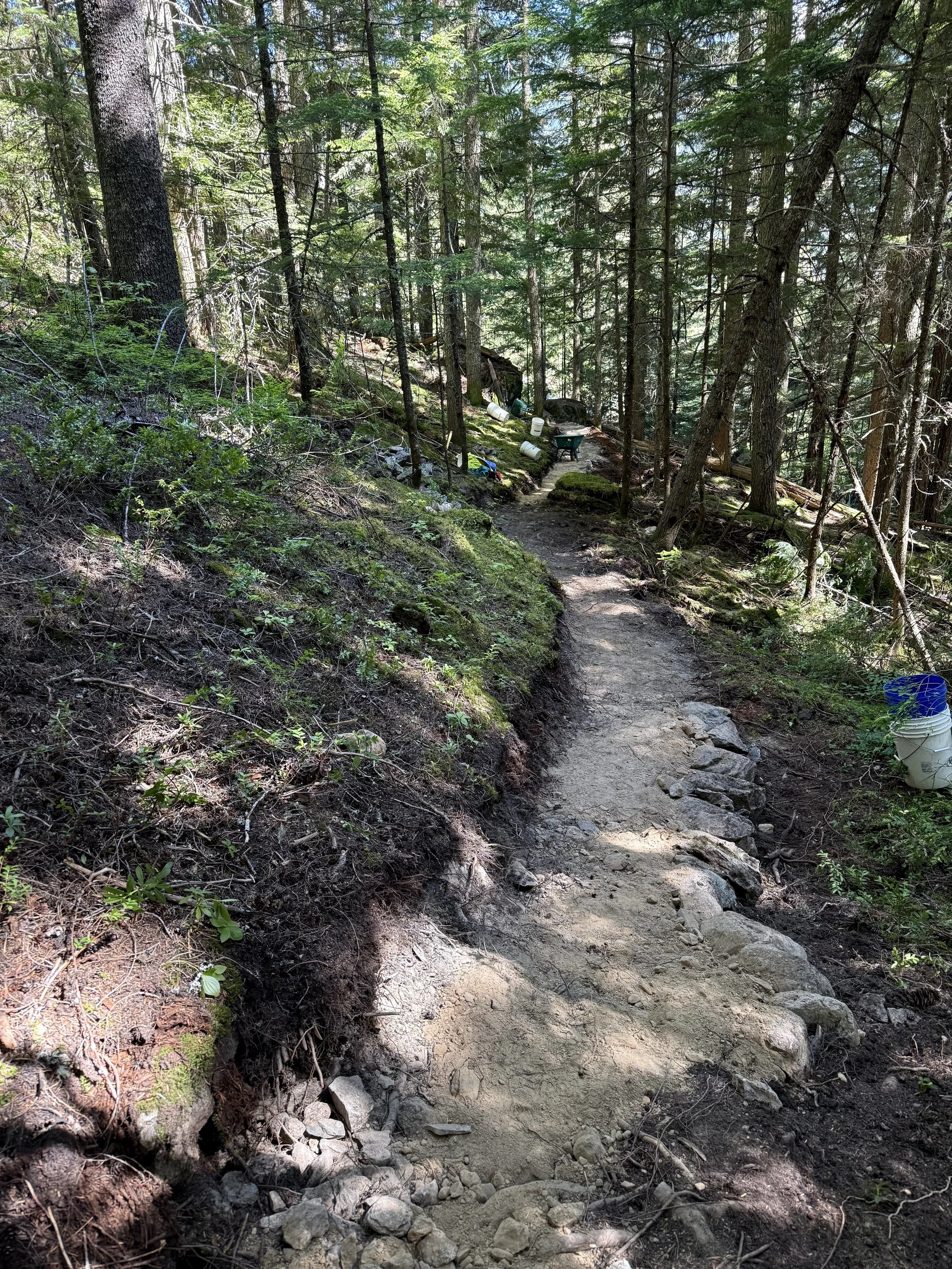 It was a short week at the trail factory thanks to Canada Day but the crew rose to the occasion when we were presented with an opportunity to work with @rocdoc (Ken Melamed) on a particularly complex problem. It was just a blown out berm near the bottom of Bring on the Weekend, however, the same glacier that shaped this particularly sweet bedrock slab had also stripped the nearby landscape clean of any usable material (dirt or rocks). Ken had a plan. He had located some rocks “nearby” that needed to be broken down to movable size and he had set-up a rope line to help maneuver the rocks into place. It’s always a pleasure to spend time with a master of his craft and this project was a “doozie”. Thanks Ken!
