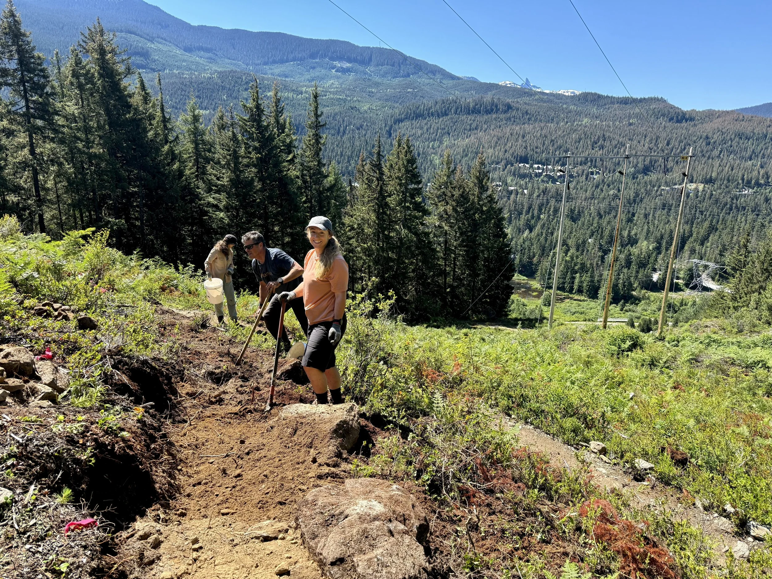 I always love a bit of a rush first thing in the morning… Last Tuesday’s Trail Night blasted through everything we had laid out so I needed to get some corridor cut and flagging in the ground ASAP! We focused on the lower end of the blue Danimal South bypass. For a shorter commute and to avoid sucking curious riders in to check out a project with no exit. The crew pulled stumps as I frantically planted the short pink ribbons. All of the prep work came together just as the volunteers arrived. It was already furiously hot but a few volunteers were keen to work on their tans… digging under the powerlines in full sun. Appropriately, Evolution, who sponsored this event, had brought some branded shades for the volunteers! I opted for the cooler forested benching but there was a hefty price to pay for shade: countless roots entangled huge rocks making the work hard and complicated. In the end, everyone was satisfied with Sarah’s chili with a side of Coast Mountain Brewing’s best seasonal suds. We managed to put a dent in this project but it’ll sit idle until Crankworx… stay tuned for details on when you can join in on the digging fun.