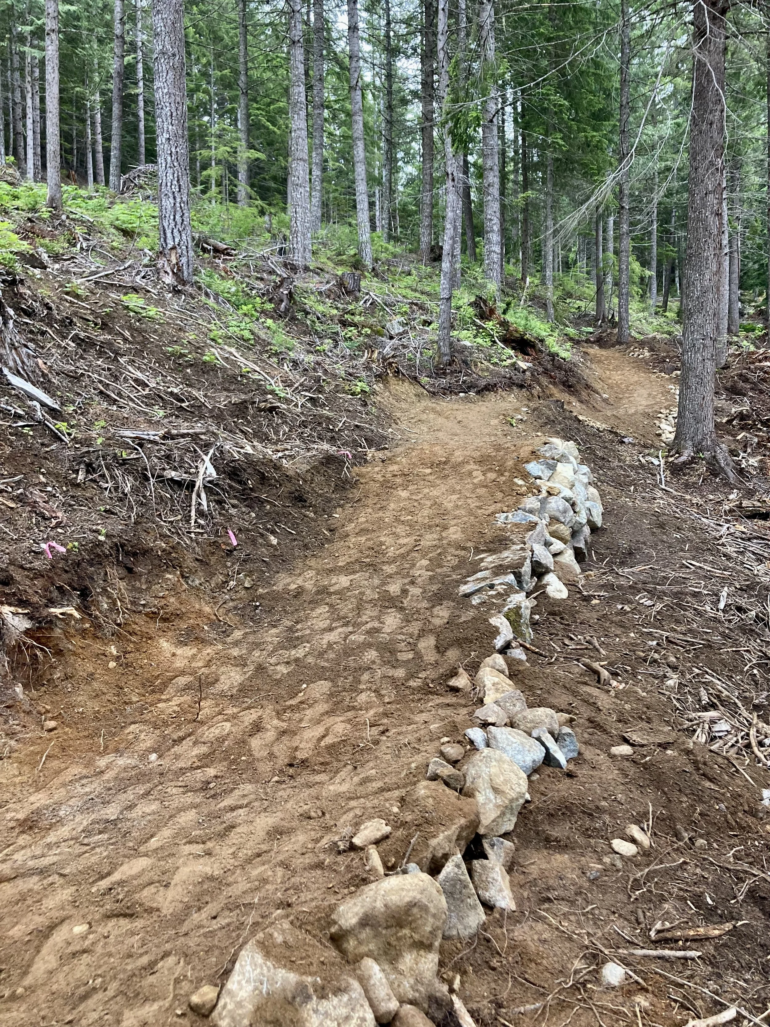 A Rockwork Orange is the first trail I’ve built. In 2010, It became my new obsessive outlet after retiring from competitive snowboarding. I spent 2 summers exploring the landscape, precisely cutting moss and scrubbing slabs clean, becoming familiar with every tree, rock and squirrel in the area while crafting the experience. It was my debut album, I wanted it to be perfect! It even took me 4 years to make the sign. No other trail feels quite so precious to me. I still ride it a lot mostly to (re)test my skills but the views are also nice. Over the years I’ve noticed every bit of wear and tear: tire tracks on the moss, newly exposed roots, displaced rocks and even CUT TREES! …I miss the pristine strip of granite that would guide your front wheel through the impossibly tight turns and off-camber slabs. While some of the trail has gotten more battered and challenging, I feel attached to the matured quirky difficulty of the trail.
