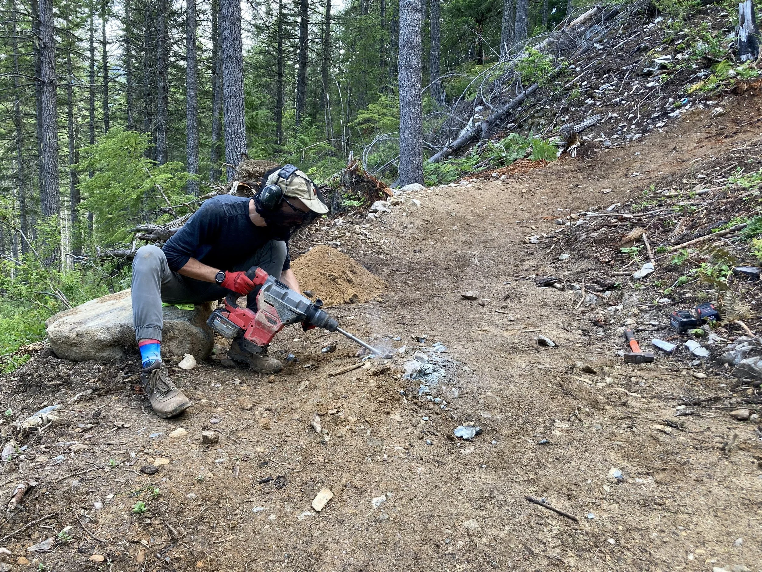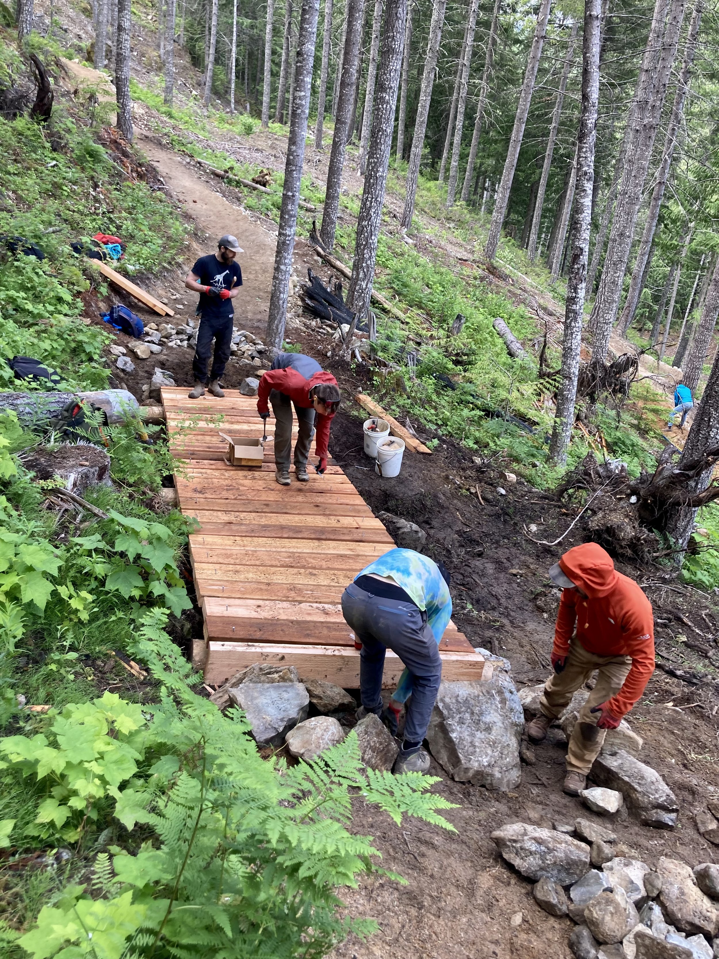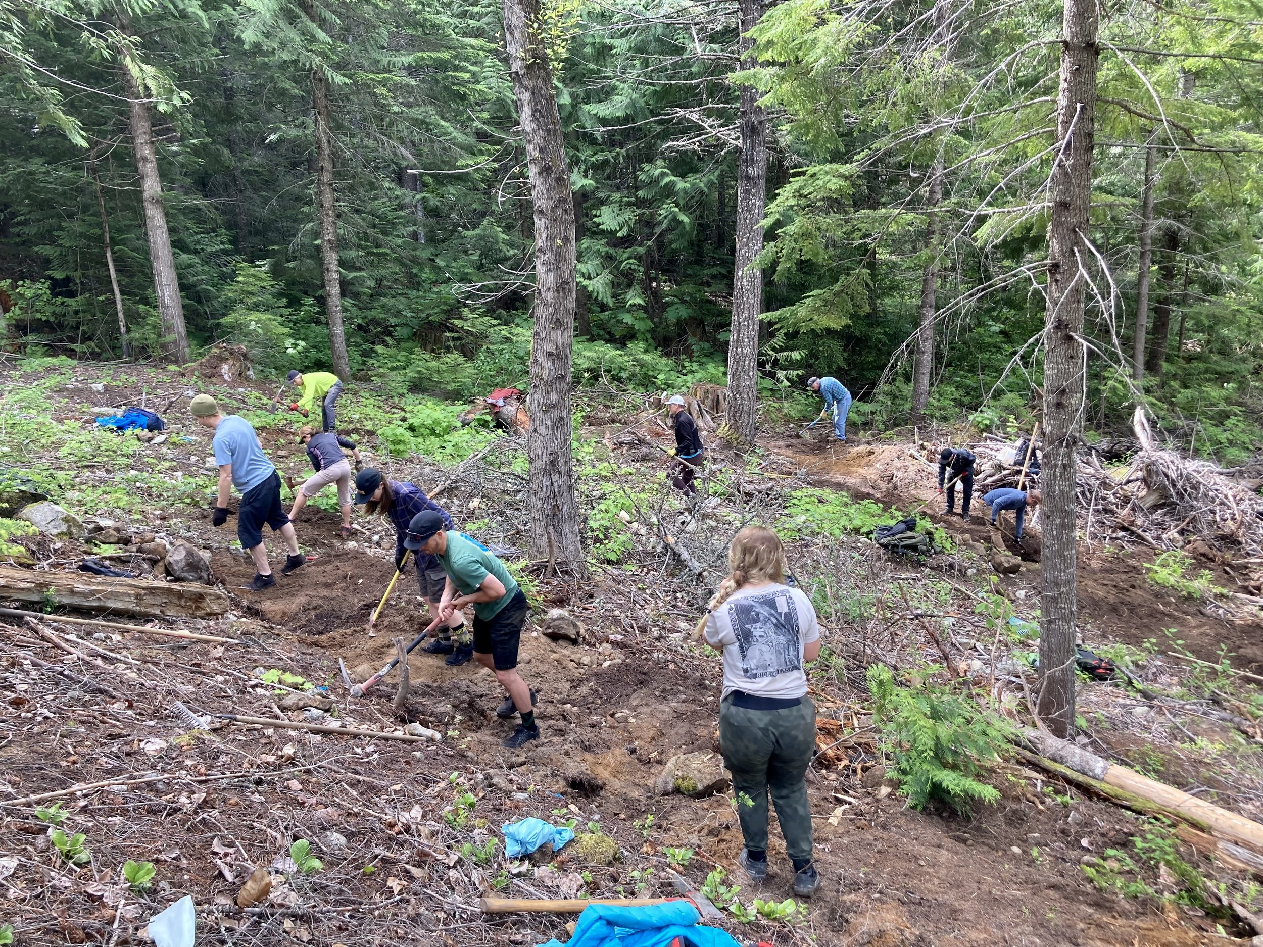After crossing T’s and dotting some I’s on Flashback this week (ONGOING) the crew was dispatched to far, far, far away trails just in time for the long weekend. We tackled one of the most challenging routes loaded with heavy packs, Zanarchy to Gargamel, and everyone made it out unscathed! And, at the other end of the experience spectrum, one of the most raw and remote routes, the Jane Lakes loop. Plenty of blood was donated there… to mosquitoes. While clearing deadfall was the main objective, we also concocted maintenance plans for those trails to be performed when the huckleberries are ripe!
