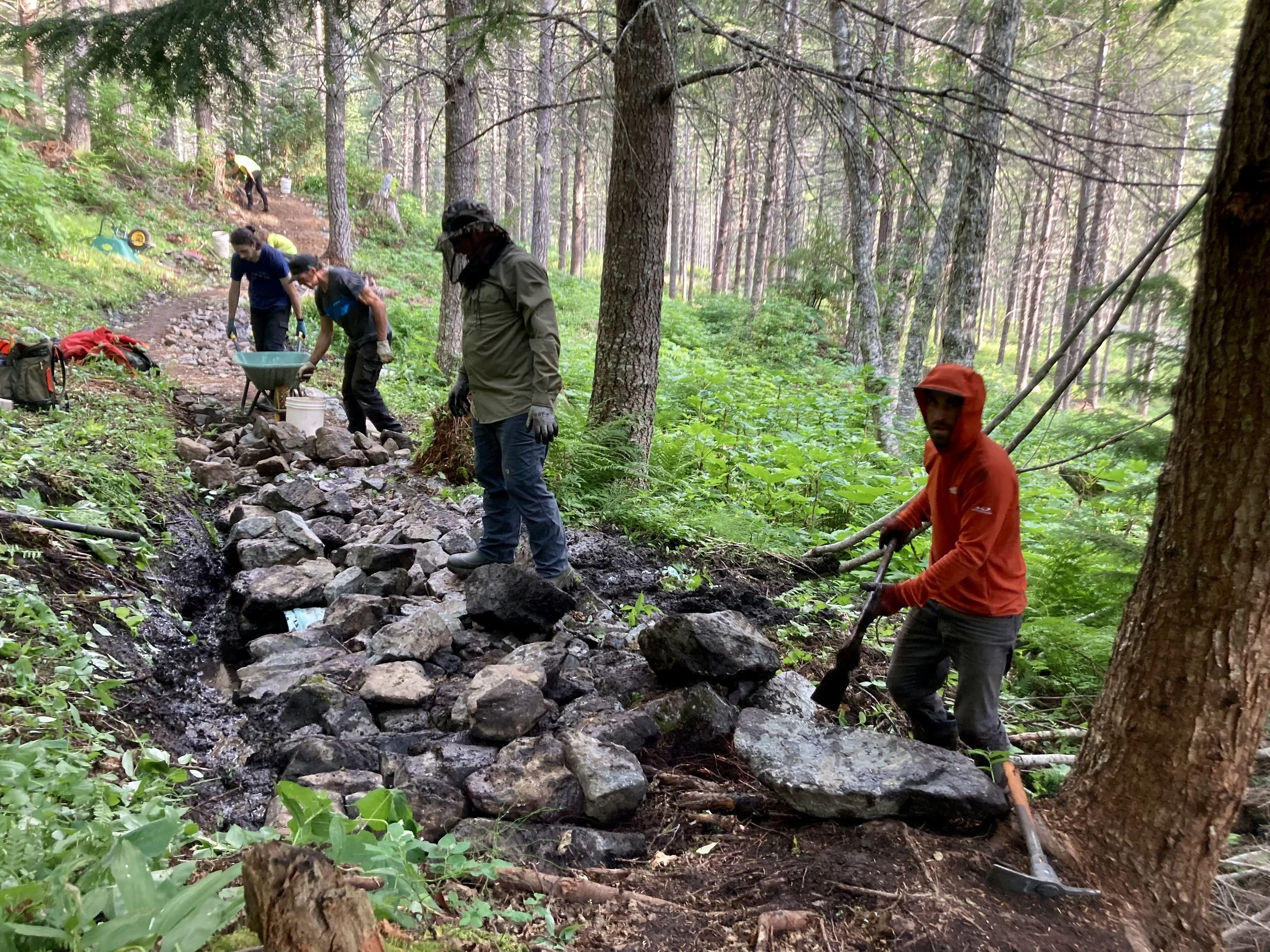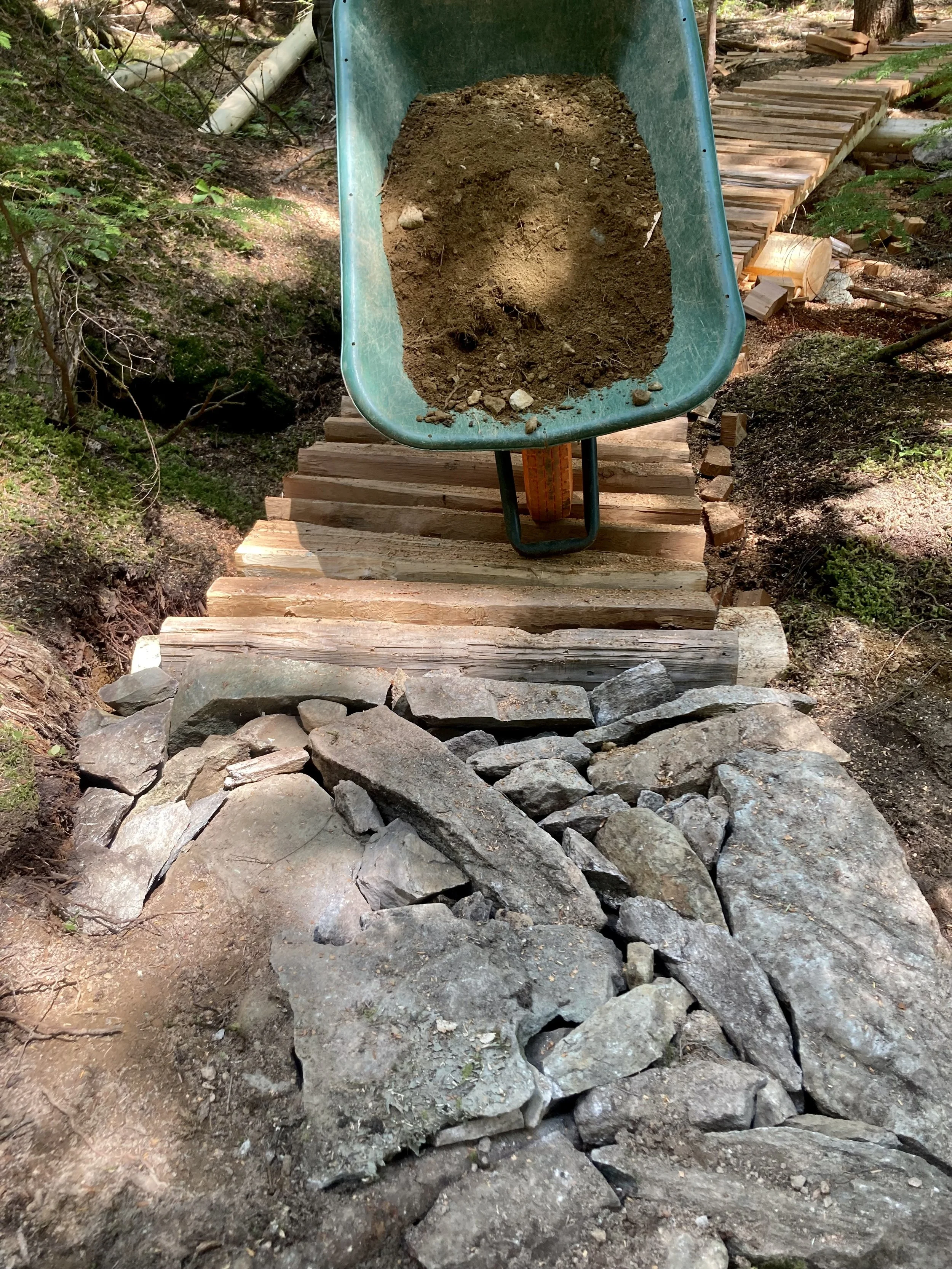 Curious birds, playful squirrels and caterpillars, oh my! Seasonal baby wildlife viewing has been great lately. It is rewarding to slow down and pay attention. Last week’s rain gave us the opportunity to perform some ground work on this highly anticipated dessert topping. The crew laid down some beautiful rockwork and foundations for the last bridge are taking shape.