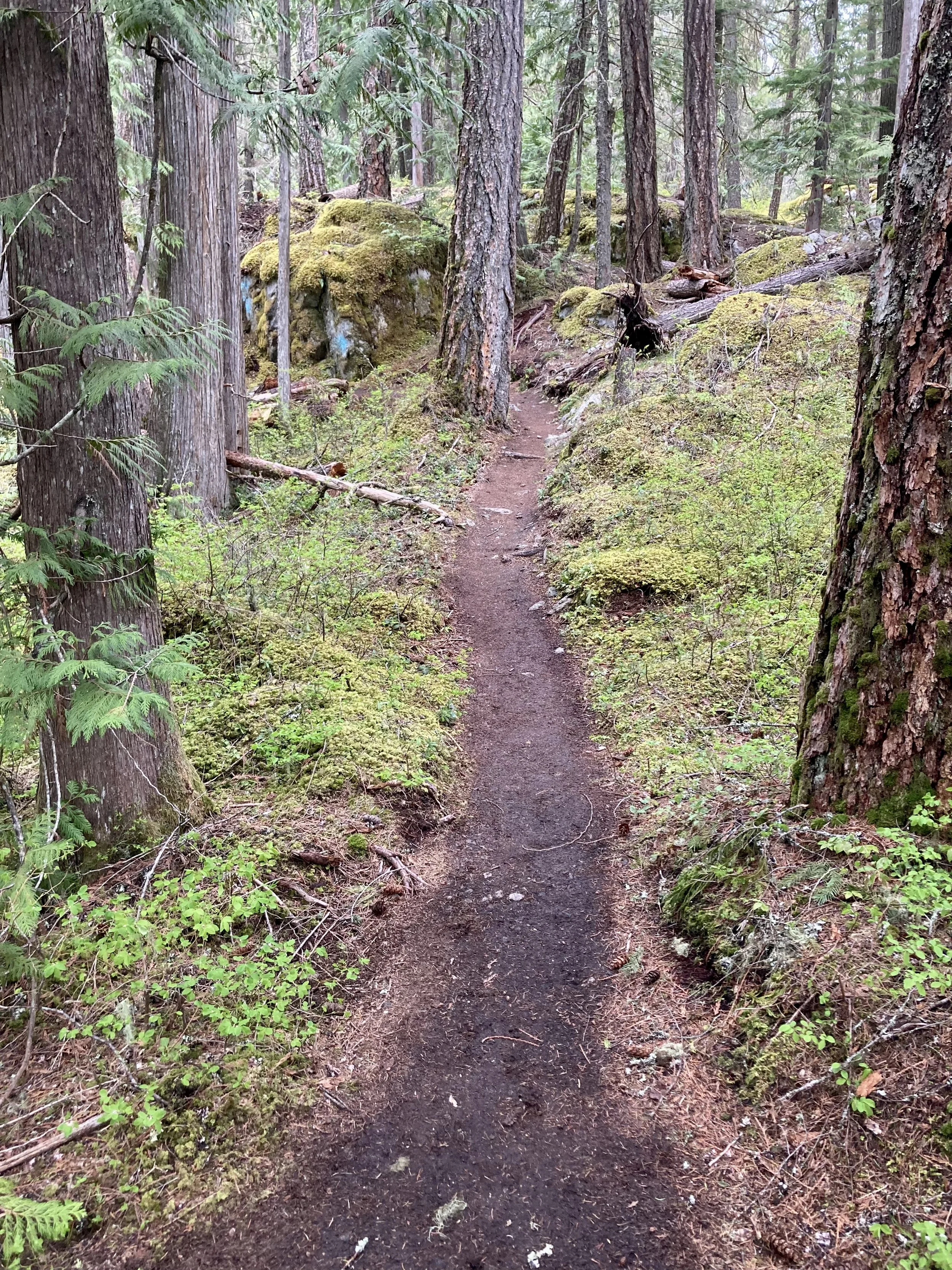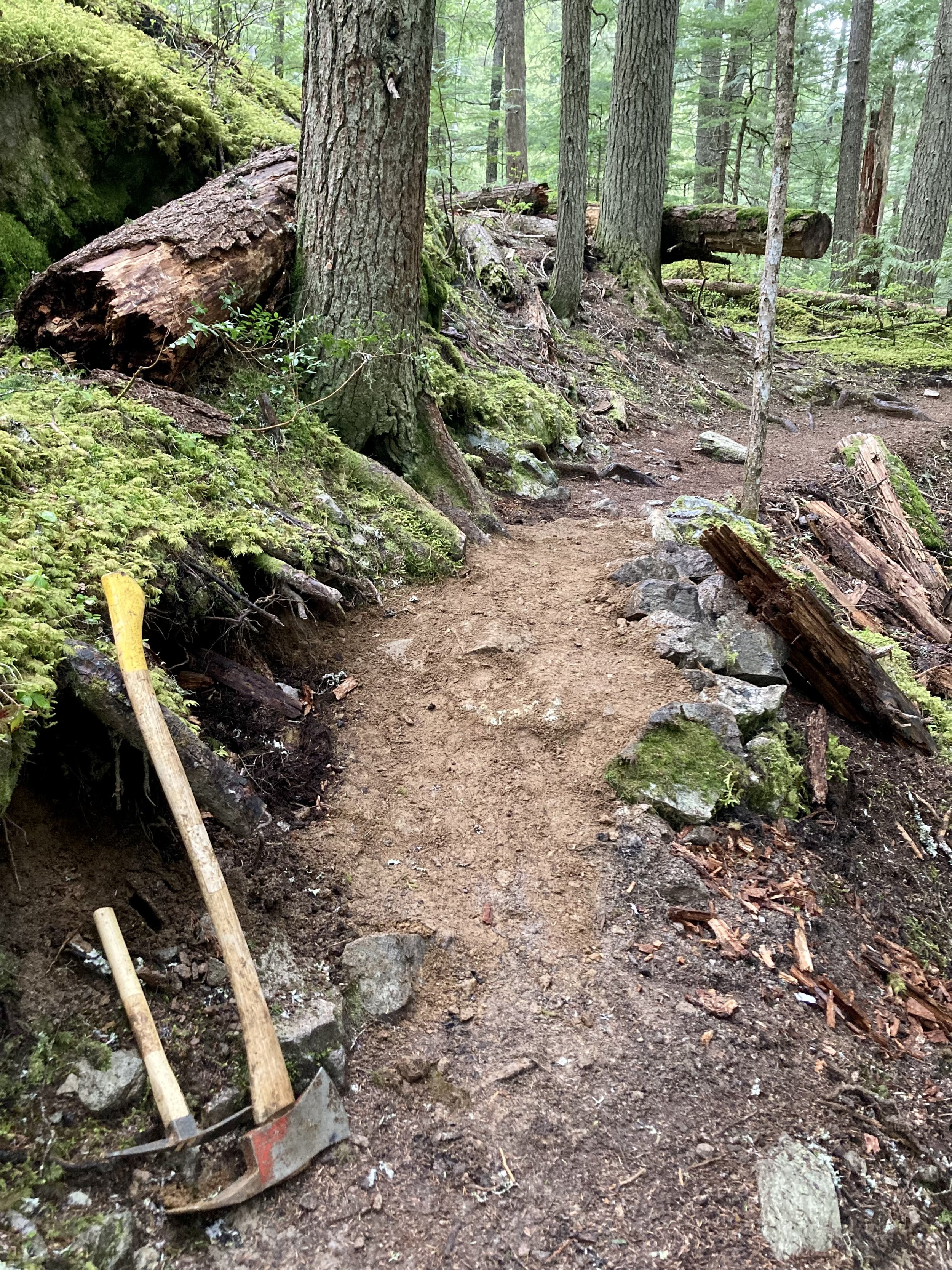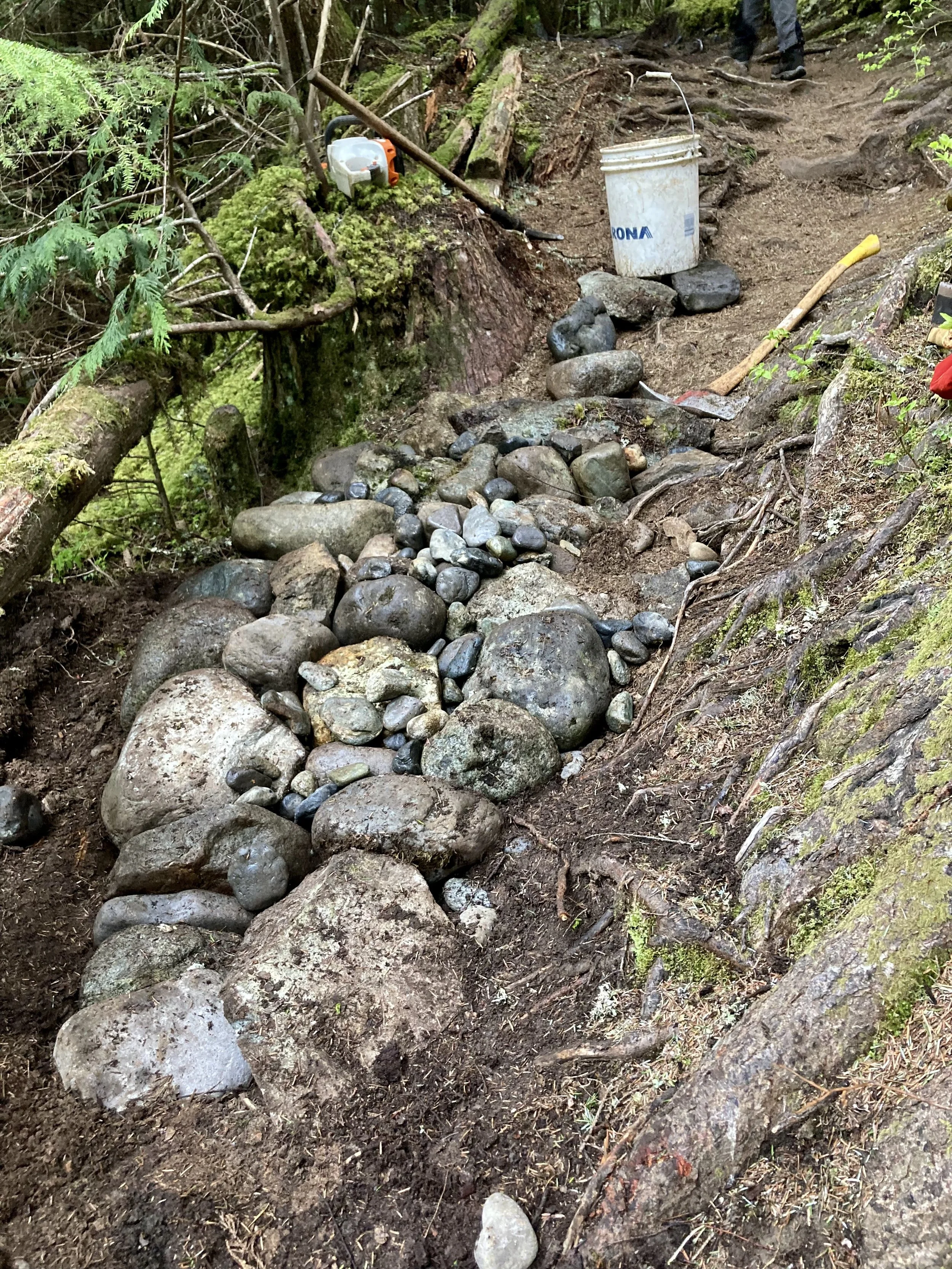 After finishing up our work around the Trainwreck site, we moved along the “Tour de Trash” repairing the impacts of both foot and tire traffic. Assessing the situation, I could see that the Trash trail has been widened and braided significantly. The evidence shows that mountain bikers are trying to avoid slippery off-camber bedrock and roots… probably to avoid falling into the river. The numerous braids and offshoot paths indicate that hikers want to go everywhere that might be of photographic interest, as directly as possible. Our mission was to make the original bike trail the most appealing line. We widened and supported the trail where it had eroded and narrowed. It was difficult to find angular rock near the river, so we were challenged to work with smooth rounded river rock. We also scraped a lot of the organic muck that was pushing Trainwreck bound hikers into the pristine moss.