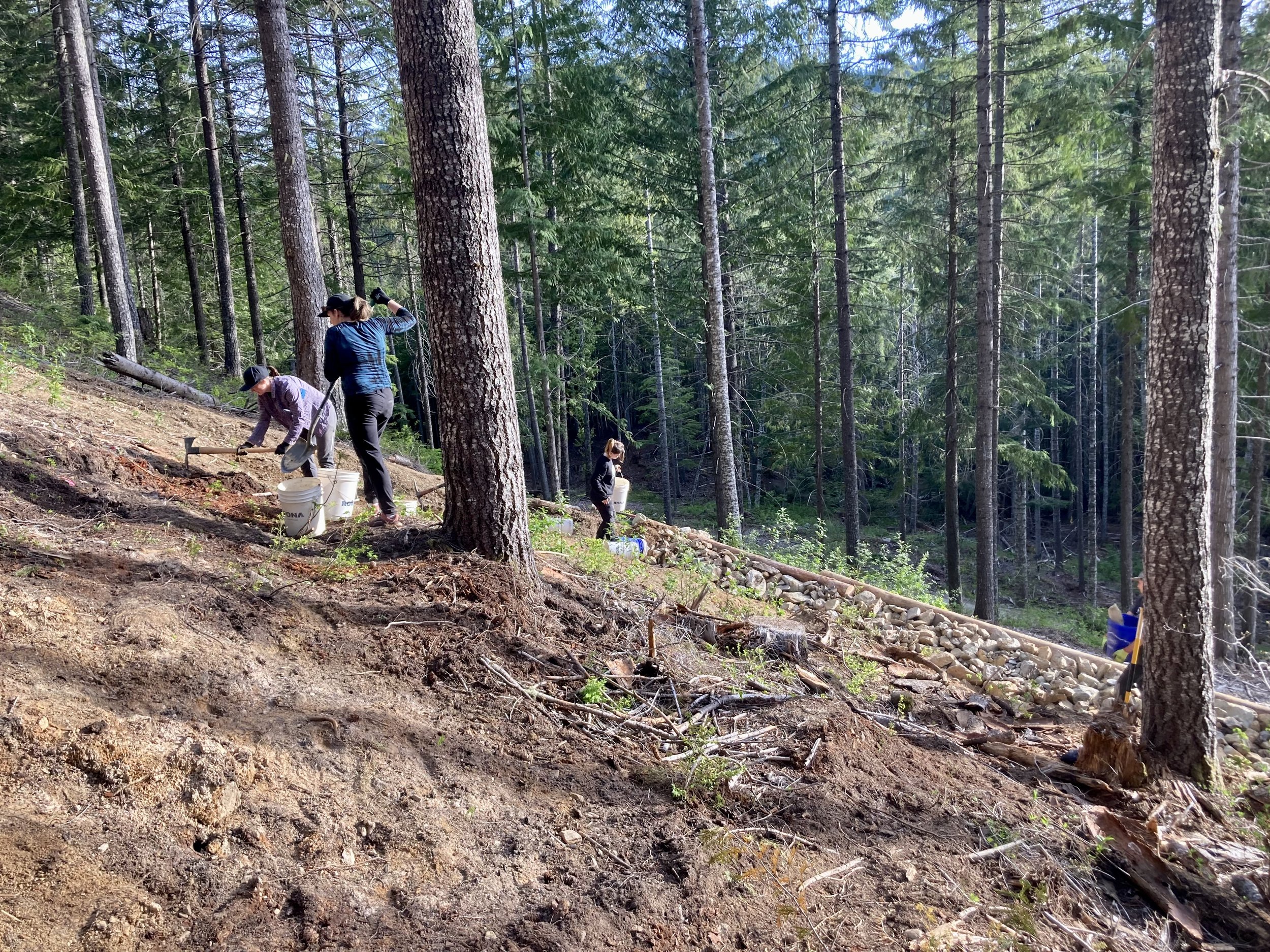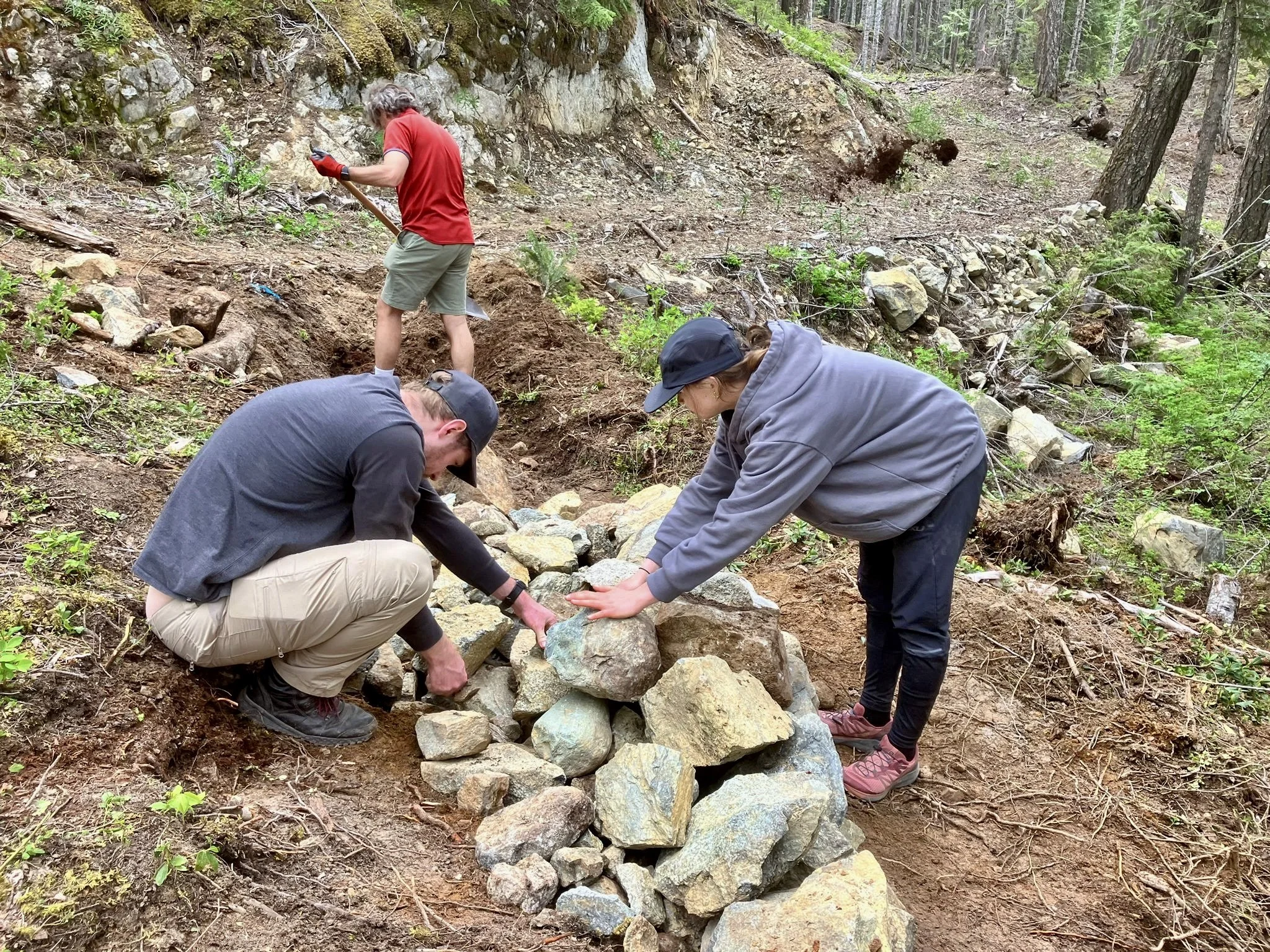This worksite has presented the students a smorgasbord of tasks to learn and practice from benching new trail to peeling Red Cedar bridge components … and feeding mosquitoes.
