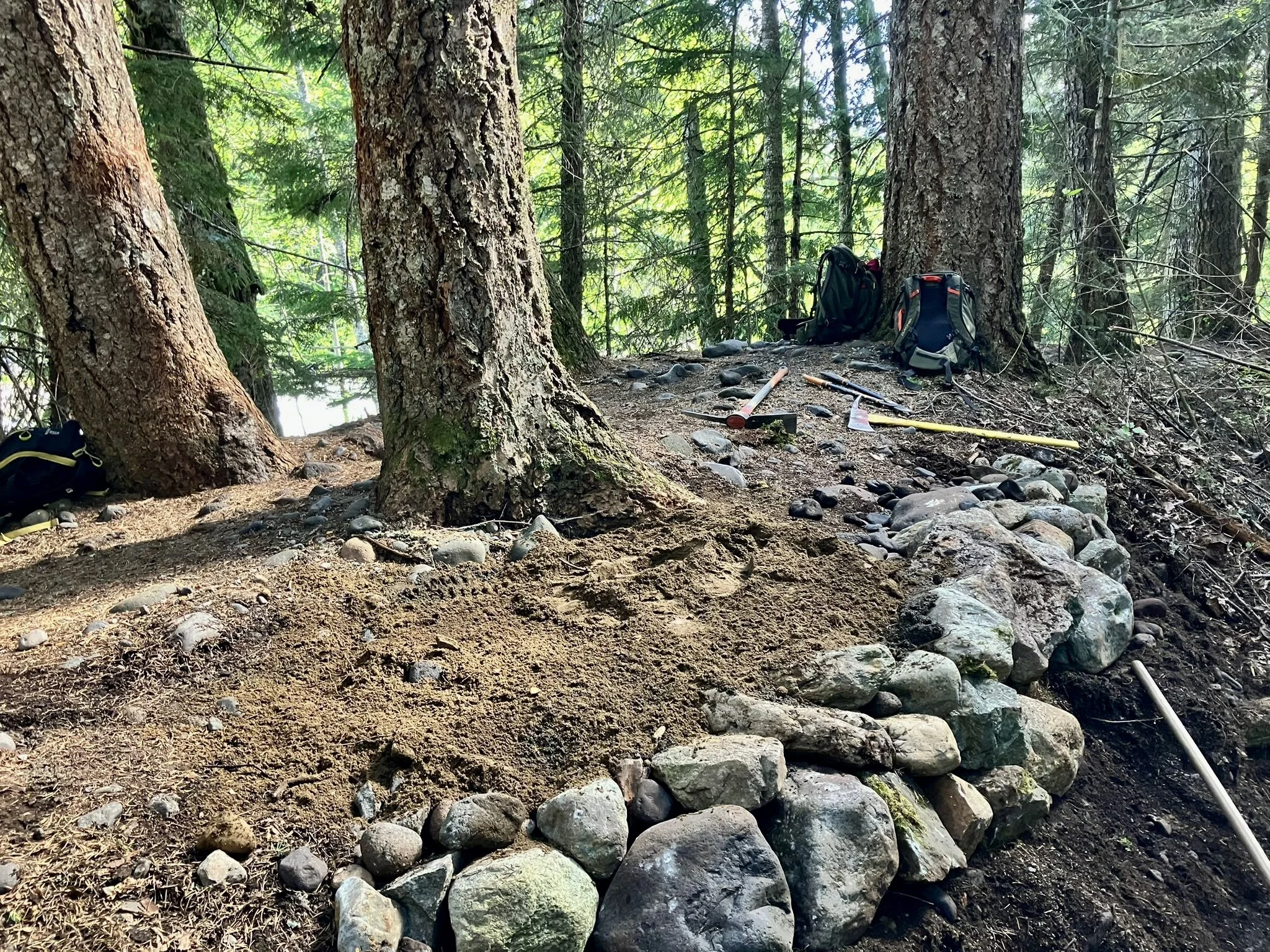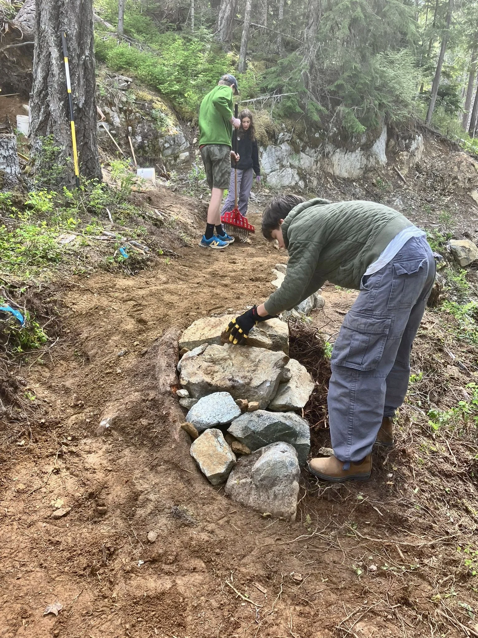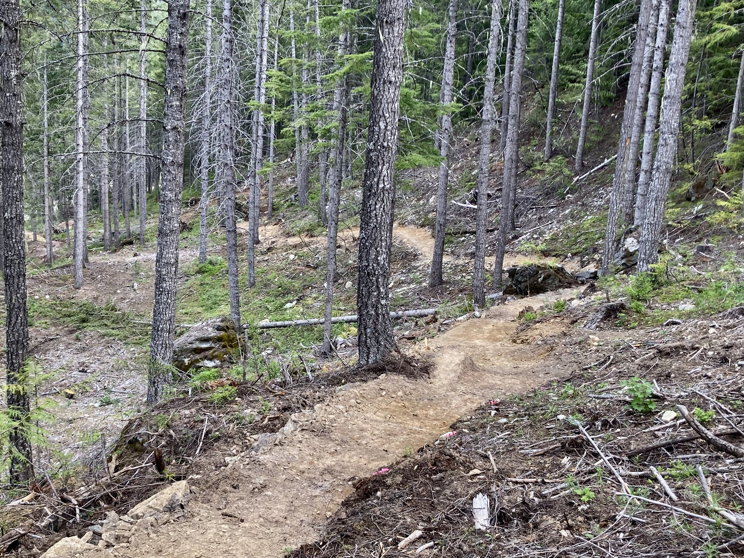 I must admit that we weren’t ready for that jolt of summer heat last weekend. It only made sense to keep working near the Cheakamus river’s natural air conditioning. Trash still had a few eroded spots needing attention and we returned some features to their 1999 tread level. One feature that can’t be returned to 1999 condition was the tight tree gap - the trees have fattened up and so have our handlebars. We armored the literal ride around to protect the tree’s roots (clearly the more ridden option now). We’ve got a few more tweaks planned for my most common afterwork ride that should get executed before this year’s tour de trash…