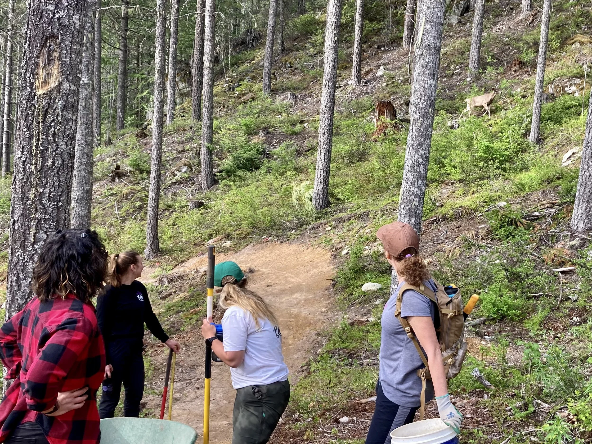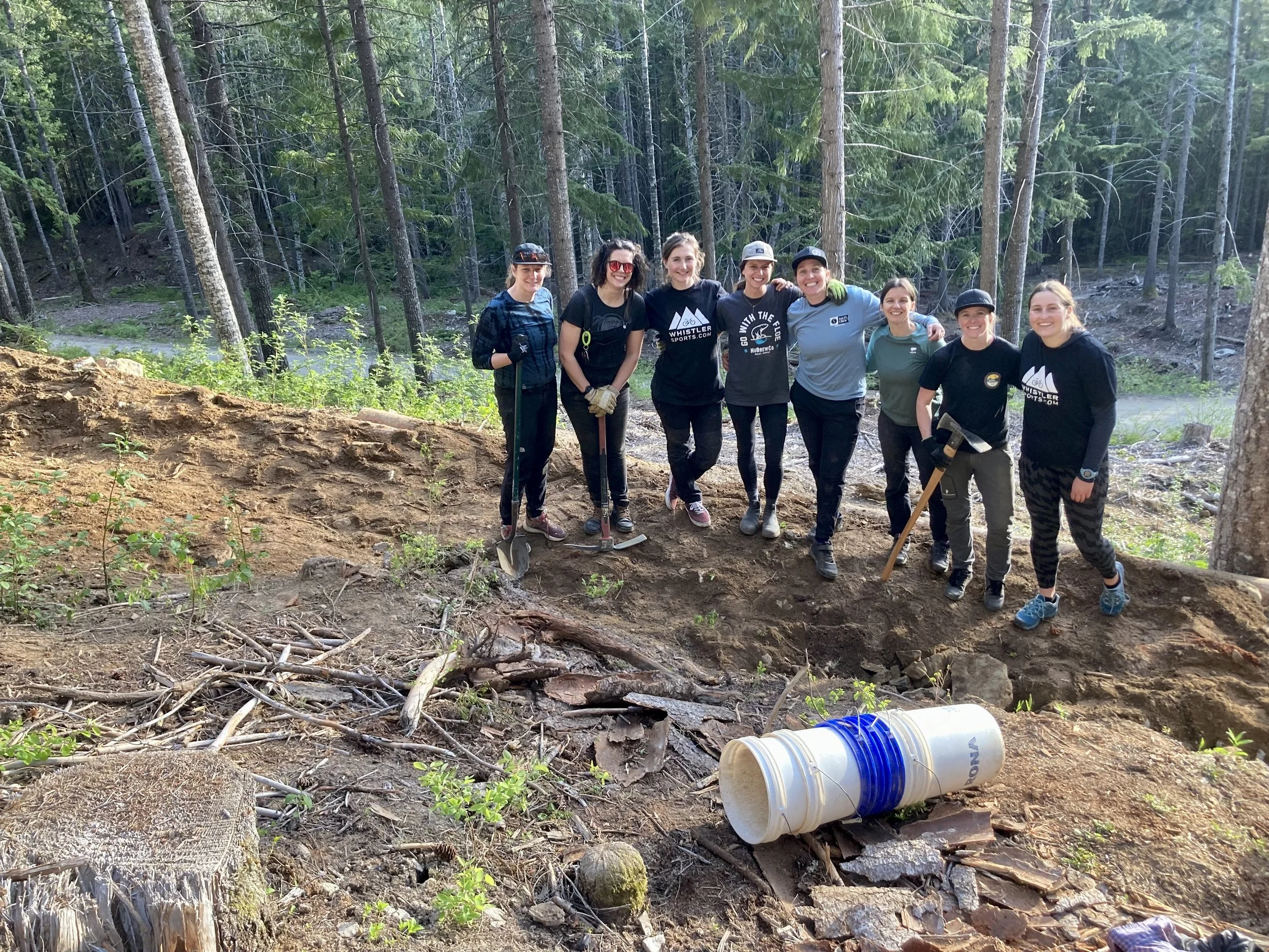 WORCA Board member Kayla Dobson lead this spring’s women’s trail building session supported by Whistler Sports Rental and Sarah’s splendid selection of squishy sugar. Participants were greeted by a bold black-tailed Deer keen to set tracks on the new trail. Both heavy lifting and precision shaping were on the menu - putting finishing touches on lower sections of Flashback 4. While some groups in-sloped berms and shaped rollers, Jackie, Clo, Abby, Grace, Jenny, Jo and Charlene piled rocks then dirt on a behemoth structure. They moved at least 4 hot tubs worth of rocks (10 refrigerators for any foodies reading this) to fill the exit of the big “S” turn. It’s all the little things that make the really big things. Like the amazing selection of burrito fillings offered at the après!