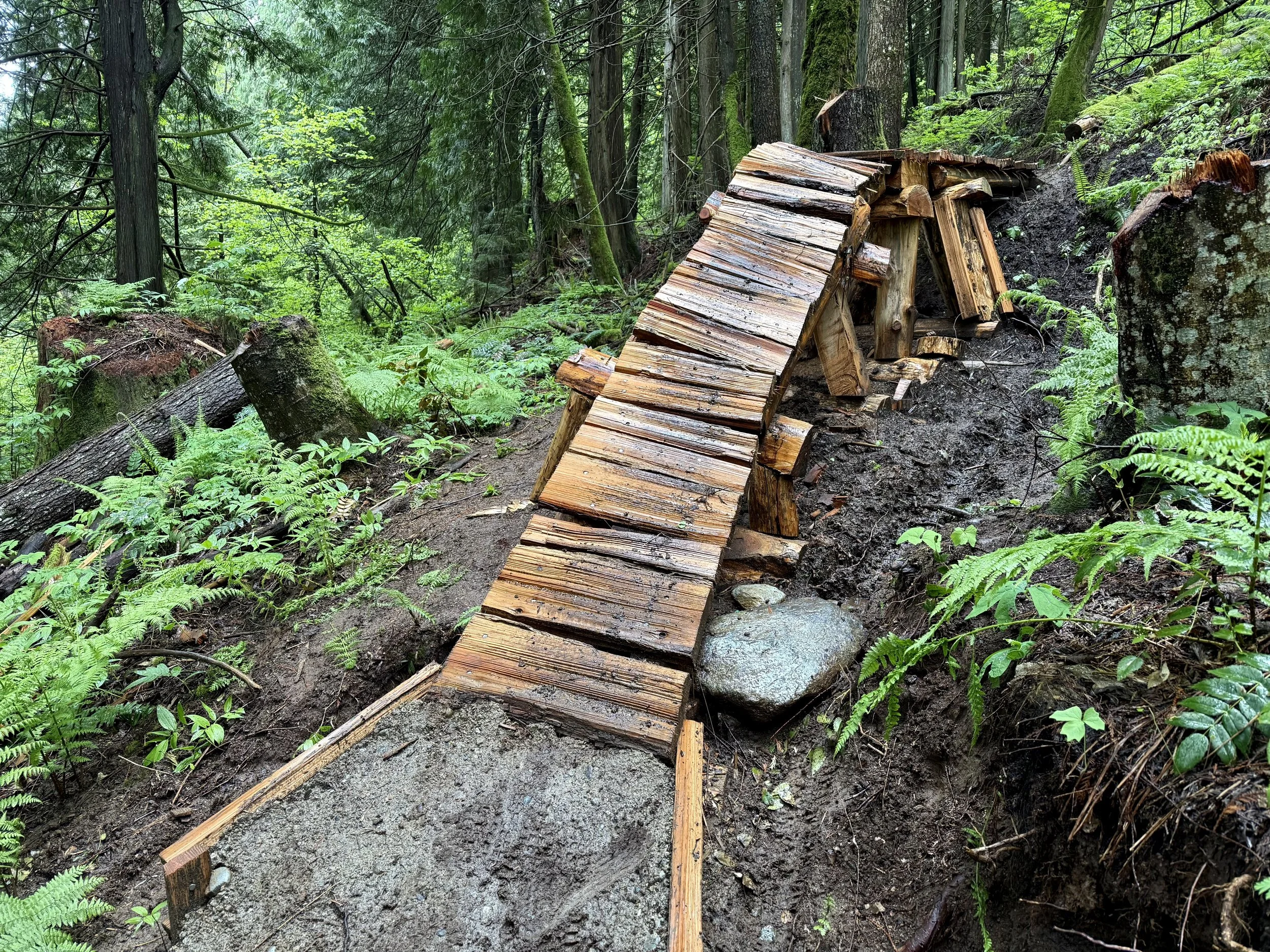 I had a memorable long weekend: after Whismas park laps, I headed to the Fraser Valley and Mount Seymour to sample some “new to me trails”. Leaving Whistler just as our trails emerge from winter slumber seems silly, but I always come home refreshed and inspired. I spotted some interesting carpentry, and avant-garde water management solutions (?). Weekend stand out trails (that I can share here): Cambodia on Seymour, Kerry’d Away on Vedder and Jolly Rancher on Bear Mountain for its unending supply of small drops.