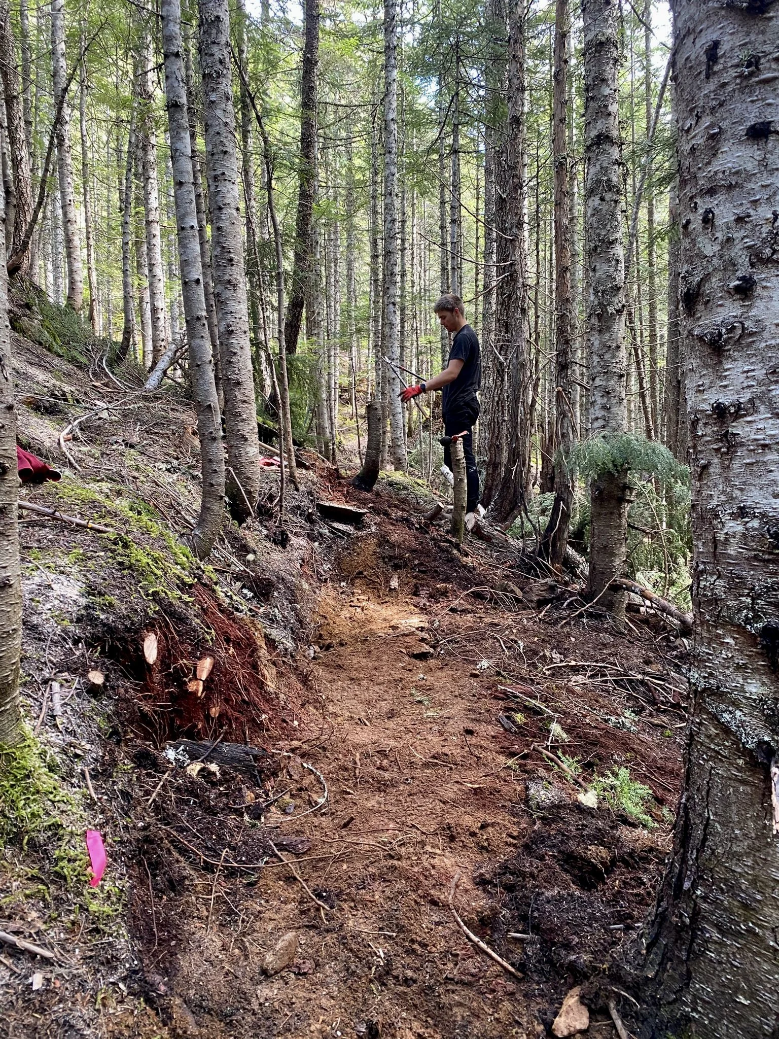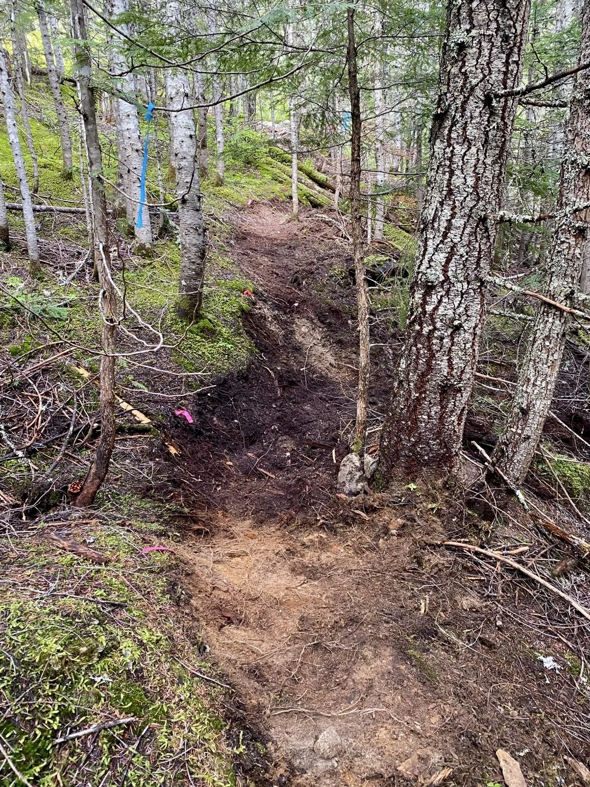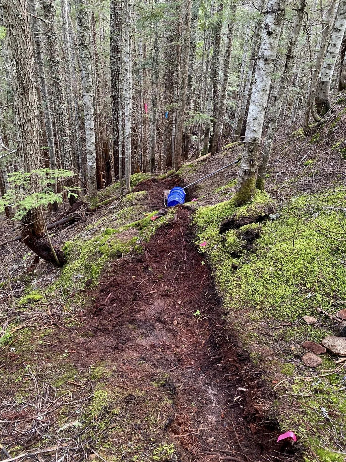 We need to ease back into work after such an action packed long weekend, so 2 days of digging is all we schedule. A “short week” mindset gave the crew some extra boost in their boots heading up Pura Vida. We’re giving it a thorough refresh. Beyond our usual hole filling and armouring, we’re re-aligning the main track here and there to solve issues of tread widening and erosion. We’ve also begun benching a ride around to bypass another chute section which my clinometer confirmed was deep into the double black rating… that feature will remain in place as a more advanced option for thrill seekers and historians. I wonder which line the Back Forty racers will choose?
