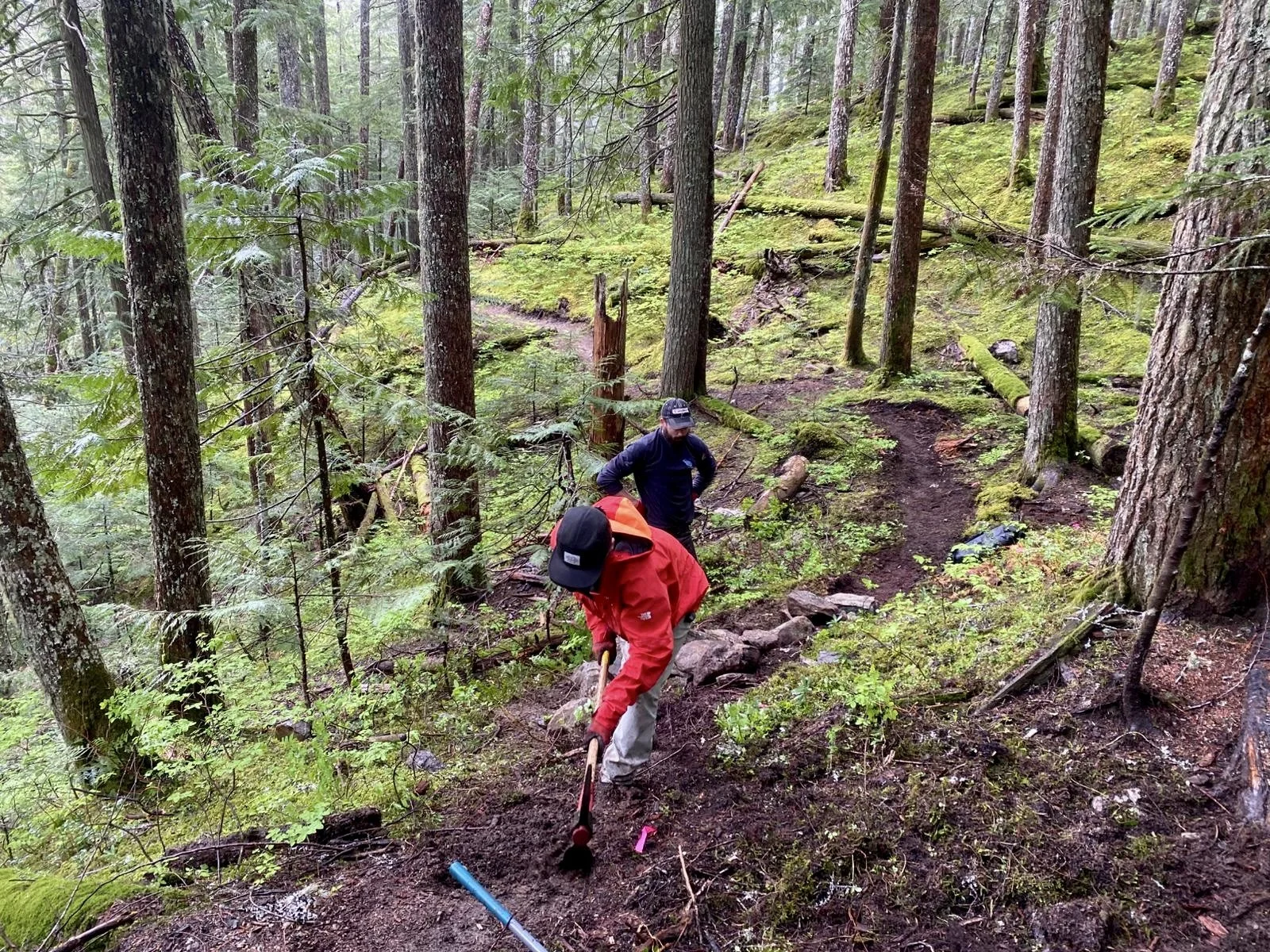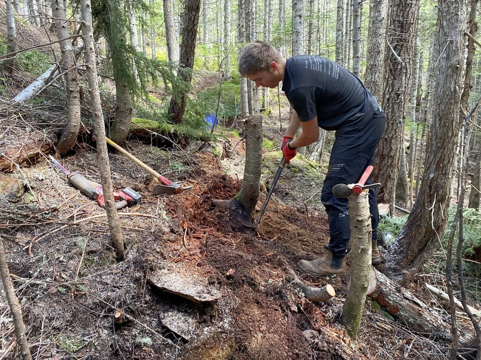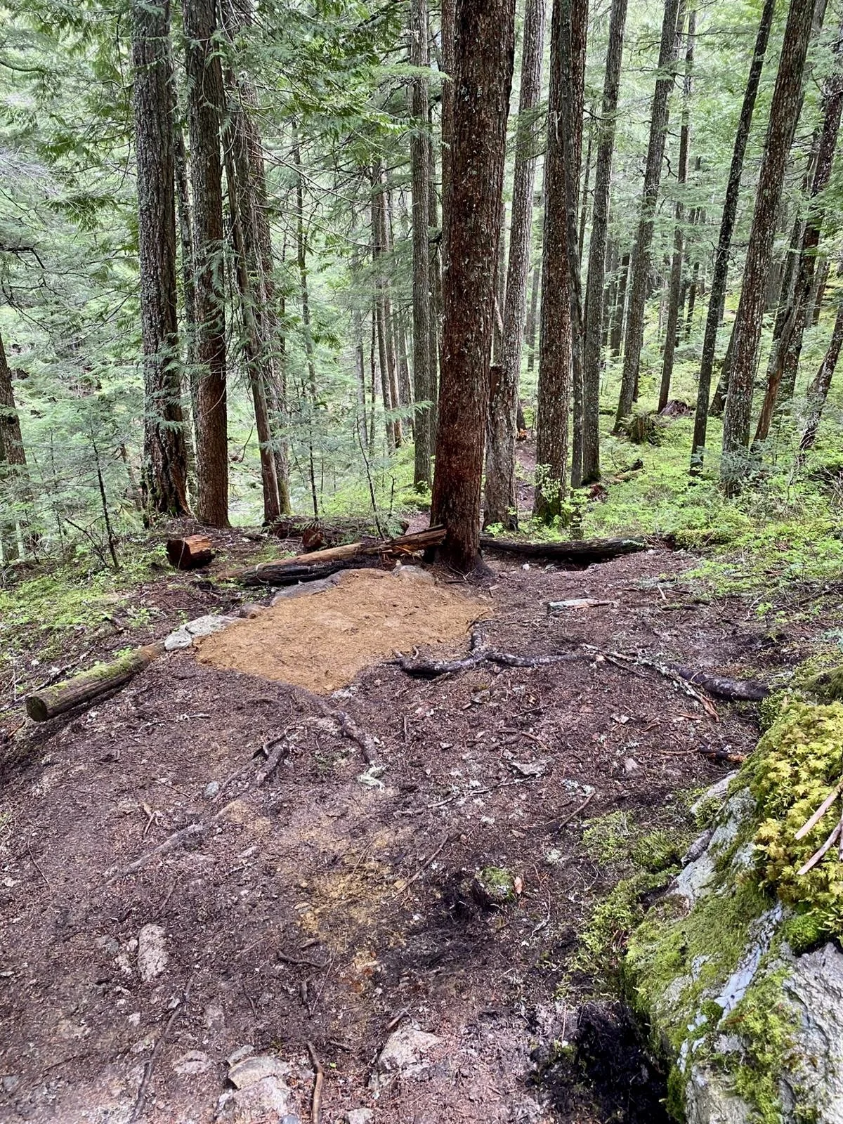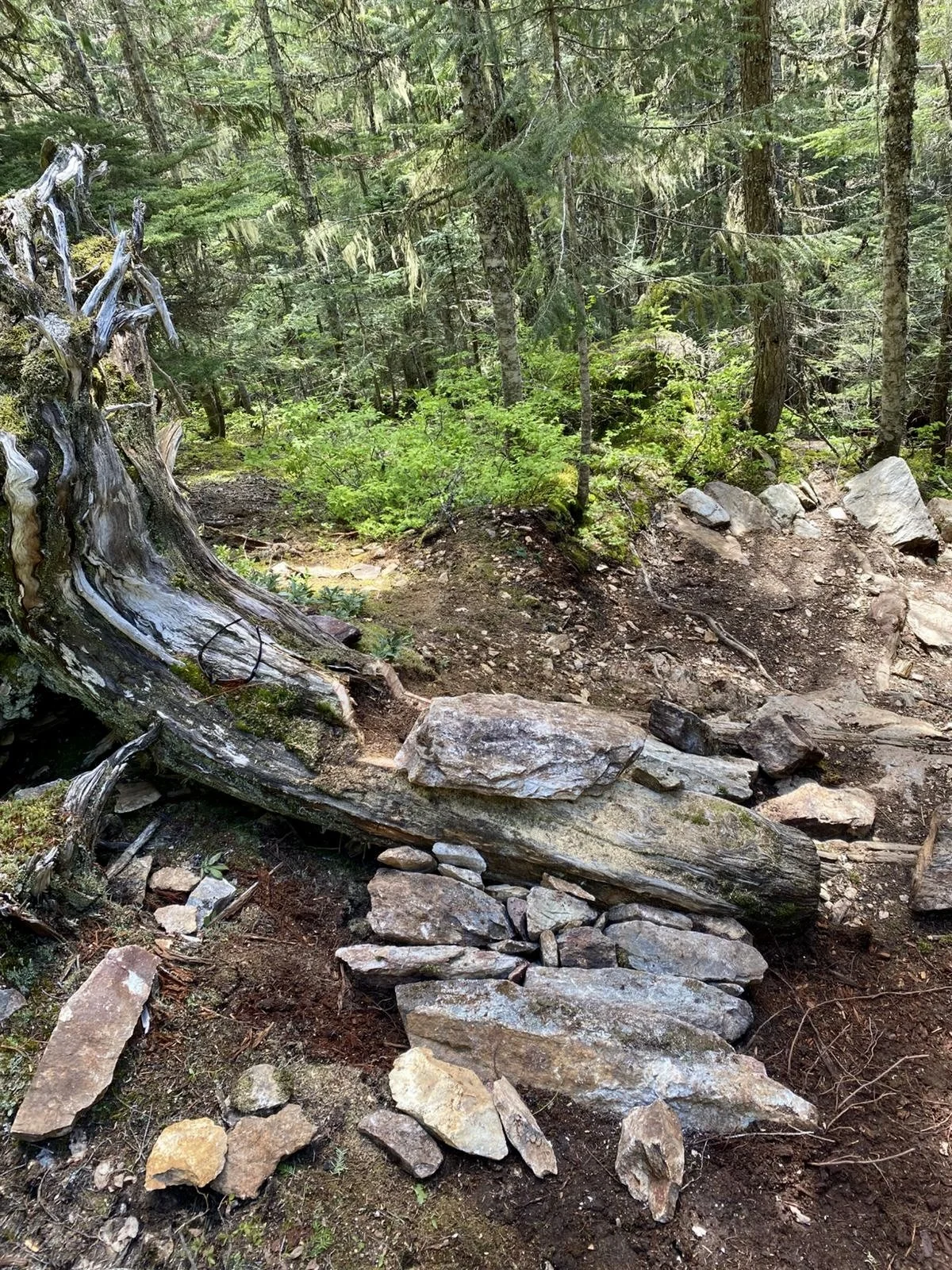 We need to ease back into work after such an action packed long weekend, so 2 days of digging is all we schedule. A “short week” mindset gave the crew some extra boost in their boots heading up Pura Vida. We’re giving it a thorough refresh. Beyond our usual hole filling and armouring, we’re re-aligning the main track here and there to solve issues of tread widening and erosion. We’ve also begun benching a ride around to bypass another chute section which my clinometer confirmed was deep into the double black rating… that feature will remain in place as a more advanced option for thrill seekers and historians. I wonder which line the Back Forty racers will choose?