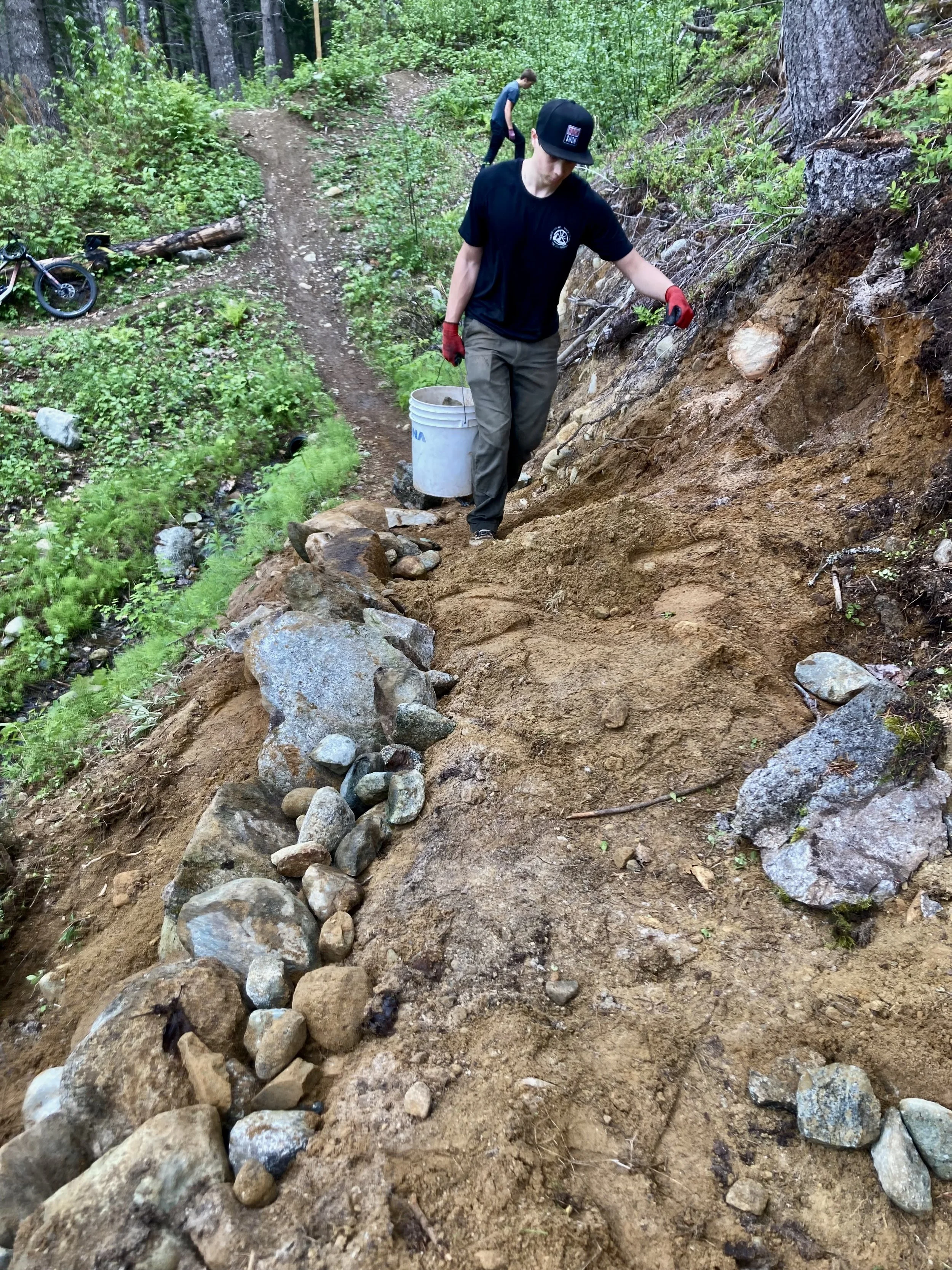 The crew finished repairs on the climbing sections of Business Time (for now). Our goal was to render the eroded sections back to their original tread level. This involved moving a lot of rock! Reilly and Adam muled all afternoon feeding Renee tetris blocks and the resulting ramp is a doozy! The dirt we found was already shockingly dry (as are the trails btw) and looked more like icing sugar… pray for more rain! PS: the “drop” into AM/PM got a little bigger (still rollable)