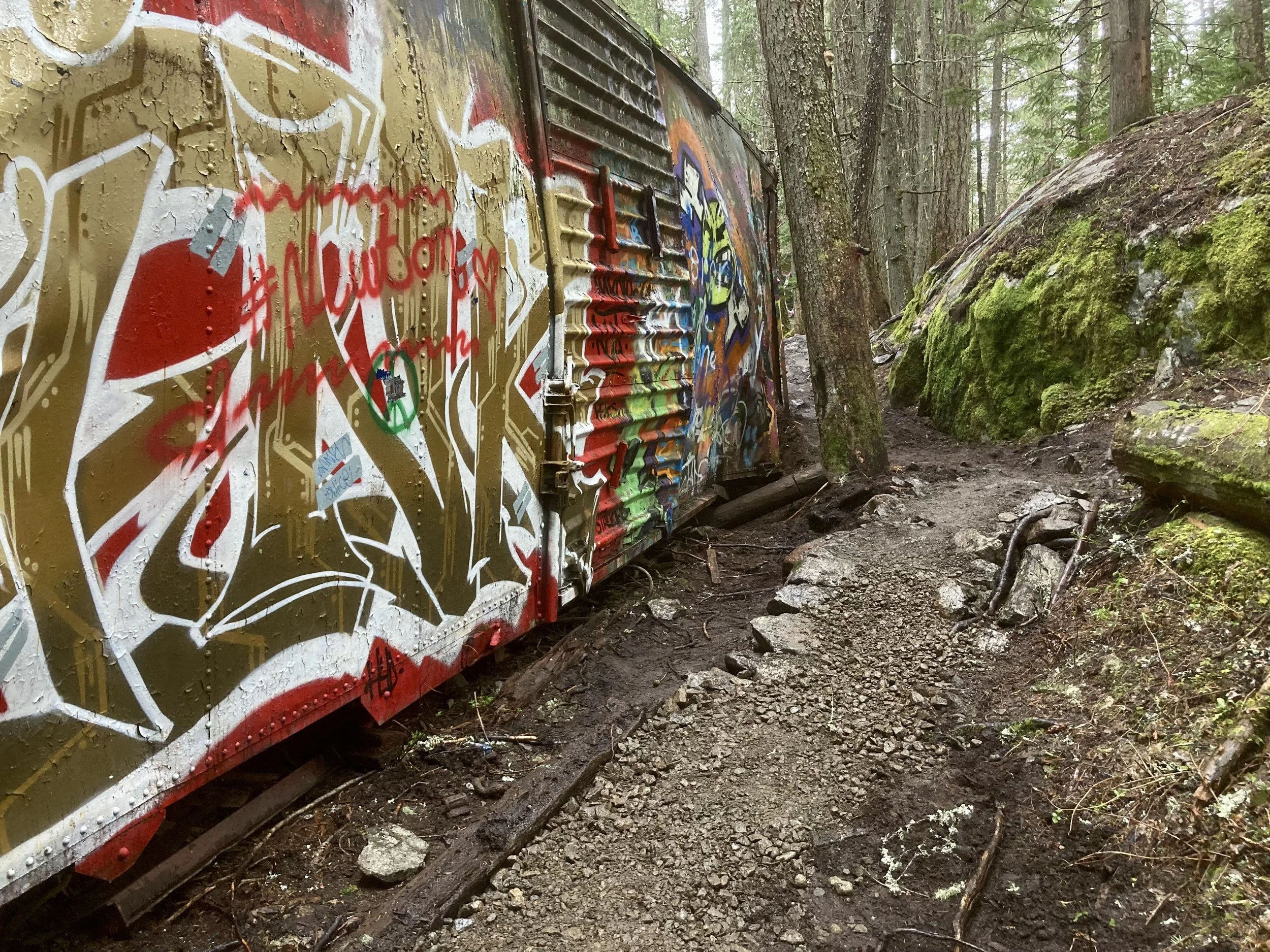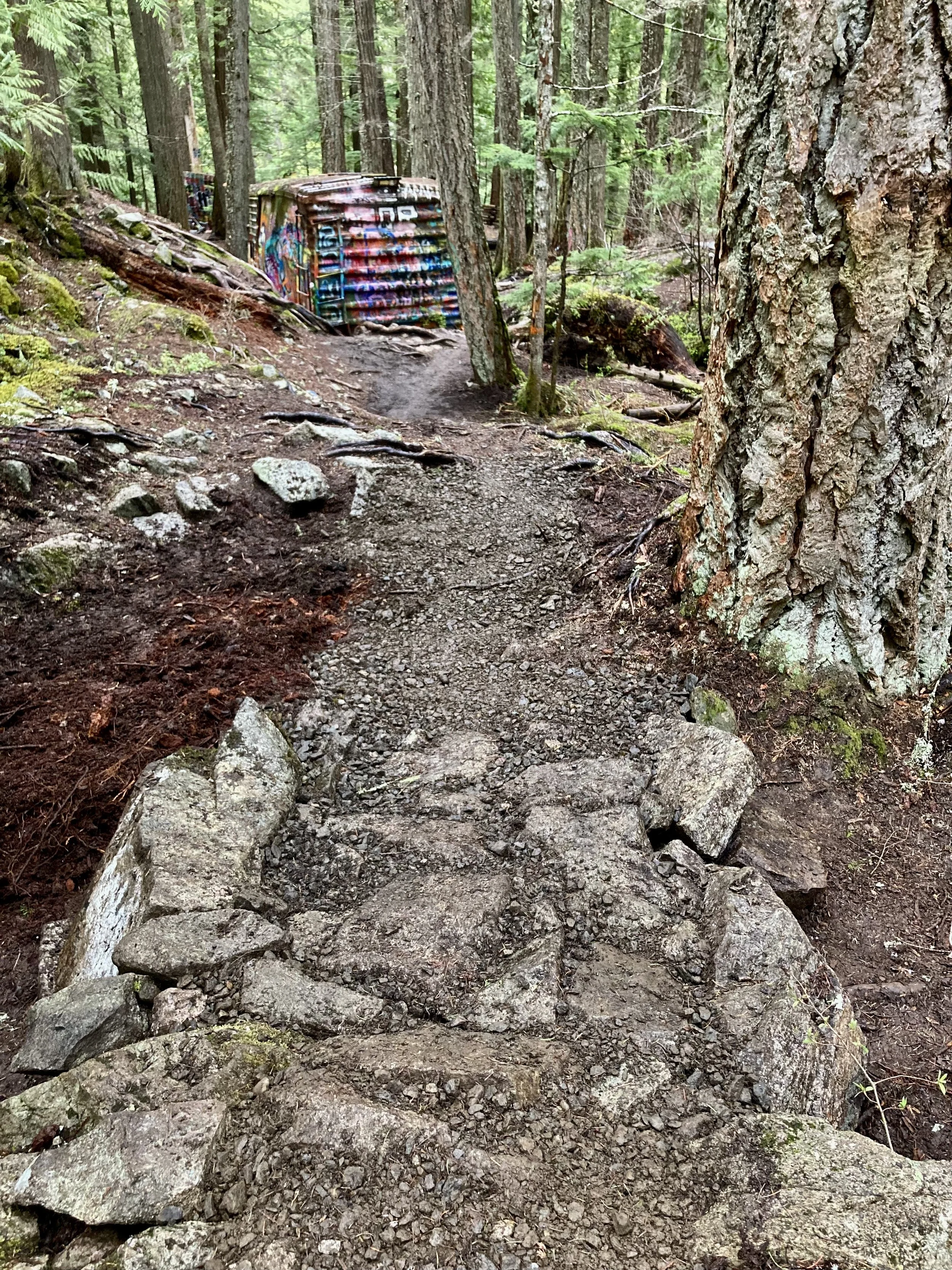 “Are you guys building a bike trail?” Uh, this was a bike trail before that suspension bridge was installed… It was time to “try” managing the bike route through the trainwreck site. The original riding line has “disappeared” (along with all of the underbrush and moss) due to the heavy foot traffic now drawn to this tourist attraction. We upgraded the higher ground path behind the first rail car that should prove to be more favorable for bikes and designer shoes. We scraped A LOT of black organic muck before elevating/recapping the trail and blocked some of the many braids throughout the area. Finally, we added decking and improved the ramp onto the last bridge where the bike trail re-enters the dense forest. This work should help make the south whistler XC loop to the Beaver am (Runaway train) more enjoyable.