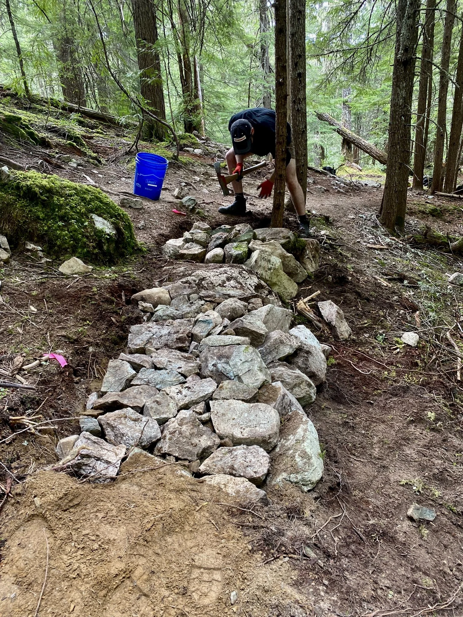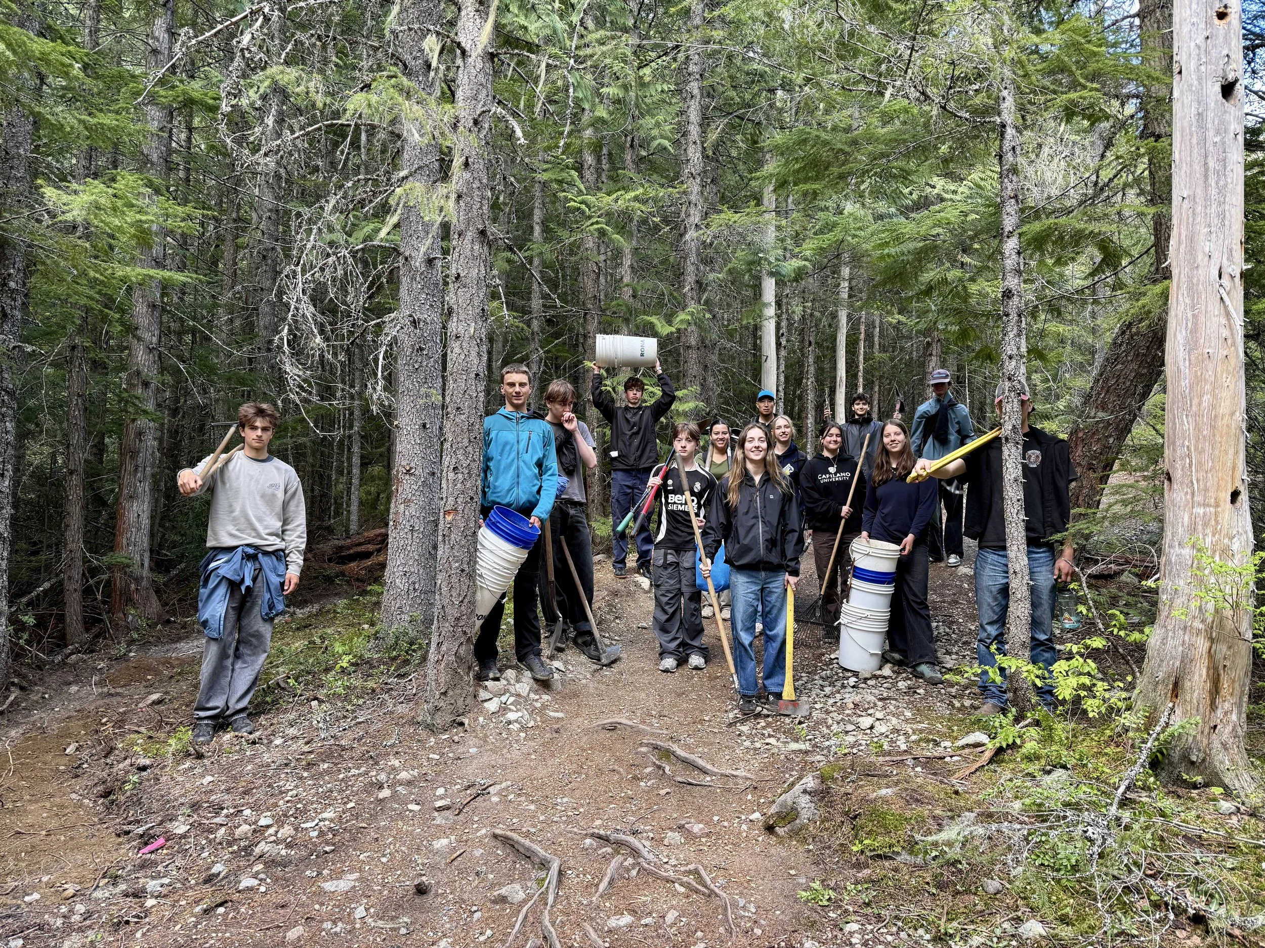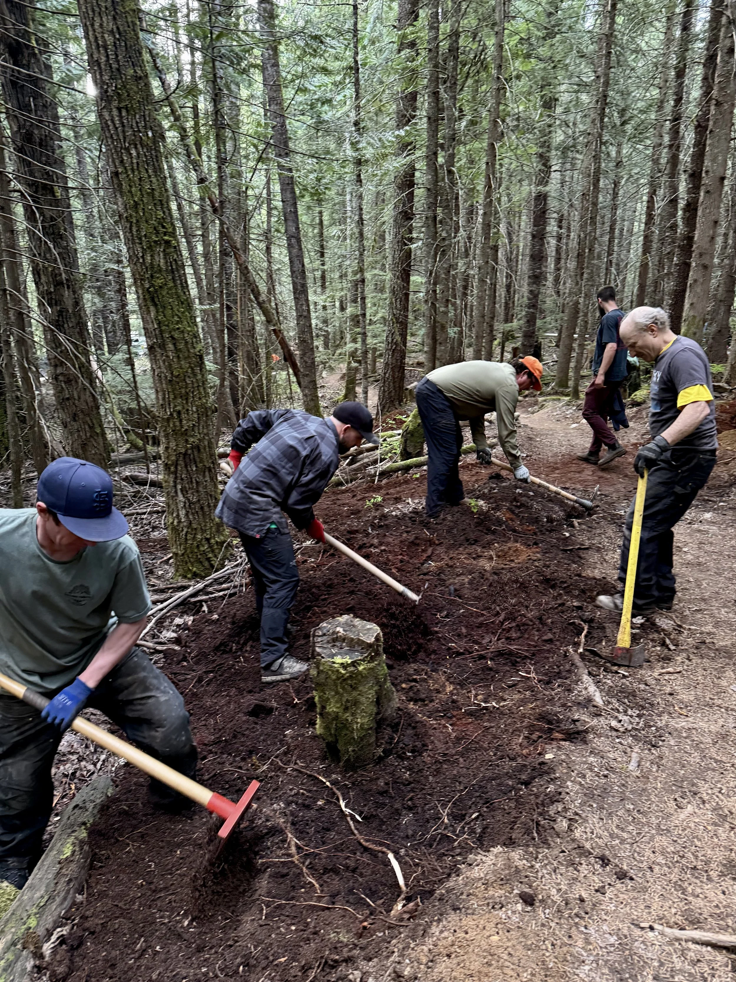 The Whistler Secondary School Outdoor Leadership Program (WSSOLP) students were back in Delineator this week. They managed to punch through the new line through difficult building terrain. They dug out deep rotten logs before filling the holes with rock. Shout out to Mr Kung and students! Hopefully for you, the mosquitoes are “slower” on the West Coast Trail… We’ll be returning to Delineator to complete this project in a few weeks with another volunteer crew.