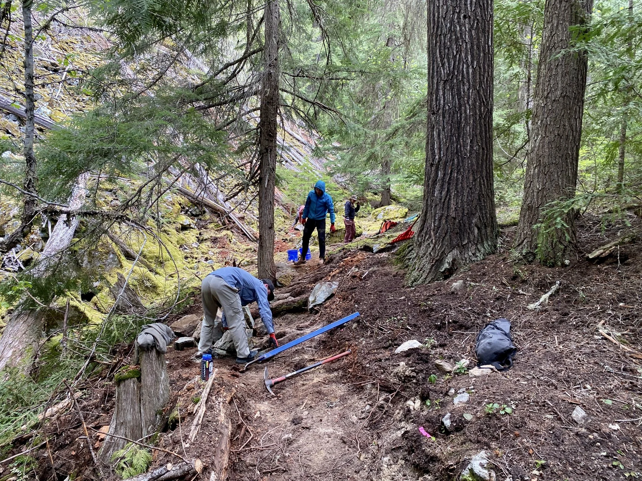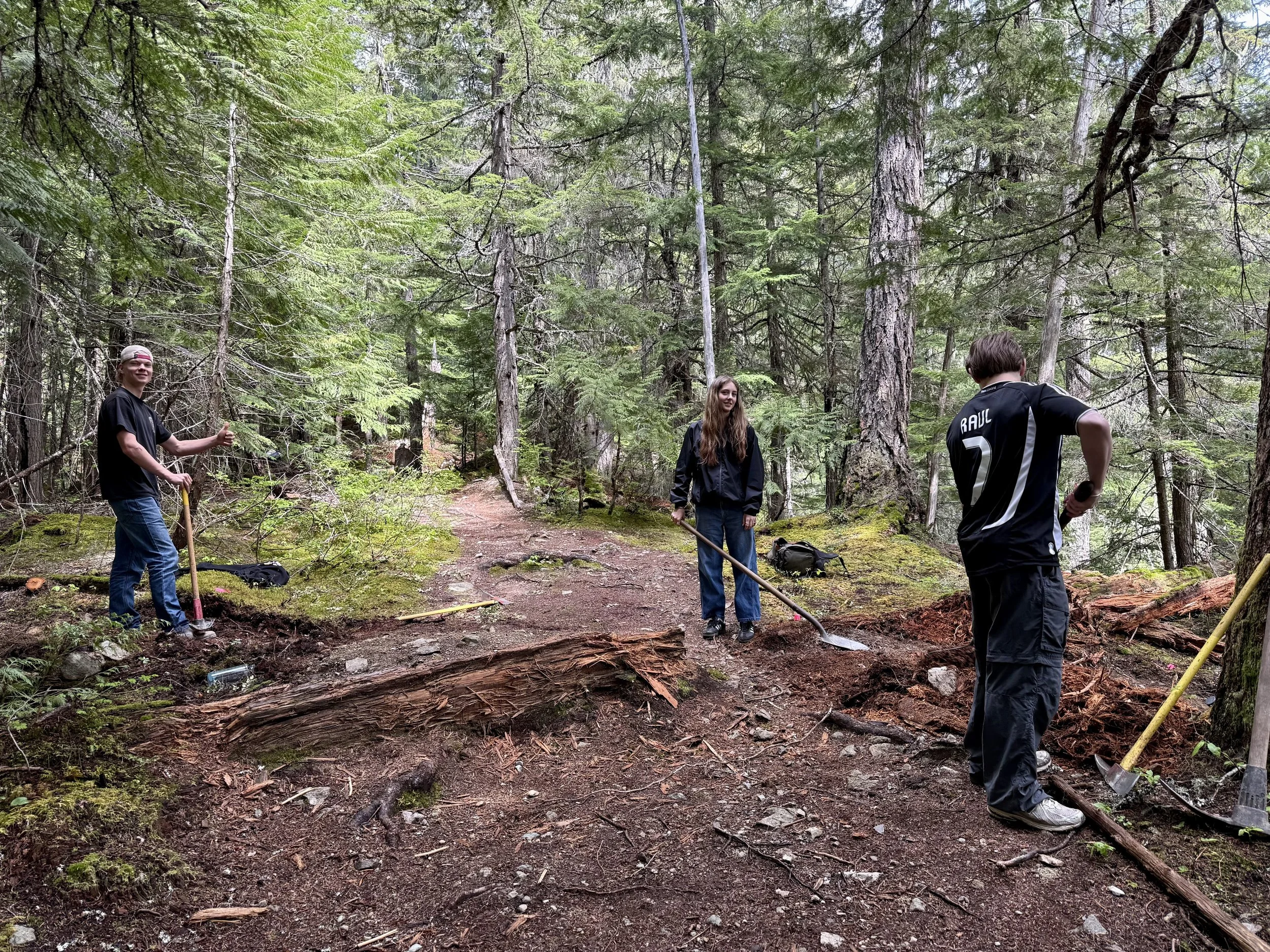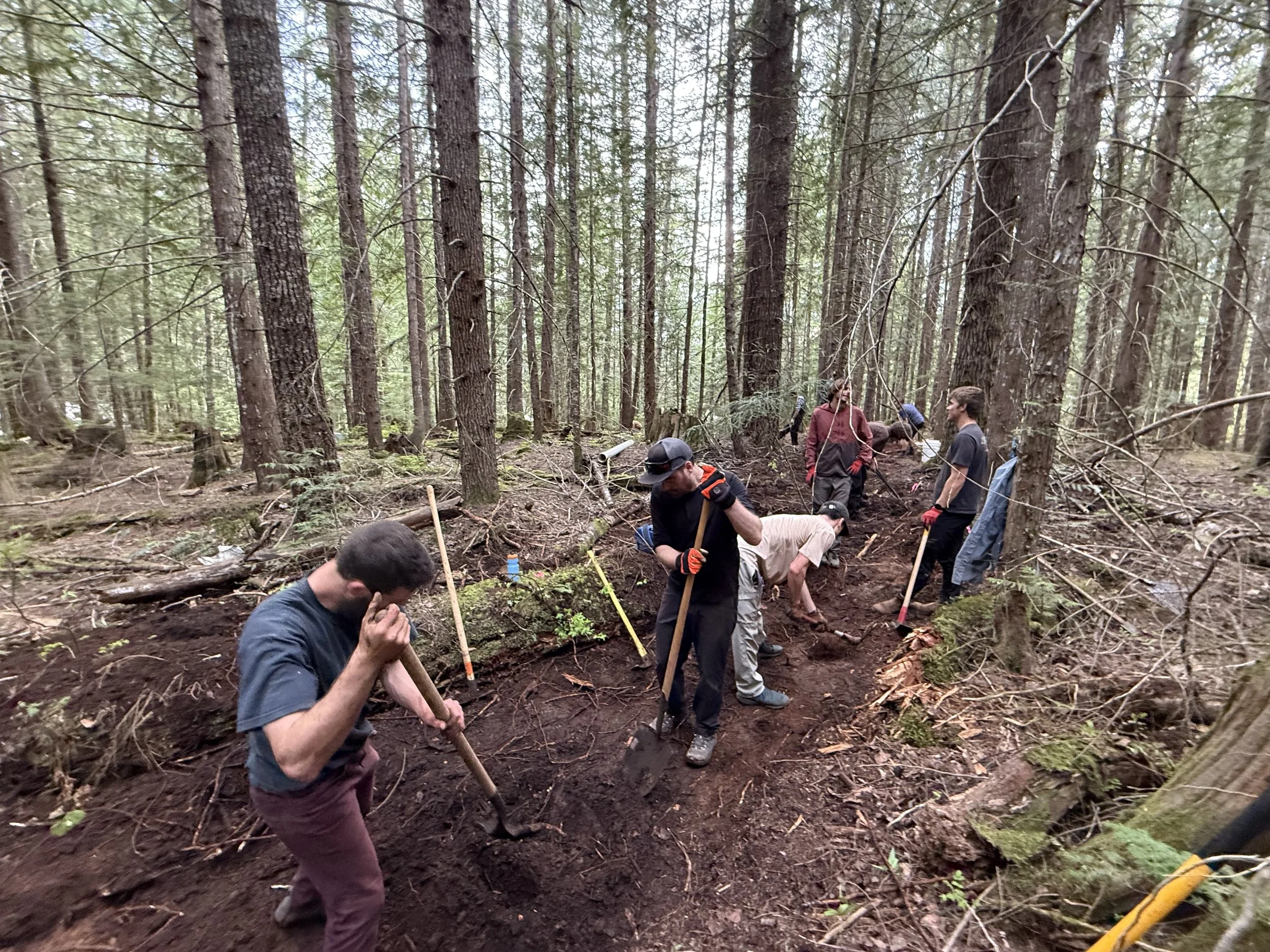 The Whistler Secondary School Outdoor Leadership Program (WSSOLP) students were back in Delineator this week. They managed to punch through the new line through difficult building terrain. They dug out deep rotten logs before filling the holes with rock. Shout out to Mr Kung and students! Hopefully for you, the mosquitoes are “slower” on the West Coast Trail… We’ll be returning to Delineator to complete this project in a few weeks with another volunteer crew.