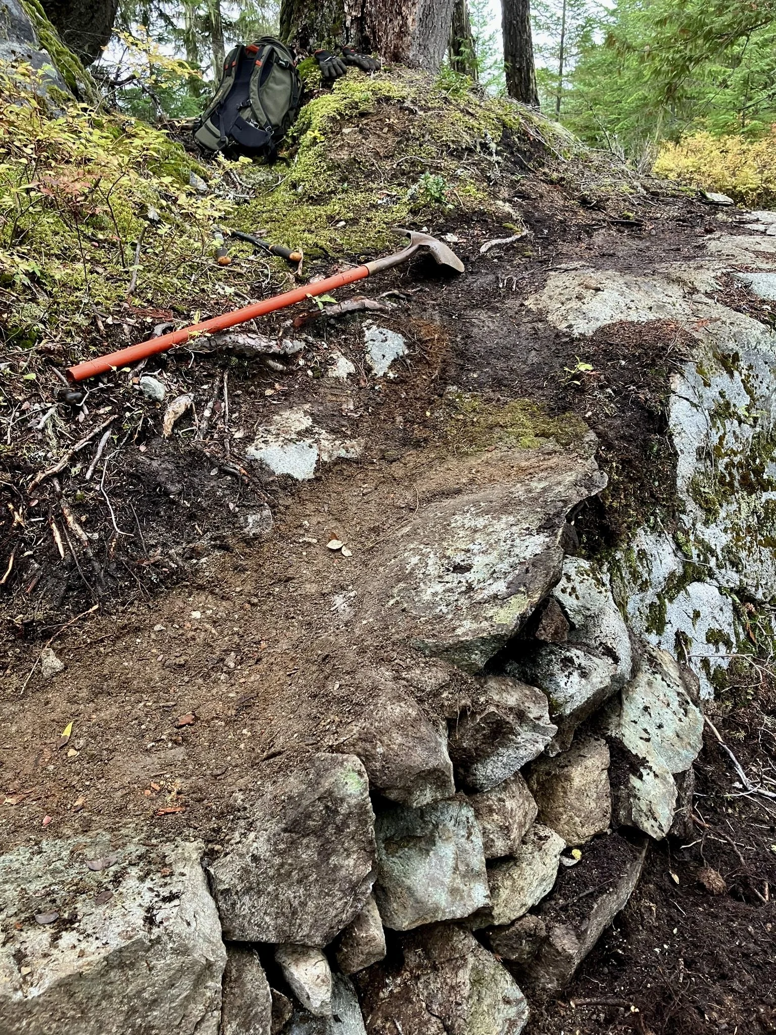 Next, we hit the No Flow Zone for a complete redesign of Up Shit Creek/Creamsicle Rainbow with the support of Whistler Secondary and Whistler Adventure School students. We were all students there too… the entire trail crew got a taste of mini excavator operation as part of our ongoing skills development program! Later, the crew battled rotten features and swarms of wasps in A River Runs Through It. Wider, Lower, Smoother was the assignment but we also added a few Narrower, Higher upgrades too. While in the neighborhood, we also reno/redesigned Danimal North (and South).