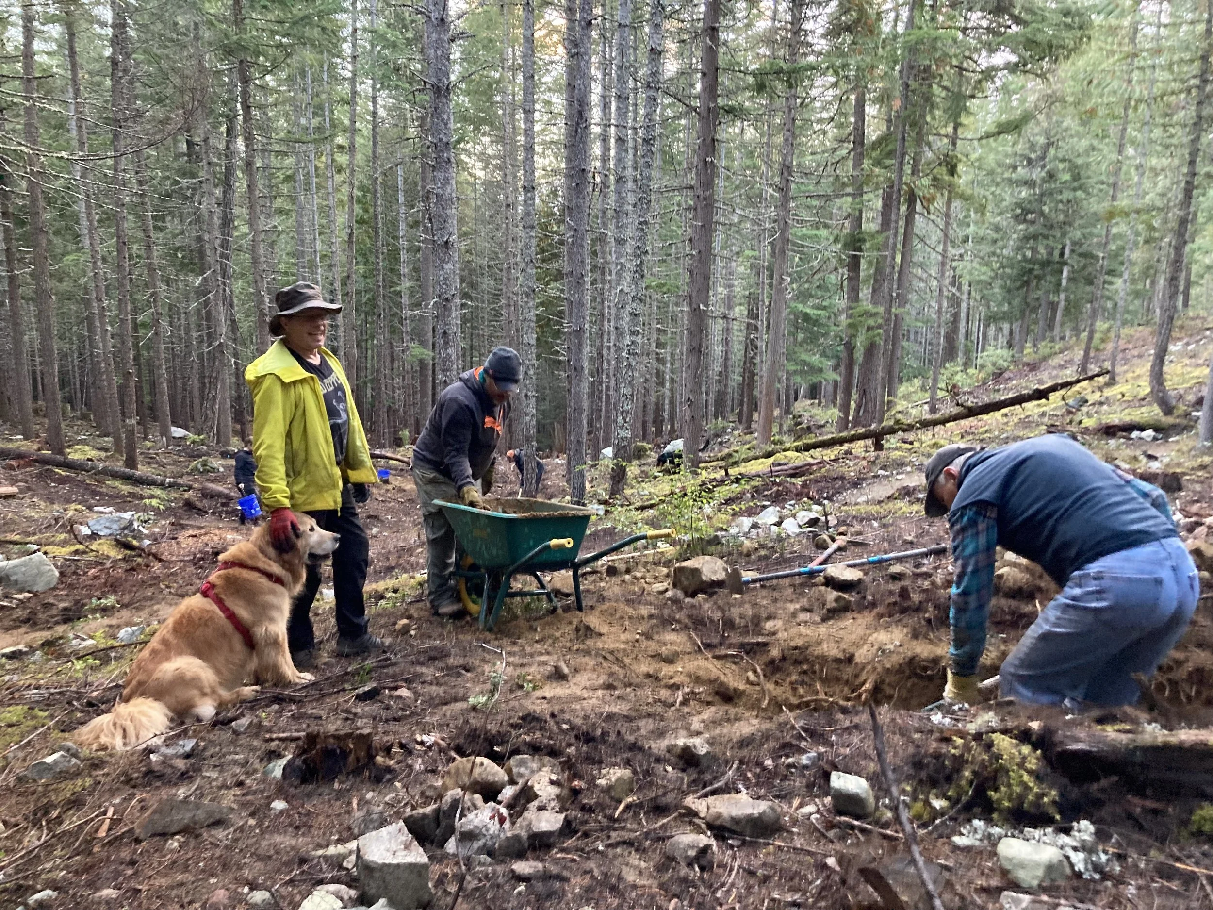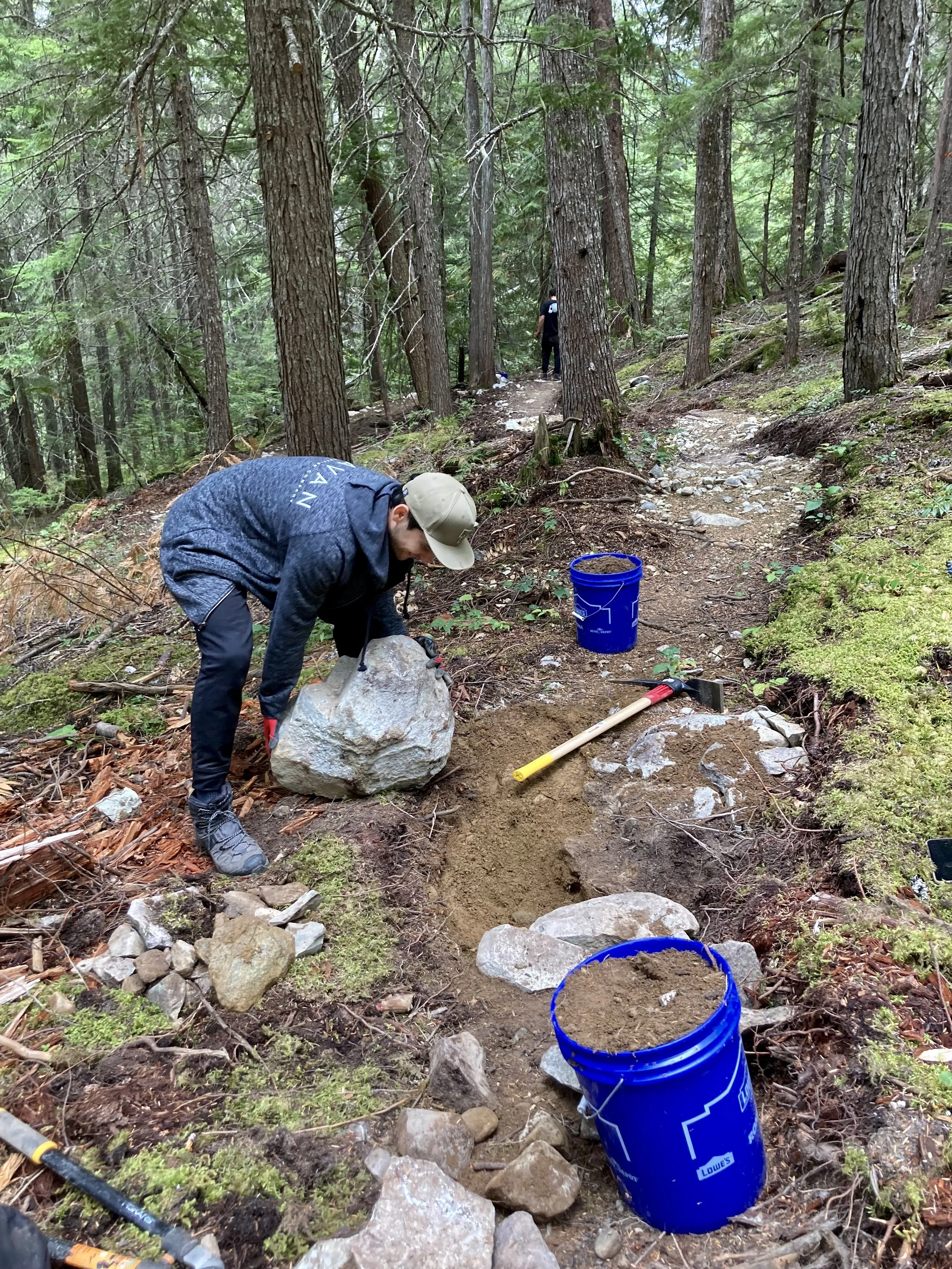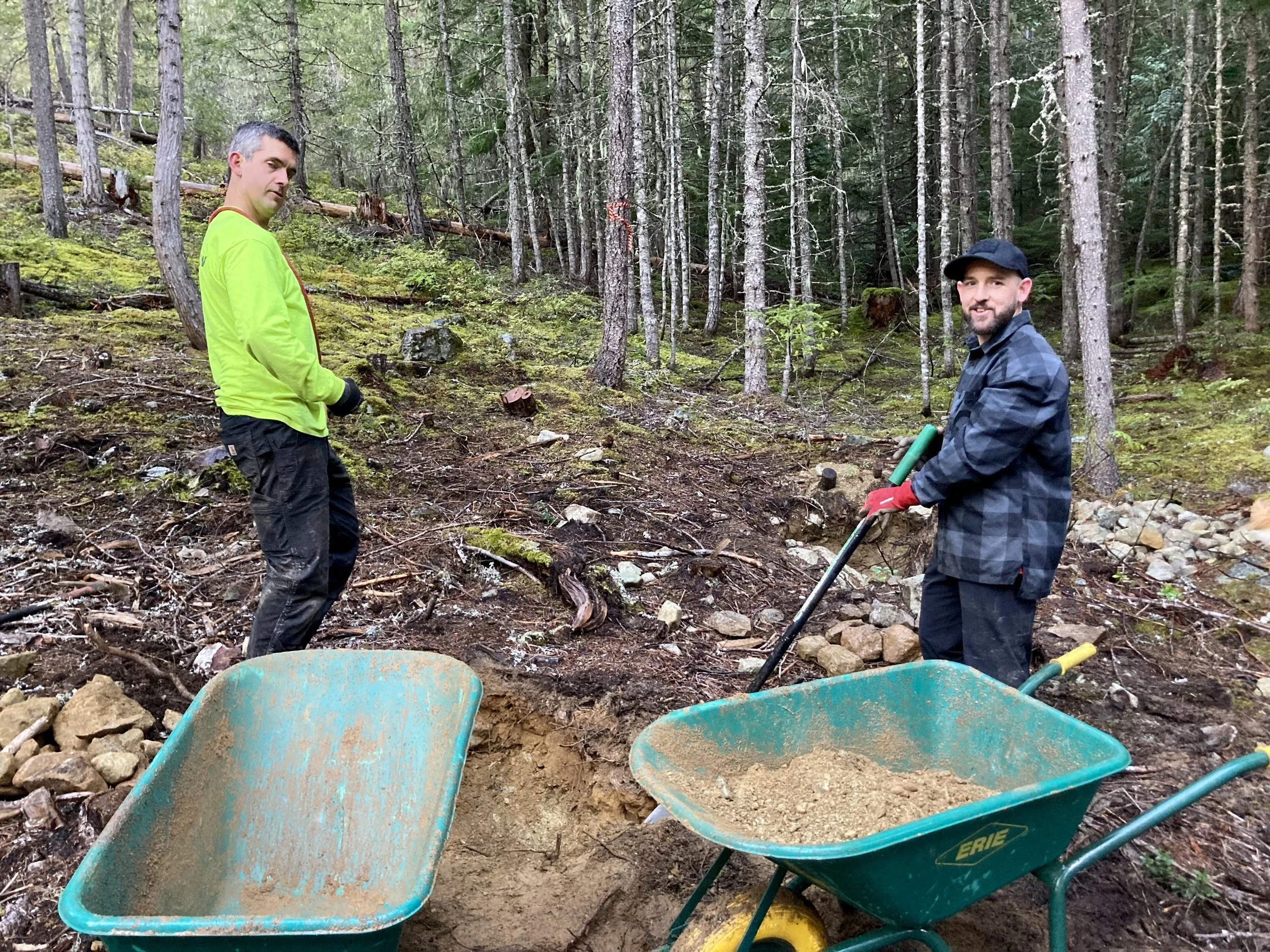 My brother (Frank) was visiting this week. Of course I took him to experience sea-to-sky highlights like flying over Howe sound, hugging an ancient Cedar and riding Flashback. We also ate and drank like kings, sampling some amazing shoulder season fine dining. Frank loved it all but he was curious to see what my “normal day to day life” is like… so I took my brother to work! Frank joined us for Tuesday Dig Night (last week was sponsored by EVO). We were putting some finishing touches on the redesigned Creamsicle Rainbow trail. The No Flow zone blessed us with countless wheelbarrows of unexpectedly PRIME dirt to cap rockwork projects that were laid down last spring. Frank dug like a champ so we rewarded him with Sarah’s deluxe pulled pork hoagies paired with Coast Mountain Brewing’s freshest IPAs. He exclaimed: “You actually do gourmet everyday!”