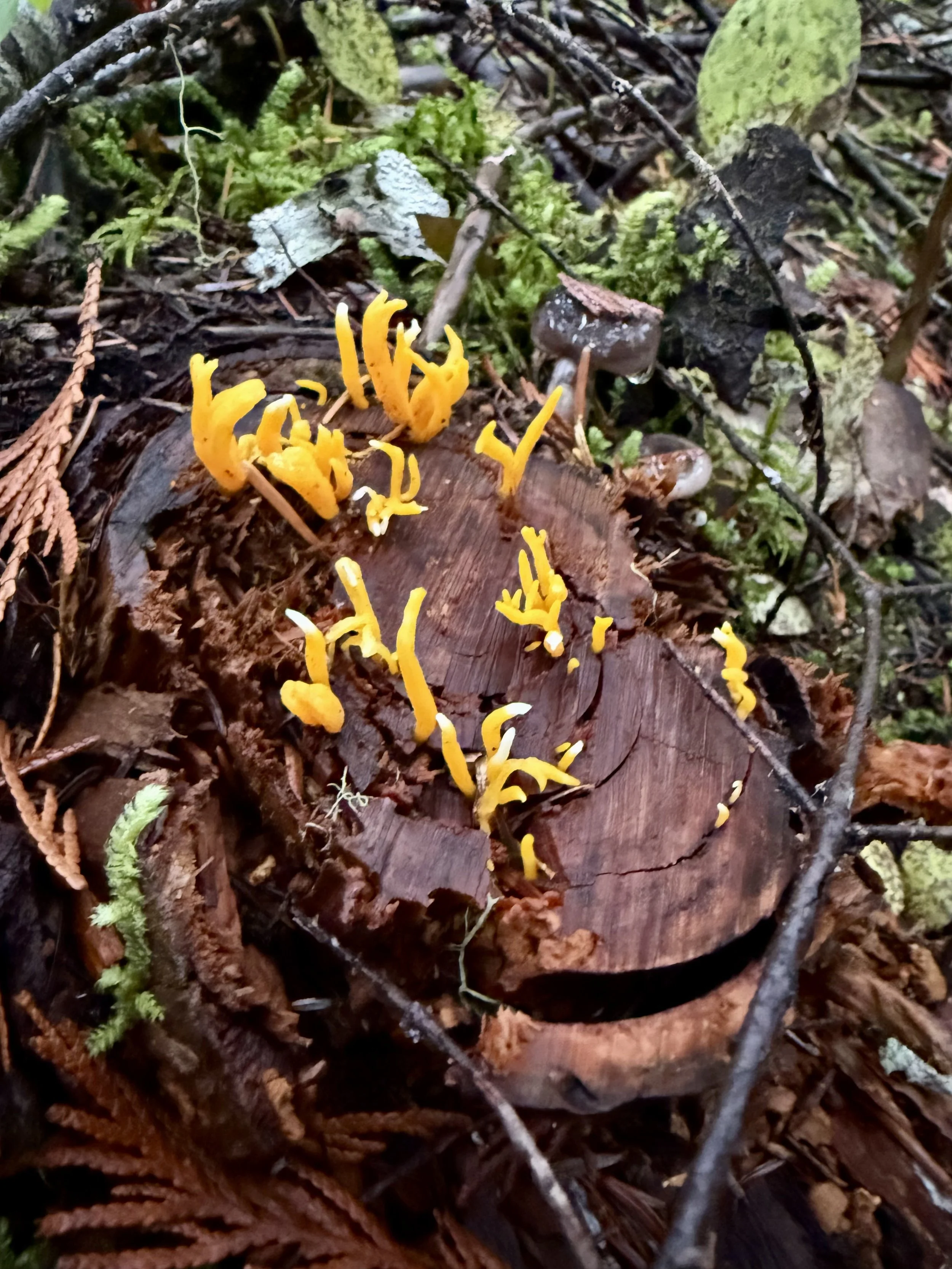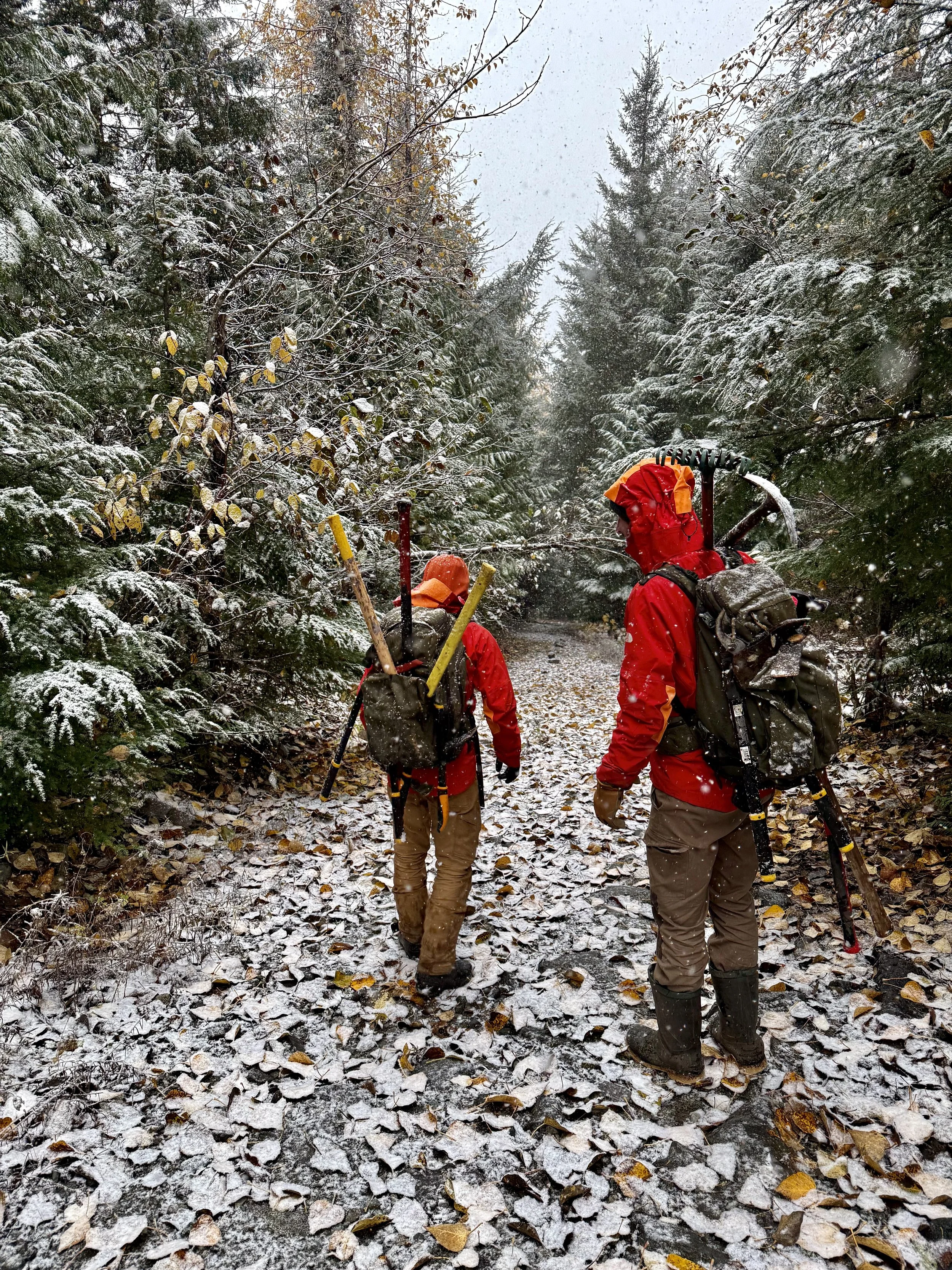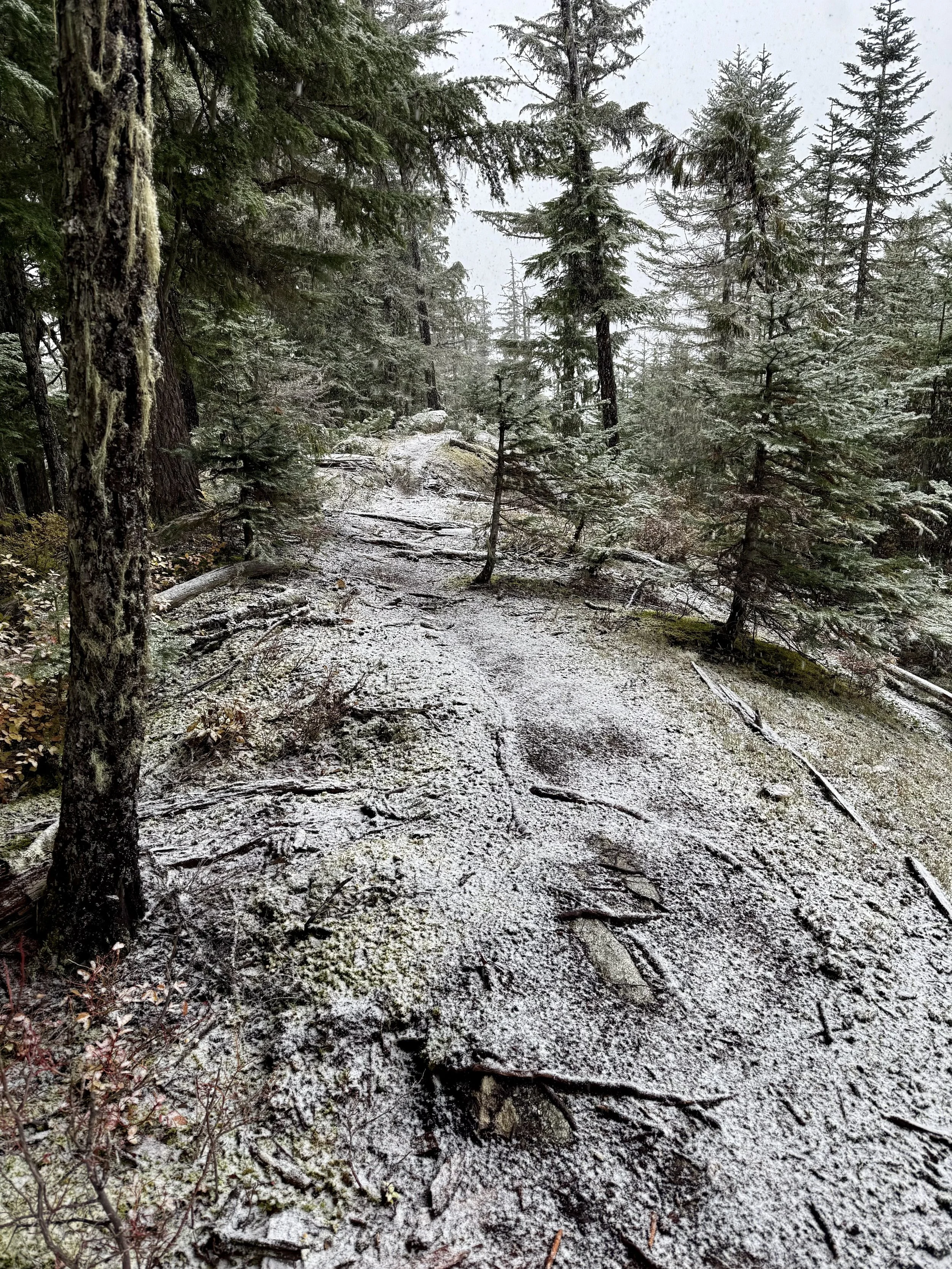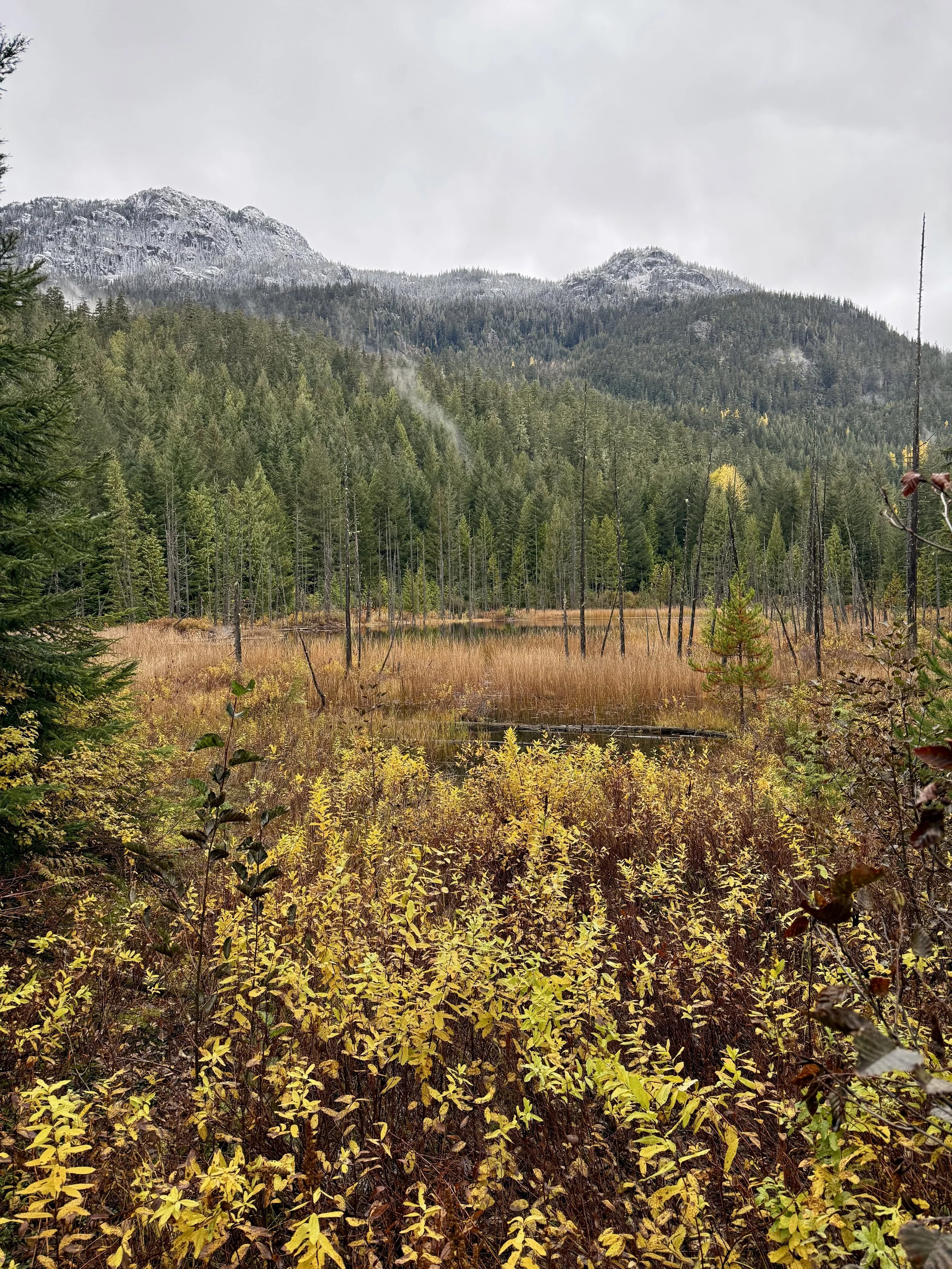 Over the weekend… mid ride… I found some Chanterelles, Hedgehogs and… “Cat’s Tongues!” Unprepared for such bounty, I filled my pockets, vowing to return with a basket. The weather forecast made it clear that trail work season would soon be over. There’s no question that I’m in denial! There are always more little fixes left on my to-do list and the slippery root riding season has barely commenced. After completing a few more touch-ups on Middle Danimal, the Michals and I set out across the valley to haul out our tools stashes. I charged towards Jane lakes at sunrise, knowing my pack would be heavy for the return ride. My feet got soaked in the first creek crossing but I pedaled onward. The Cottonwoods had coated the FSR in gold leaves that muffled my tires. My mind wandered from season highlights (for this text) to winter plans, frequently distracted by larger than possible mushrooms. And then, suddenly, there were cats! Just 40m ahead, two Cougars were heading my way! Overtaken by instinct, I cawed “Argh Argh!” which probably confused them (and me)! The cats turned back and leapt over the creek, showing off their grace and ridiculously long tail. They were startled and I knew that turning to escape was not a good choice so I stood my ground and cawed some more. They scurried into the forest and I felt “safe”: they could not stealthily outflank me through the open boulder field above. I stared in their direction for what felt like an eternity. Not wanting to turn my back to these fantastic felines, I backed away slowly. Suspecting these were probably the cats responsible for several closures and rescues earlier this summer, I knew better than to carry onward. The next morning, I brought backup! The Michals joined me so we seized the opportunity to cross some T’s and dot some I’s in the area before hauling the tools out in heavy snow. On to snowboarding then!