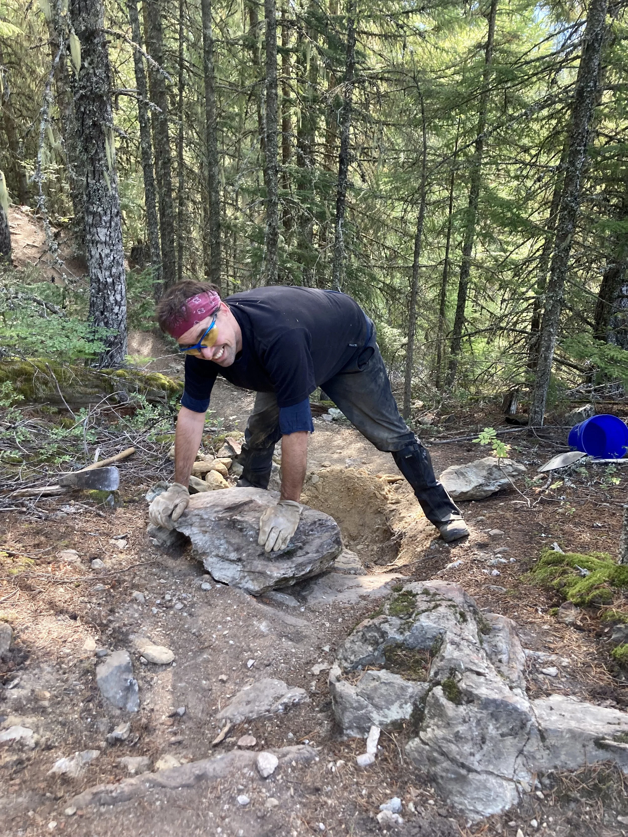 We’ve barely turned the calendar over to September, but signs of autumn are already showing. Dark, chilly mornings, fungus rising and leaves are already falling… Let’s hope the Wasps get the message! Frequent readers will remember my affinity for working on a deadline, so, following the props we received for our Westside Wheelup last minute course upgrades (Danimal North), we immediately moved the crew to work on one of the stages for the Witsend Enduro. Danimal South has been on my “to-do” list for some time, but it hadn't shown much urgency. Hosting a race is a good catalyst to get the ball rolling. The crew was “hot” following a few weeks of dry-lock armoring work and Danimal South was in need of some serious smoothing. We also had some bonus muscle for the week: “Big Rock Rob” was back for another volunteer stint and he lived up to the hype!