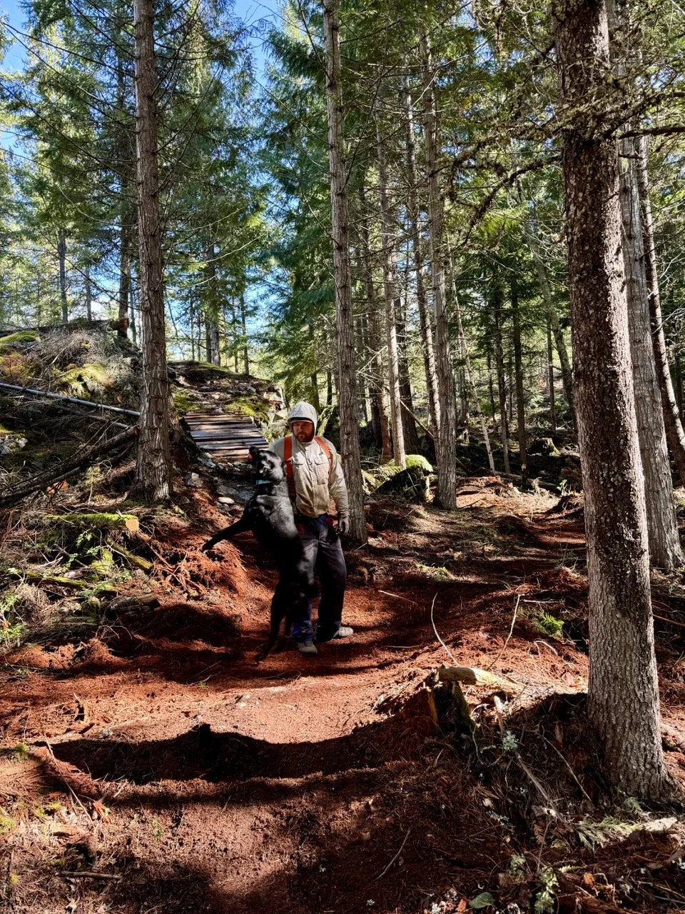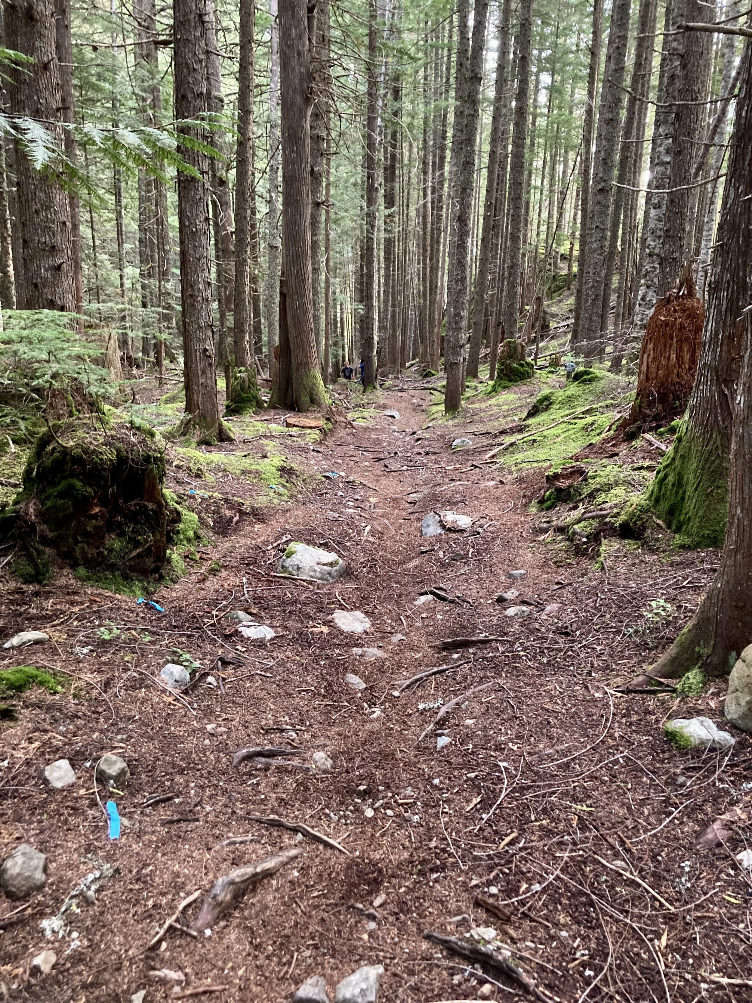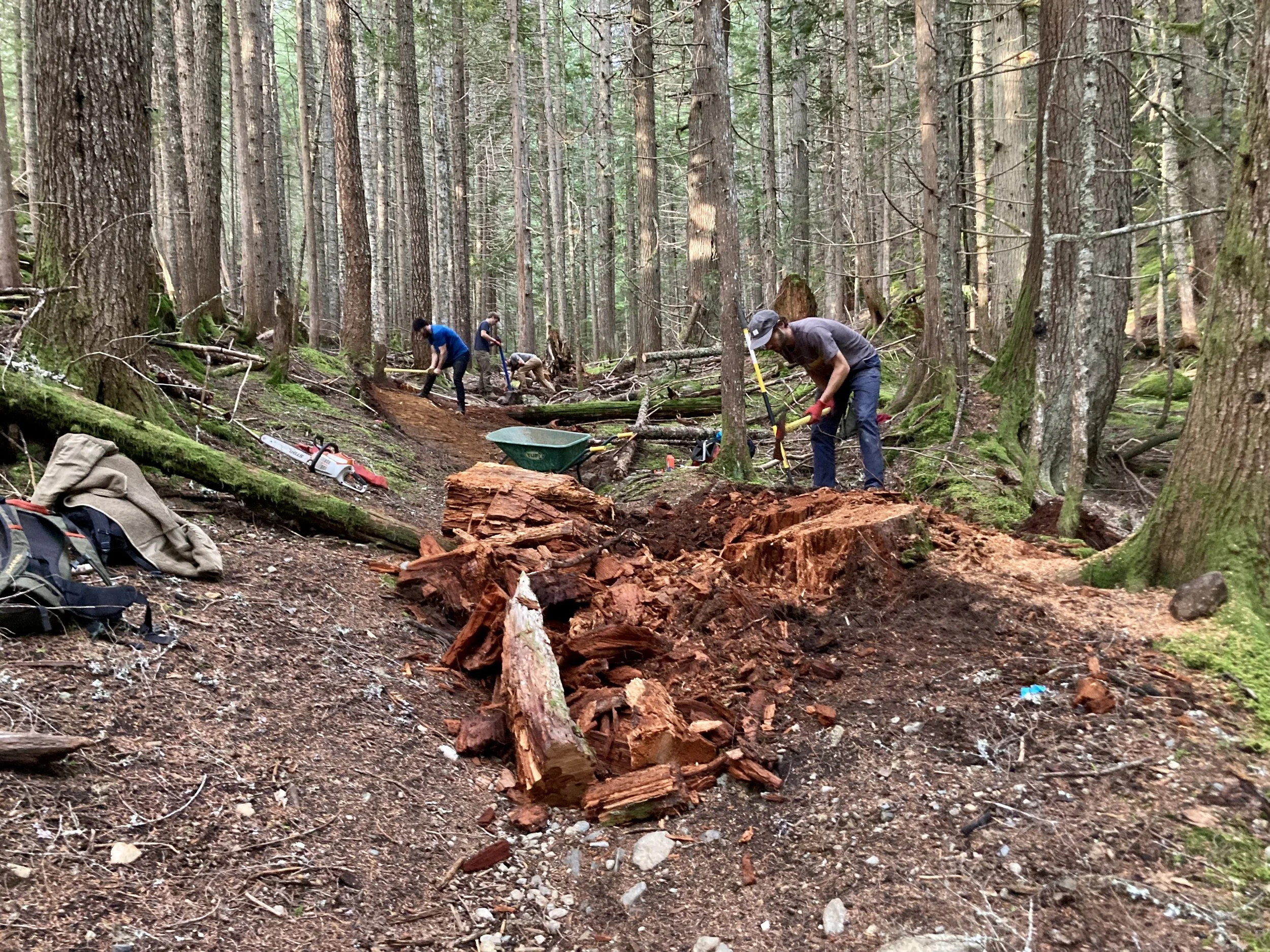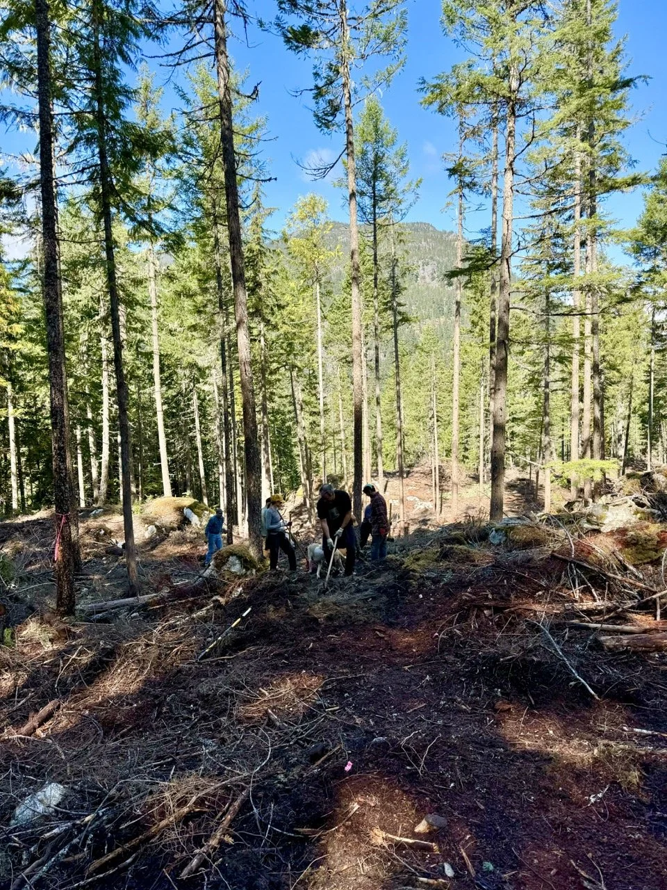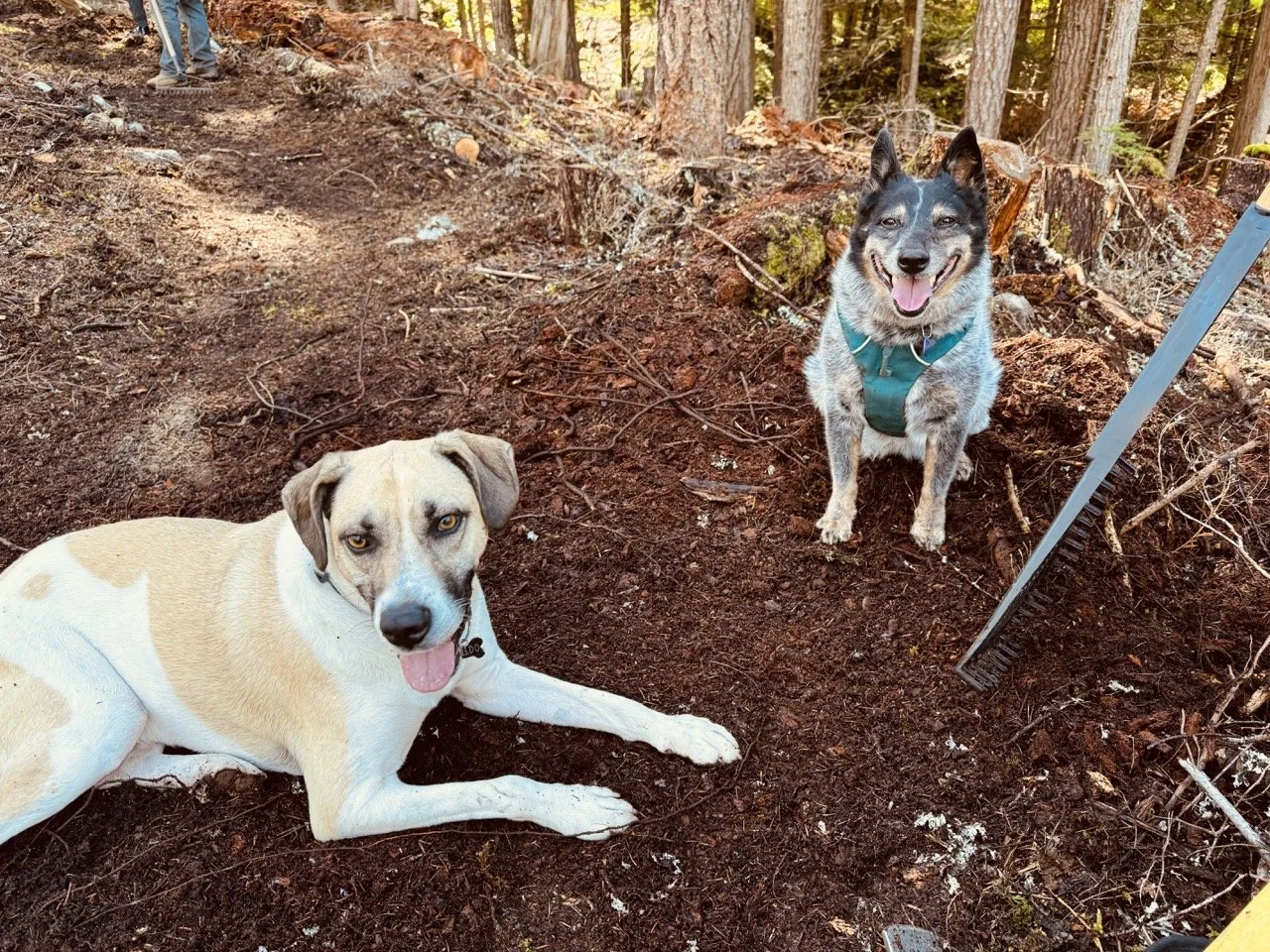 Volunteer trail events are back! Last Sunday, we ventured way north to the wedge zone: to rehabilitate High Hopes. The trail name follows the theme of Pink Floyd song titles in the area (Comfortably Numb, Happiest Days, Young Lust...). The Cheakamus Community Forest is performing fire-thinning work (ongoing) around the Wedge Woods development and so, they wanted to sponsor a trail day to spruce up affected trails. Having the trail’s builder (Tim Haggerty) lead the project was a refreshing change of pace for me: I also got to dive in and dig cause “Tim’s the boss today!” We refurbished buried sections and added a ride-around. Enhanced some rockwork and pulled stumps. Please hold your enthusiasm to ride the fresh work: The trail is still closed until forestry operations are complete including operation of heavy machinery and pile burning when conditions are right. Check trailforks before your ride or go try out a different Pink Floyd trail…