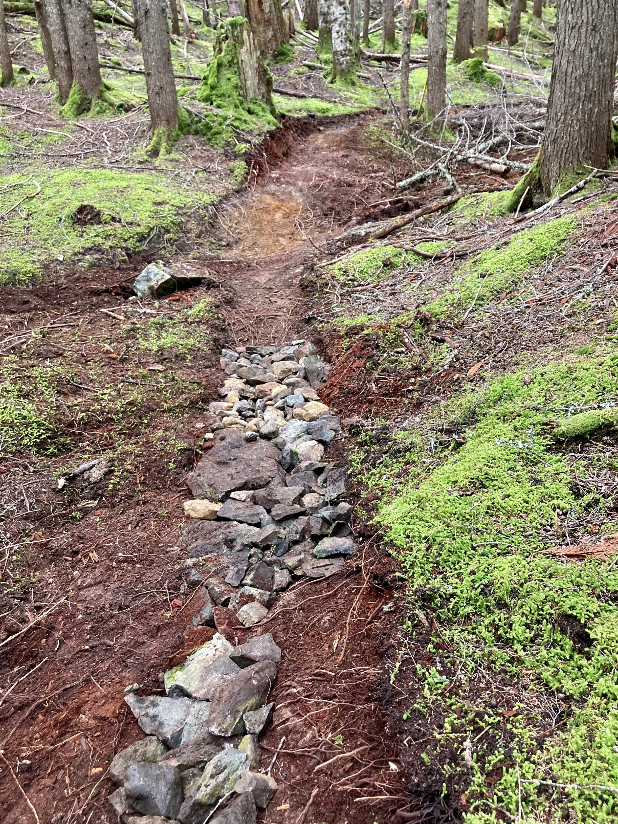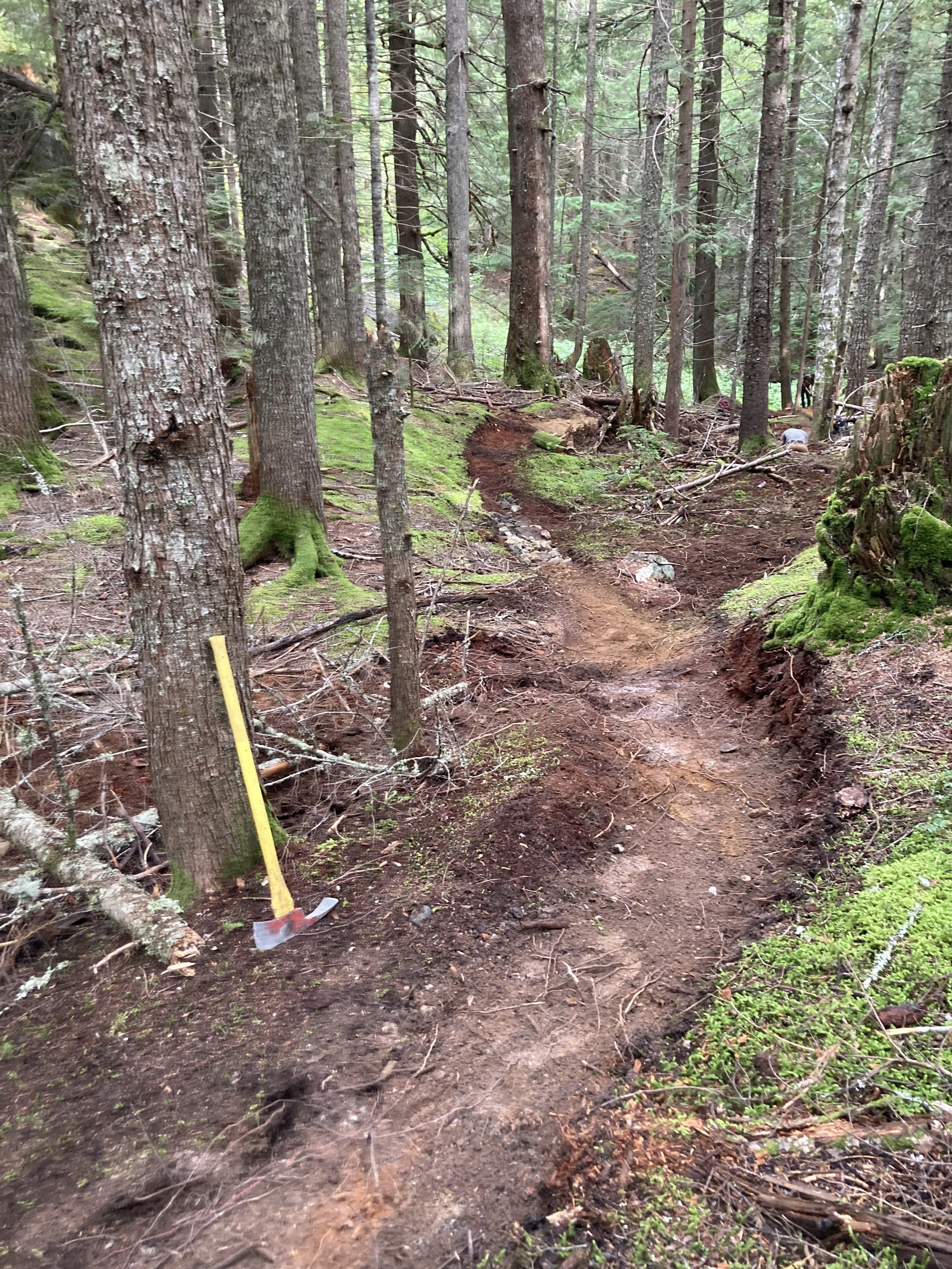 As much as I love to surprise event participants with fresh trail work, there’s even more satisfaction in actually finishing a project. We had left our tools in Danimal North while we spruced up Danimal South for the Witsend Enduro. Modernizing the bumpy straight-away was nagging at me, so this week we returned with gusto. We needed to pull the line out of the guts (low spot) of the old road bed, where water flows during downpours. My snowboarding senses were tingling when we planned for this redesign… the terrain features inviting natural “walls” on either side of the original screamed “Let’s try to make this little valley feel like riding a halfpipe!” We took great care to leave some rocks and roots, so the currently smooth line should develop that classic Danimal old-school bumpy character. Sadly there is no rope-tow for this pipe…You’ll need to head back up Scotia Nova for another run!