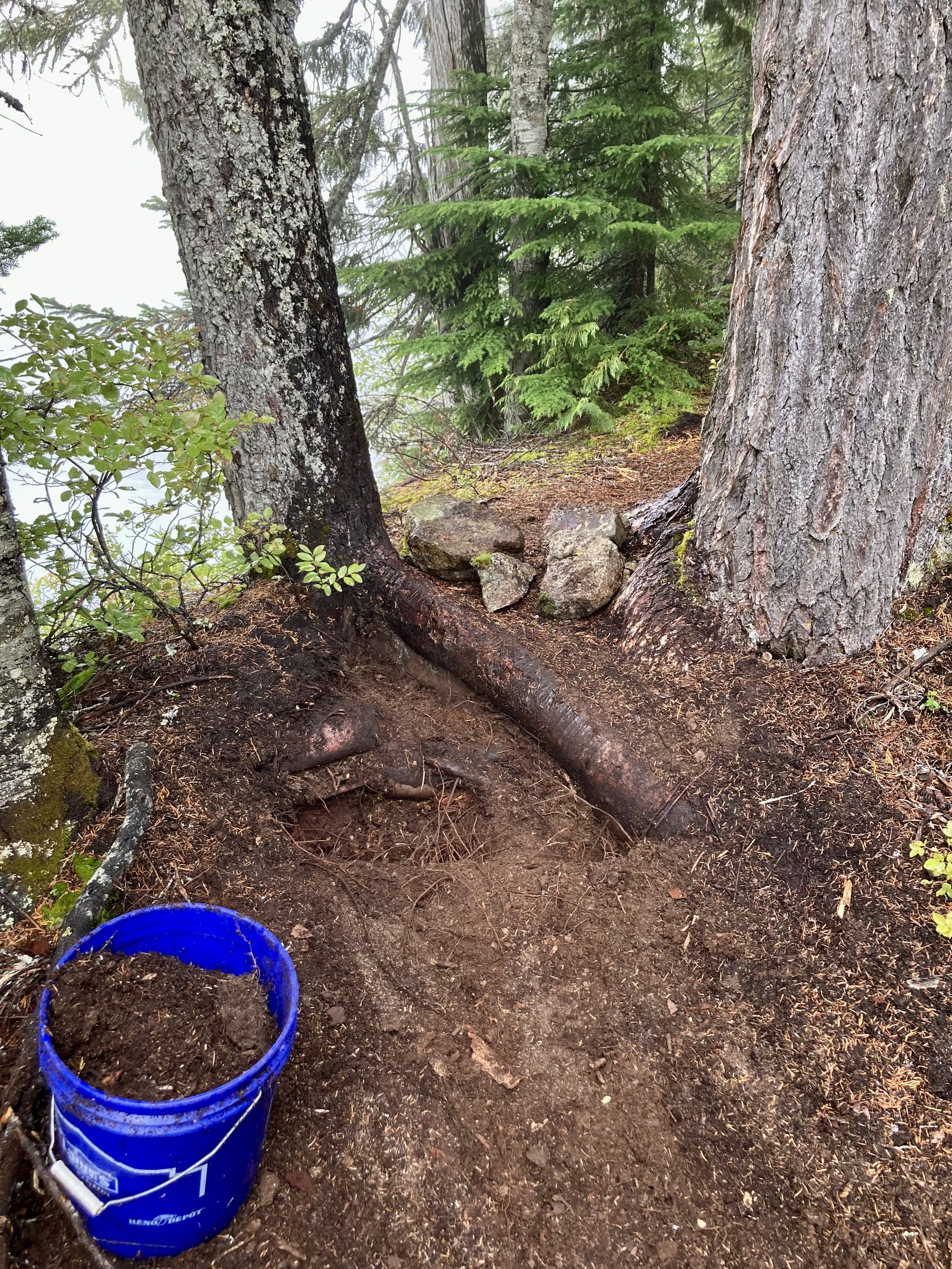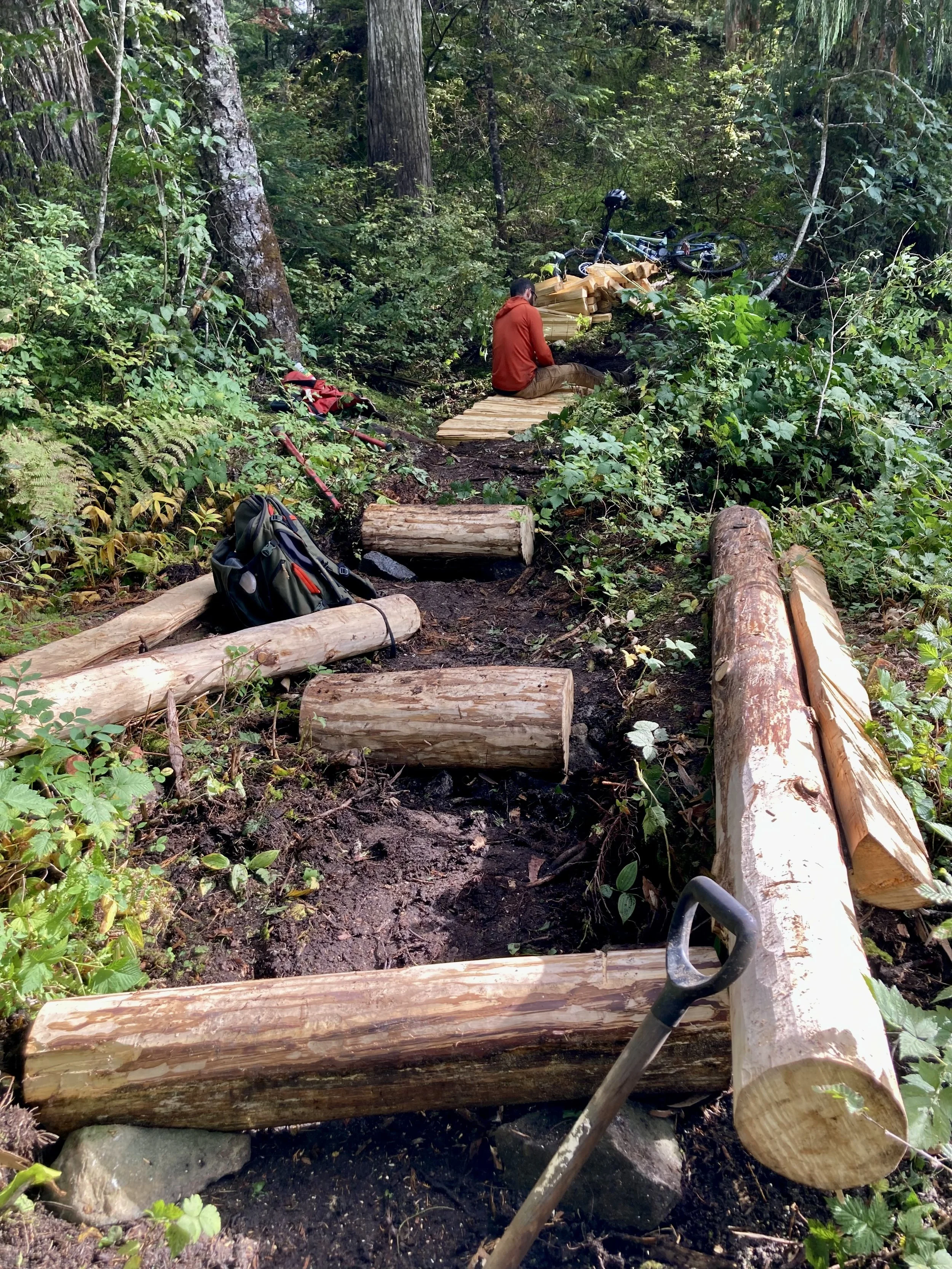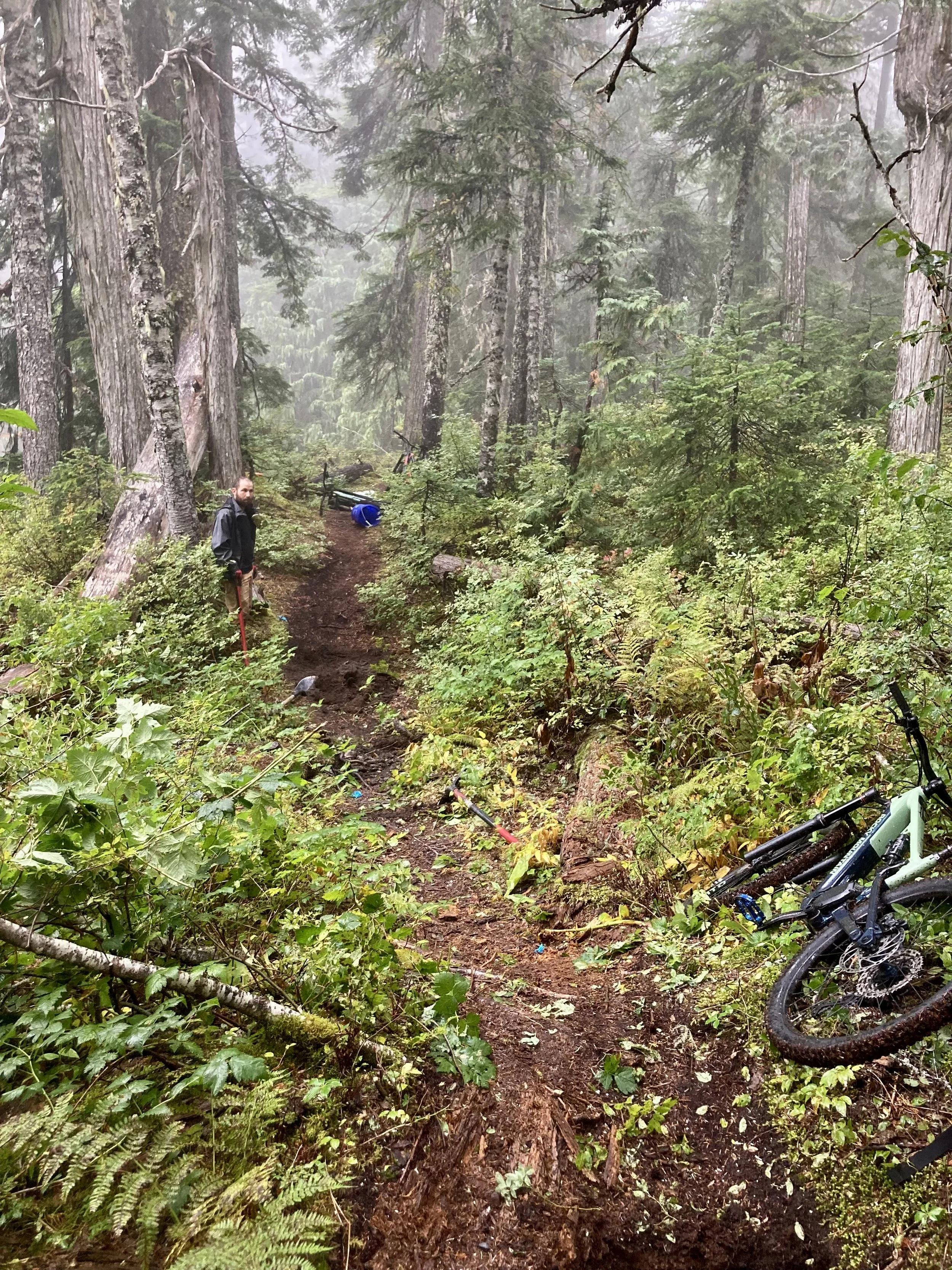 I had been planning this mission for August (when the huckleberries ripen) but the Danimals needed more love than I had anticipated. September up there isn’t bad though: there are less mosquitoes and the mushrooms are popping! We’re bridging seasonal wet spots and armoring roots where we see evidence of tire/pedal damage. It’s important to do everything we can to protect these majestic old growth trees. As Tall Michal cut into a log, the distinctive smell brought back memories of epic battles trying to produce anything resembling a decent piece of decking when we last built bridges in this area. This was Yellow Cedar. It dominates the jane lakes area and tends to burl, twist and curve as it grows; more so than its famous cousin (and the trail crew’s preferred wood supply) Western Red Cedar. “Let’s try this log and see… we can bring the (really) big saw tomorrow if splitting this doesn’t work” I was skeptical. Lo and behold: the first attempt made the most perfect board of the year! What a relief. So far, we’ve built 2 bridges with plans for a few more to add before the snow flies. I can’t believe I just typed that!
