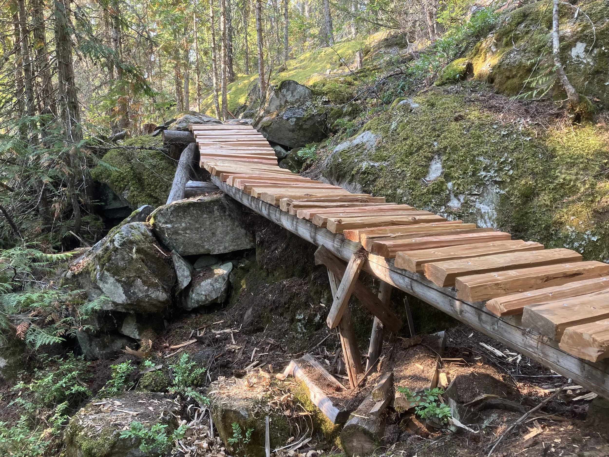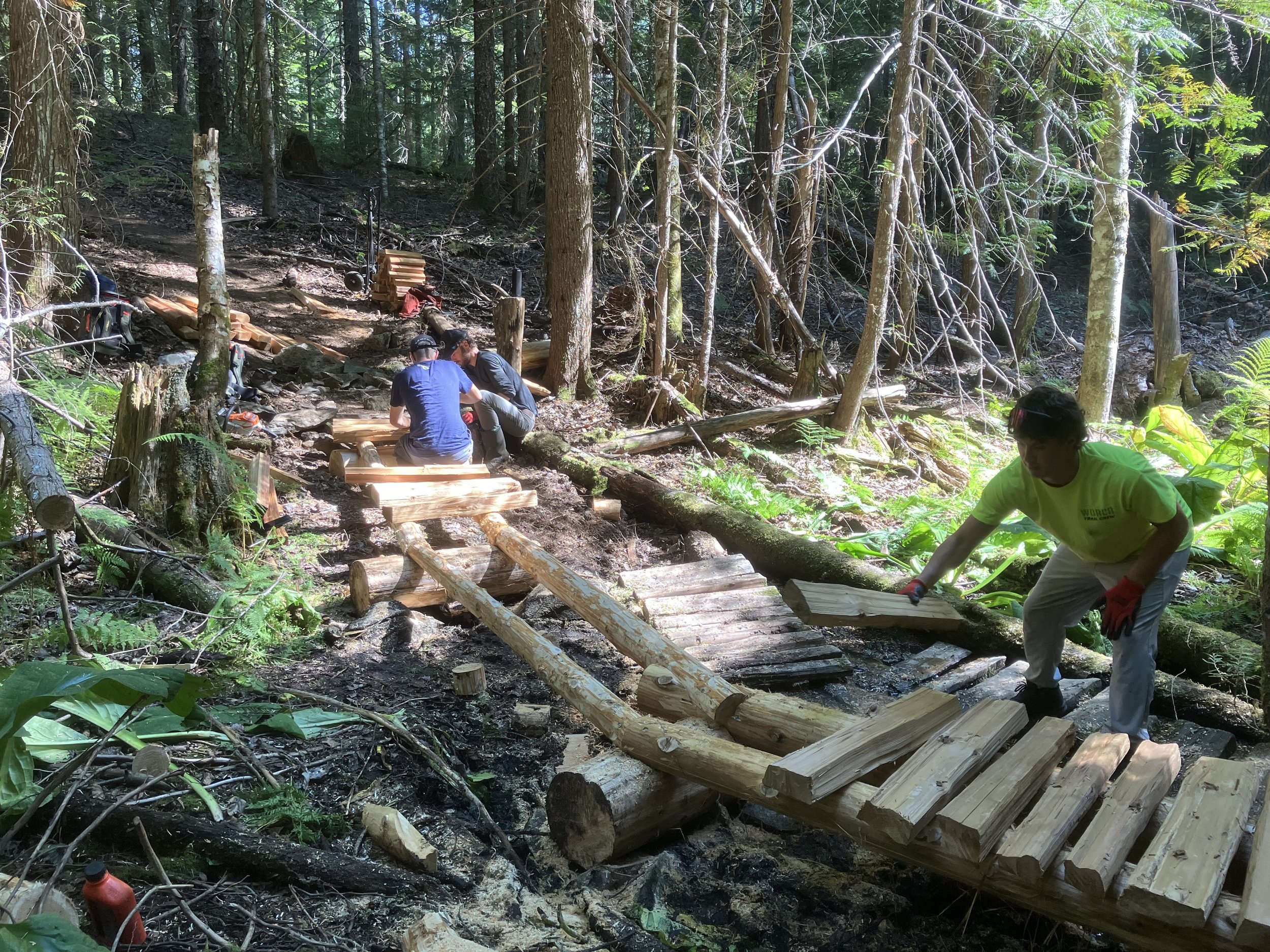 Meanwhile in Whistler: The crew continued with the Ikea bridge assembly program. Most of the action took place on Get Over It where more structures awaited replacement and/or repair. In one case replacing a few pieces of decking turned into a complete rebuild. Our pre-made parts and delivery system is working well: we try to get a structure completely replaced in a day so that we walk away leaving tire-ready projects.