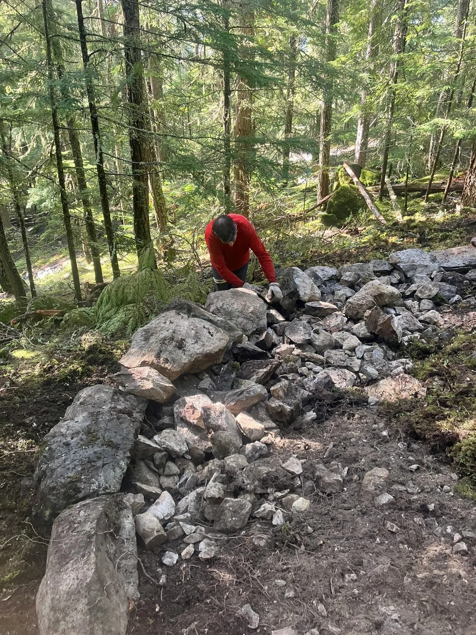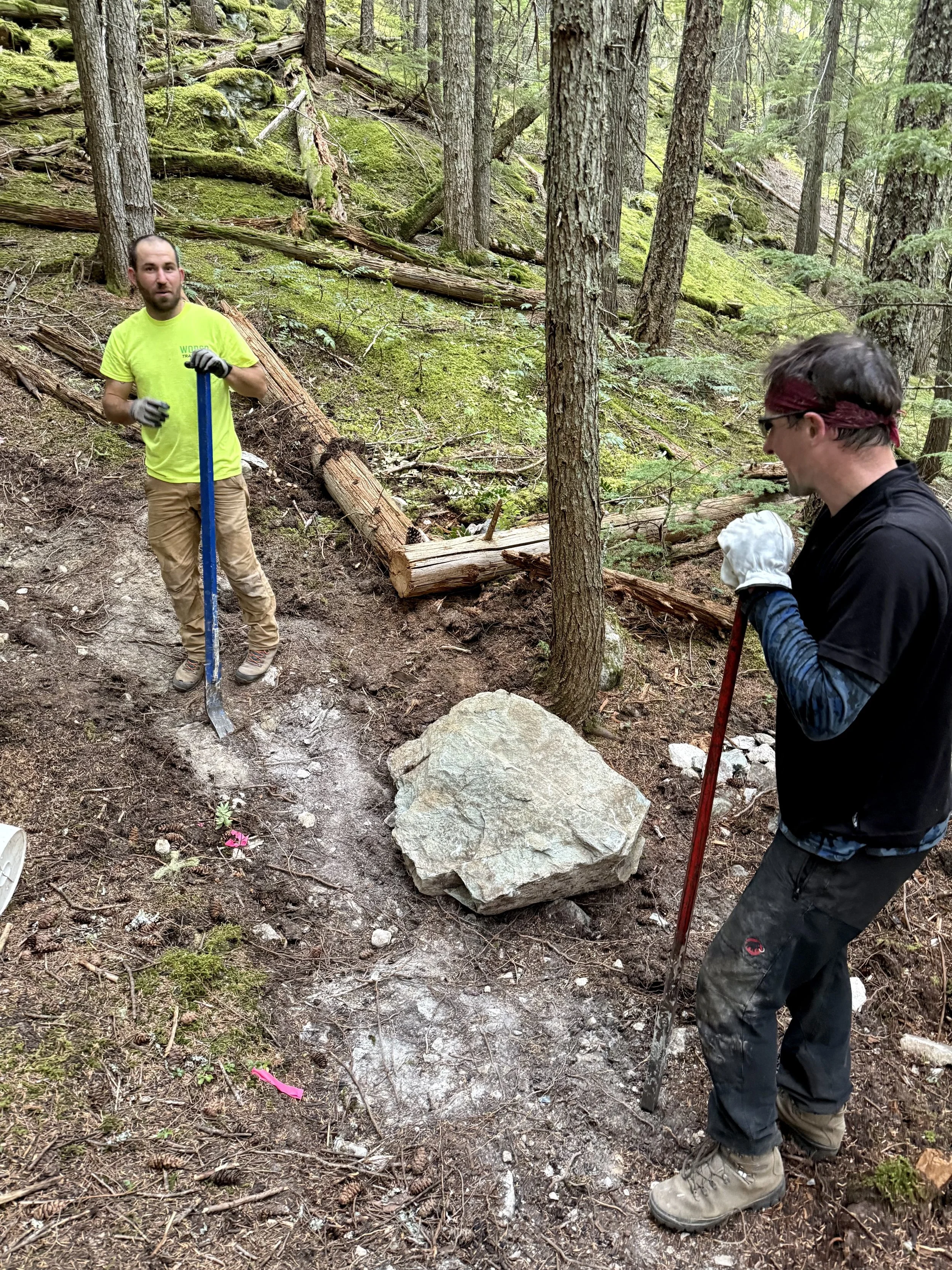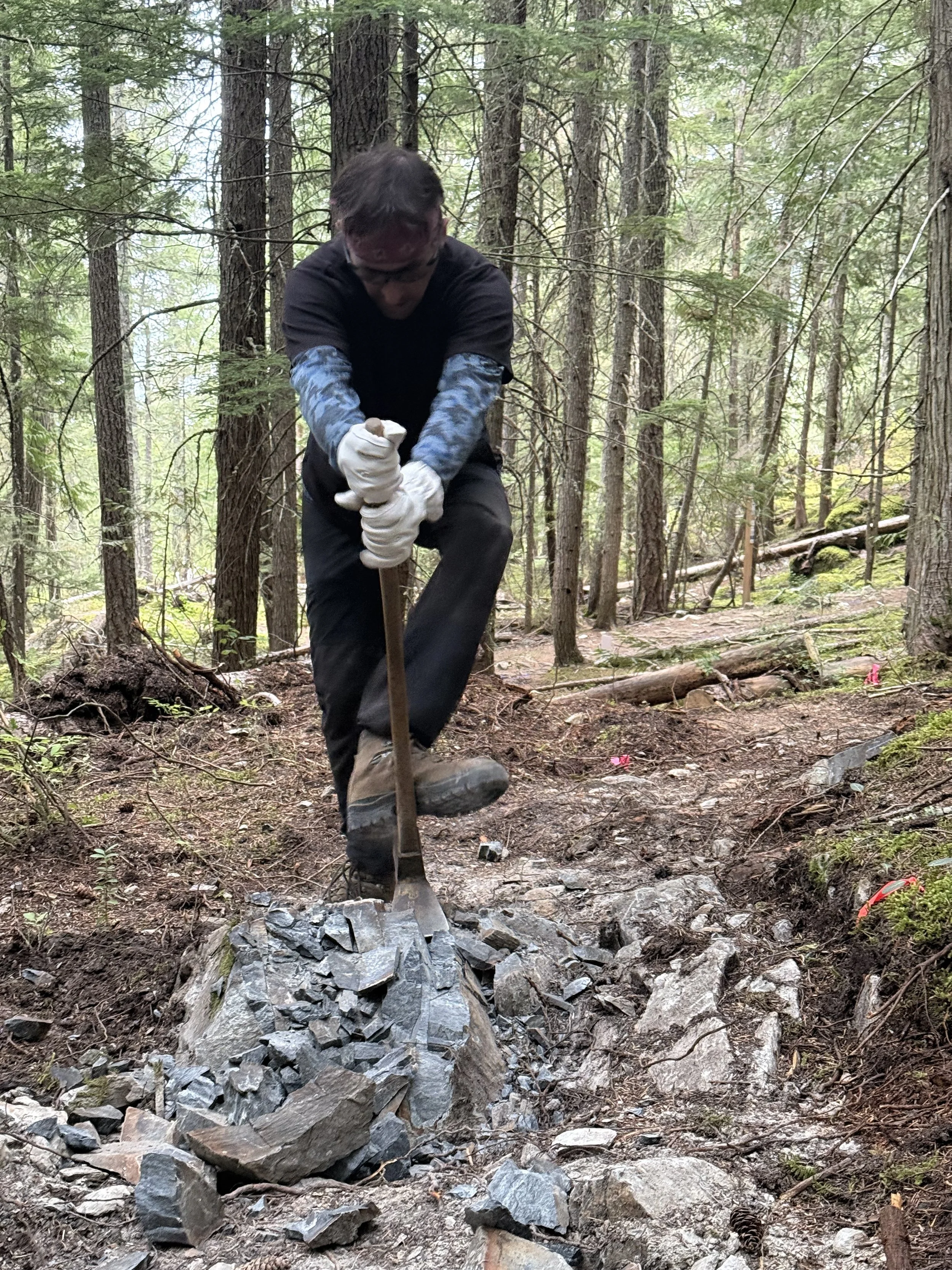 Coast Mountain Trail Running hosted our return to sharing tools and good times. While we’re still waiting for the skies to open up, we again focused on de-duffing (removing the organic layer) and had to hold back from any attempts at shaping or finishing the trail given how dry the ground was. Nevertheless, the work was mysterious and important. “It’s just a bunch of huge rocks under the moss!” said young Brock. Yes it is…Yes it was! After removing countless rocks randomly arranged by the last earthquake or volcanic eruption/landslide/glacier… we began to re-organize them, framing our smooth new line. The trail crew, once again supported by honourary member and “large rock aficionado” Rob Mullen, spent the rest of the week building the crux of this project. Rob put his “sledge-adze” to work destroying some bedrock nubs on the approach, as we pulled and stacked a few tonnes of rock to create enough space for one smooth turn through the steep landscape.