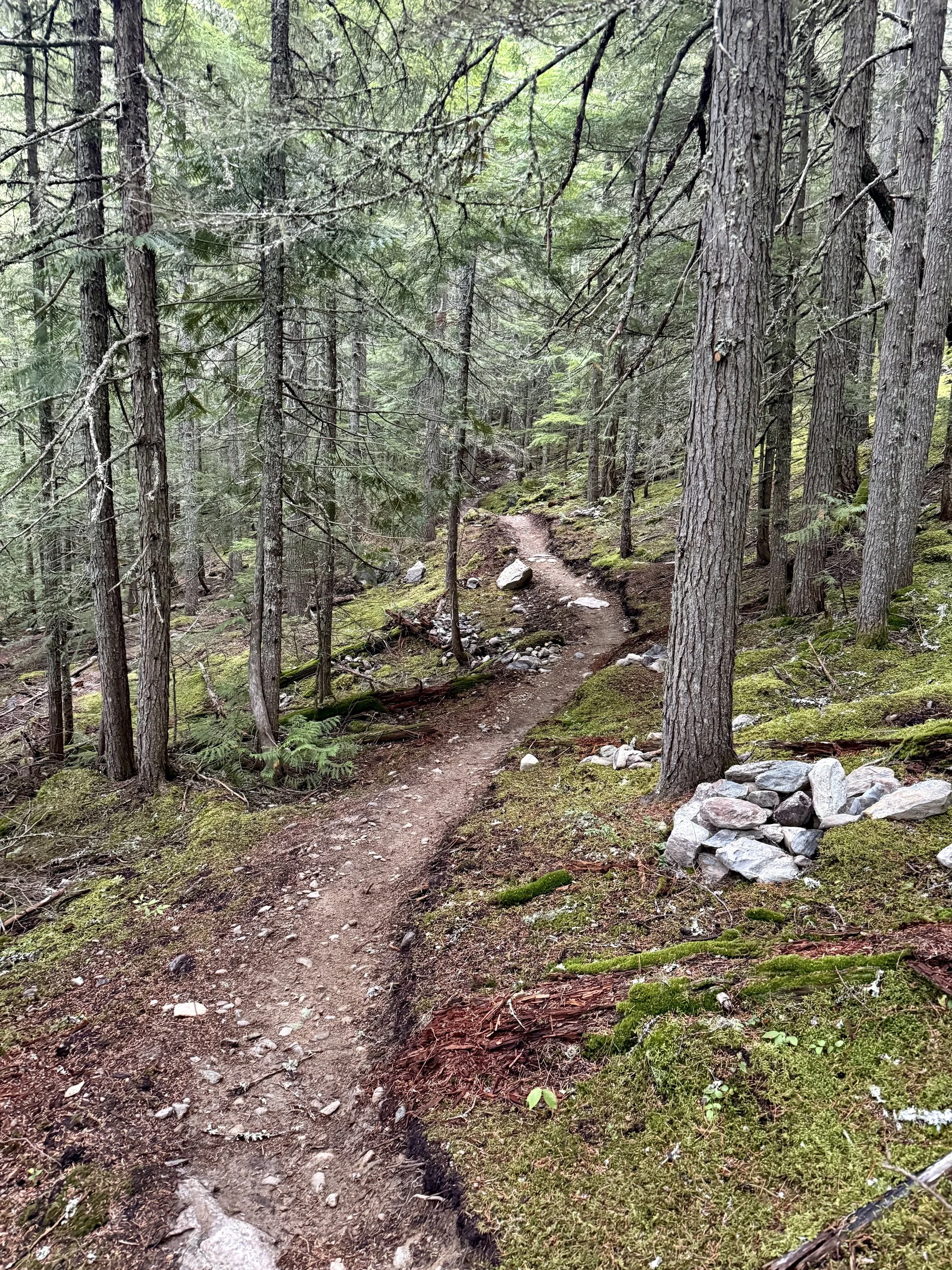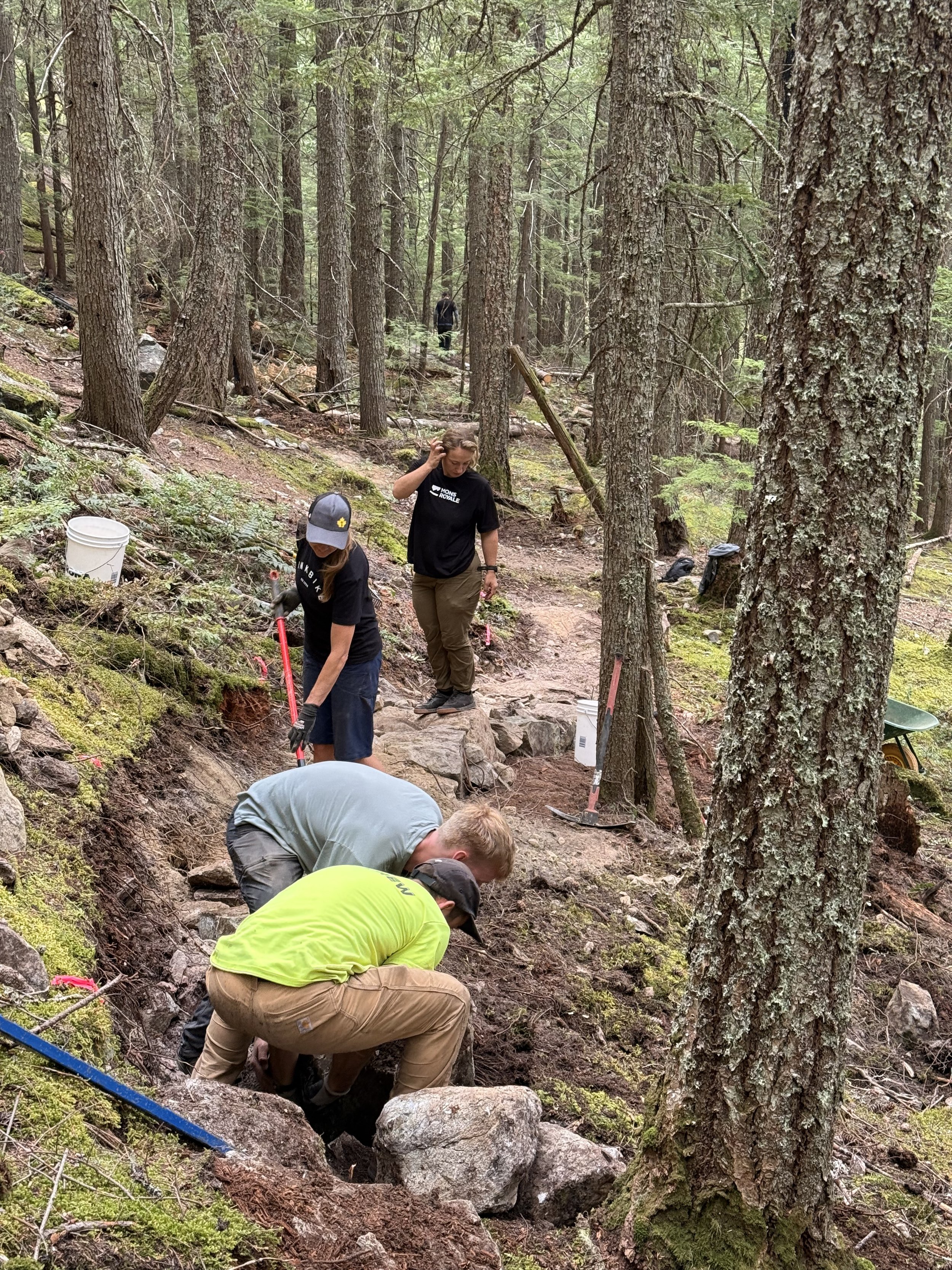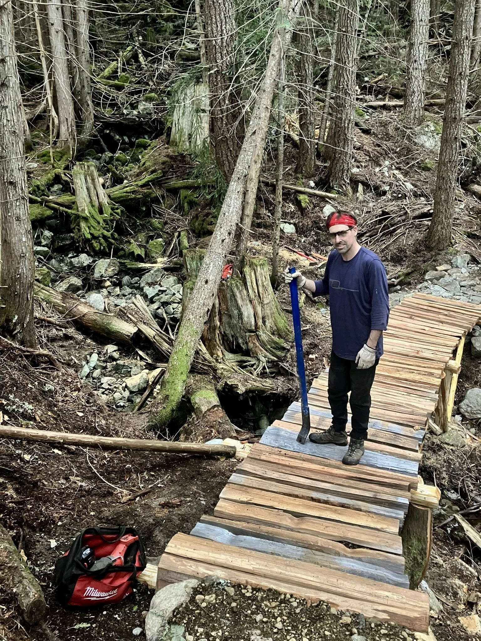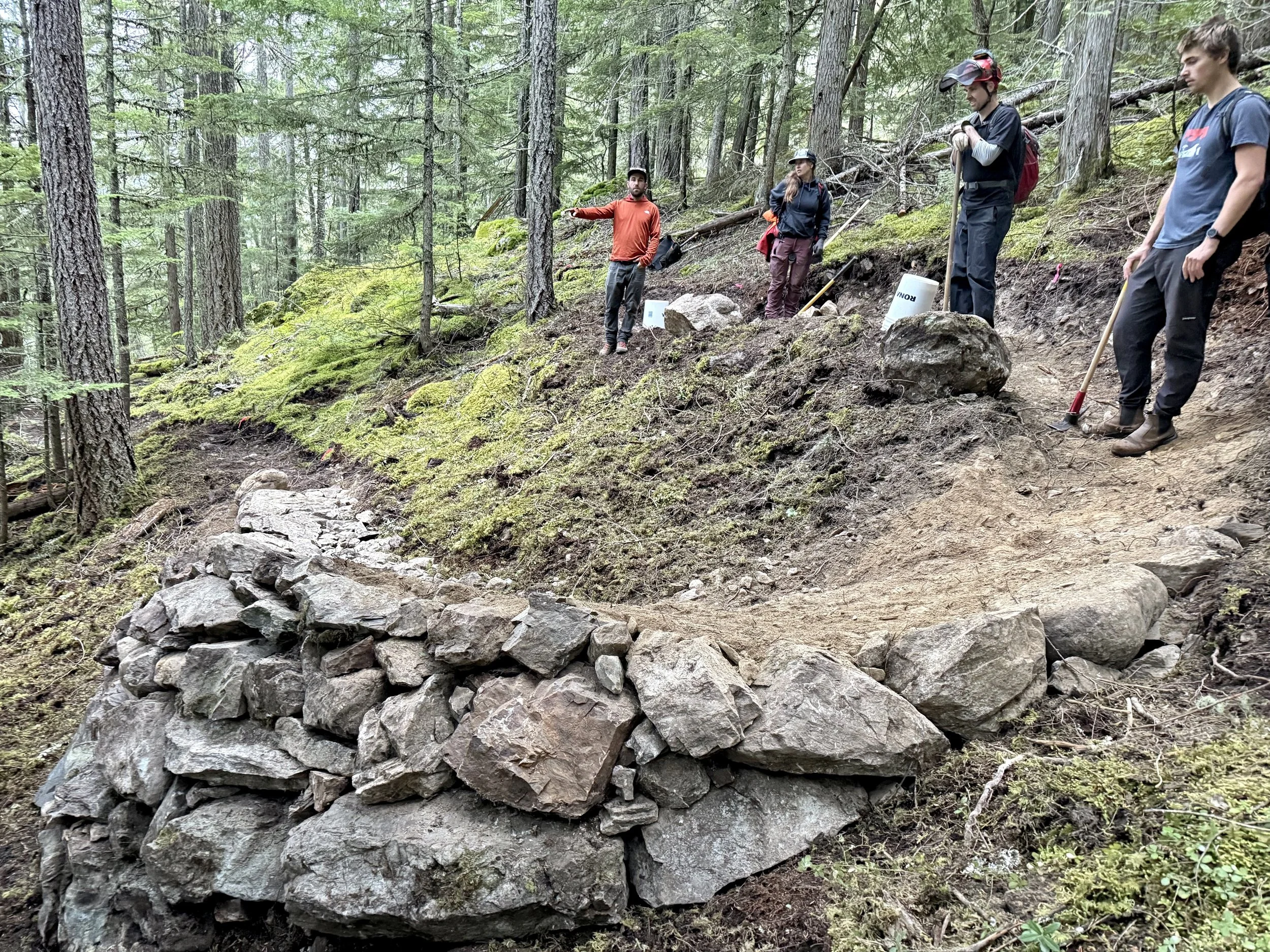 Coast Mountain Trail Running hosted our return to sharing tools and good times. While we’re still waiting for the skies to open up, we again focused on de-duffing (removing the organic layer) and had to hold back from any attempts at shaping or finishing the trail given how dry the ground was. Nevertheless, the work was mysterious and important. “It’s just a bunch of huge rocks under the moss!” said young Brock. Yes it is…Yes it was! After removing countless rocks randomly arranged by the last earthquake or volcanic eruption/landslide/glacier… we began to re-organize them, framing our smooth new line. The trail crew, once again supported by honourary member and “large rock aficionado” Rob Mullen, spent the rest of the week building the crux of this project. Rob put his “sledge-adze” to work destroying some bedrock nubs on the approach, as we pulled and stacked a few tonnes of rock to create enough space for one smooth turn through the steep landscape.