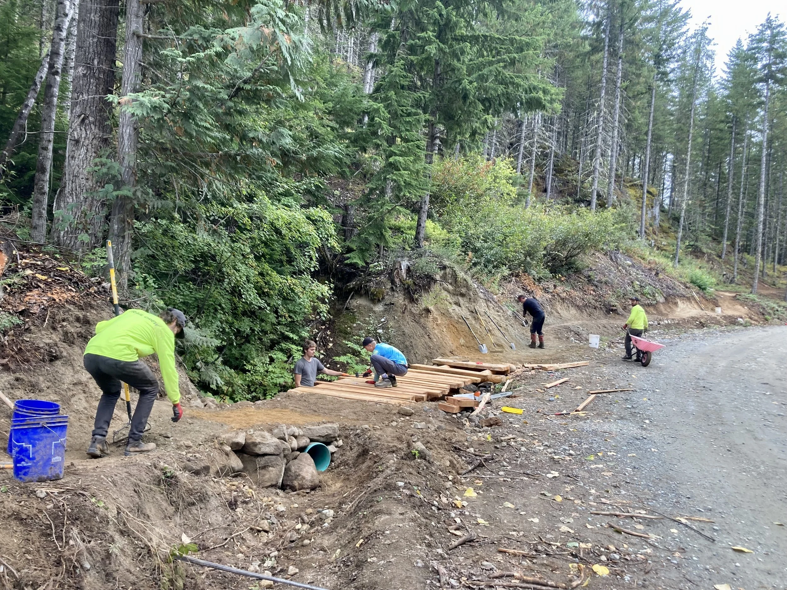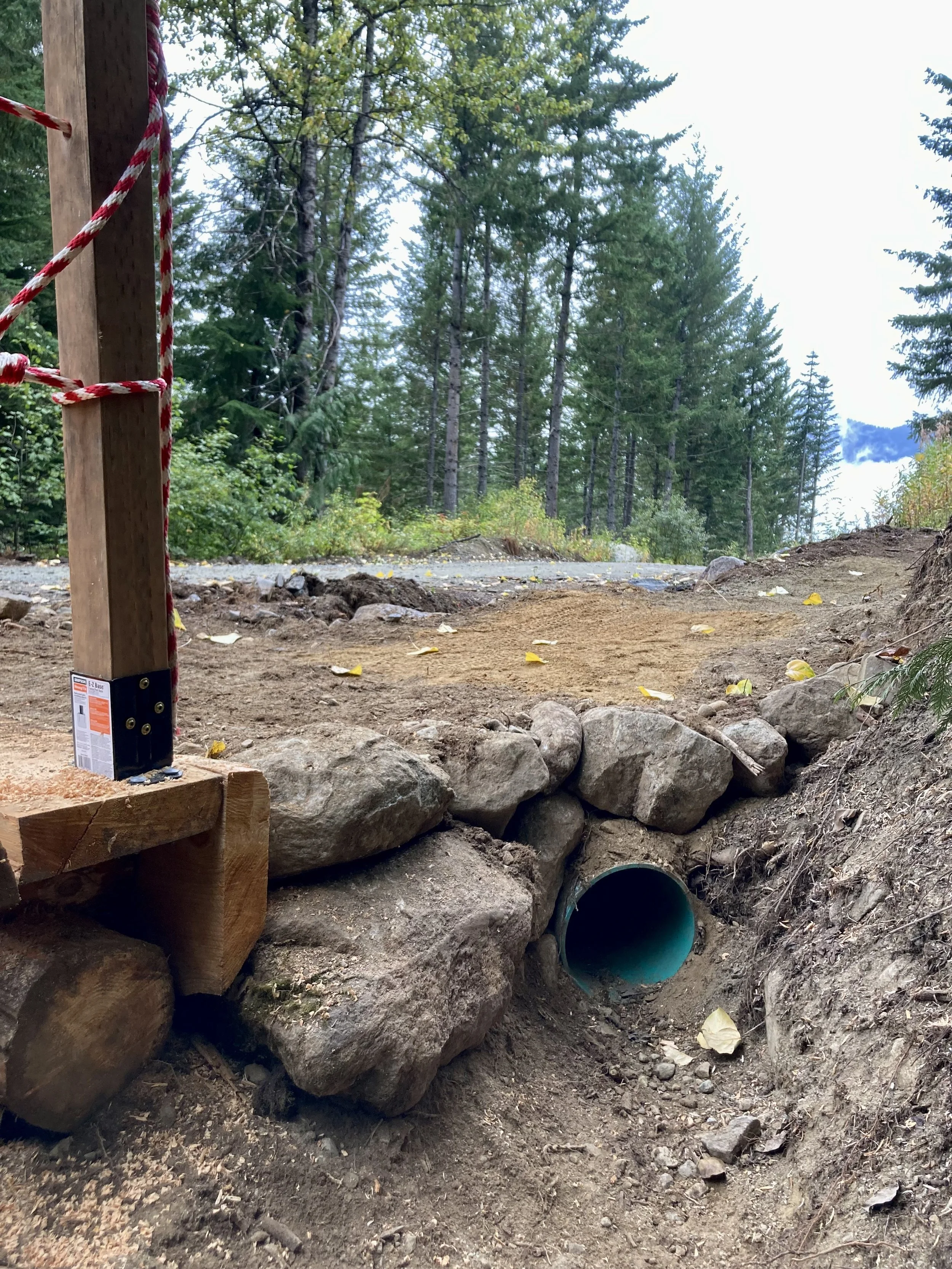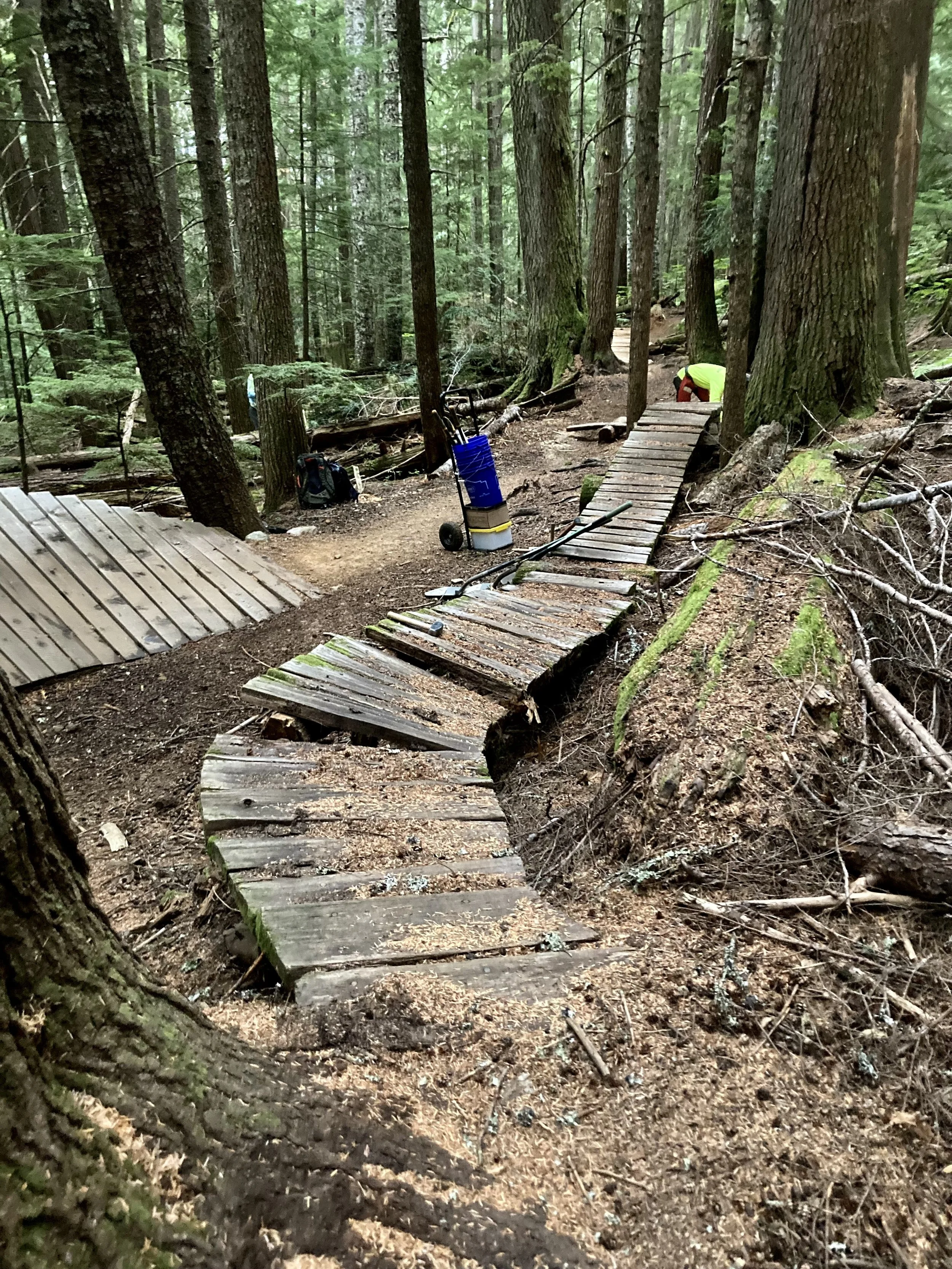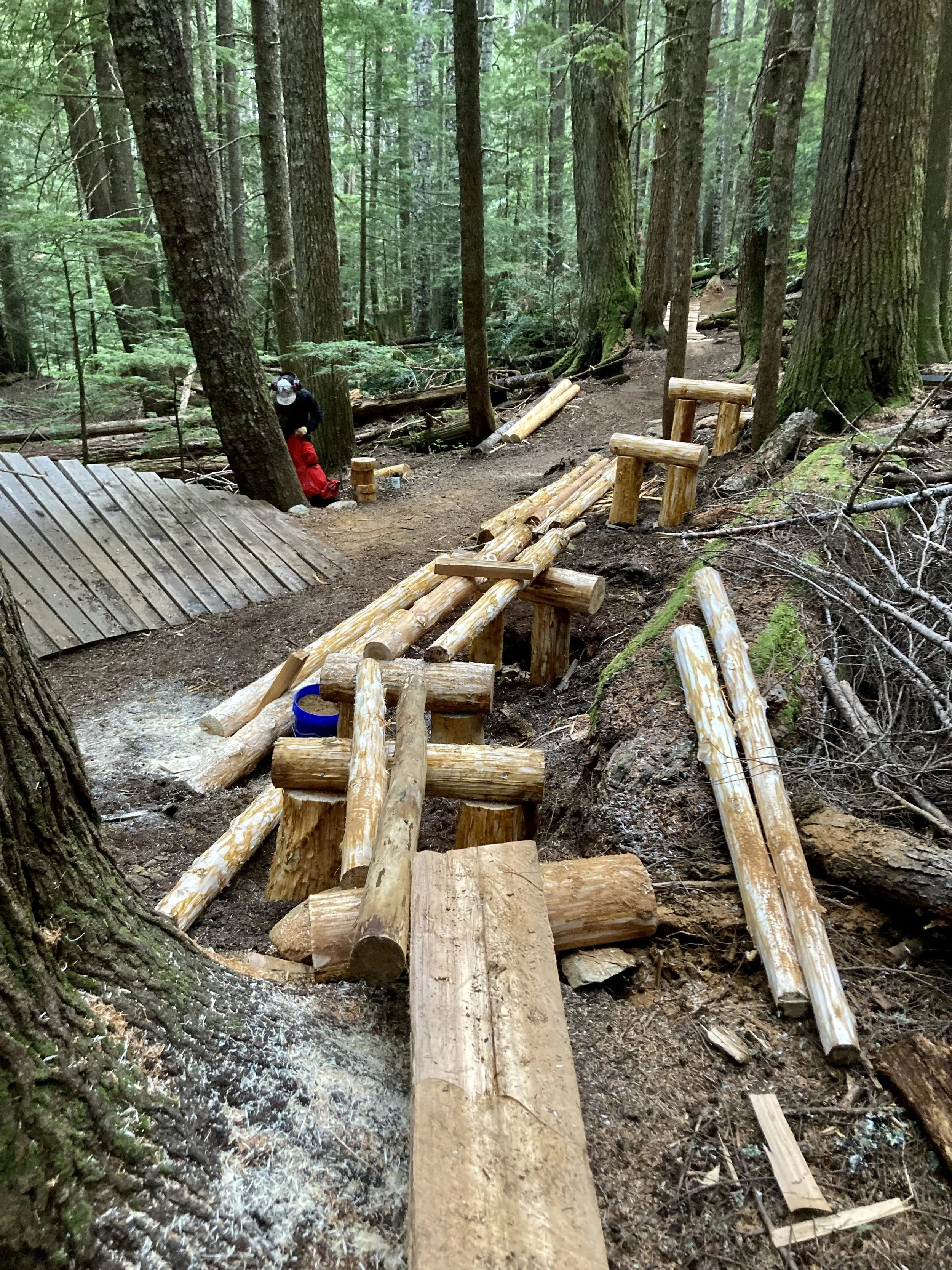 Last week’s project in A River Runs Through It had a lot of spare parts leftover when we headed home for the weekend. Instead of adding this stash to my growing list of “parts locations”, I thought we might as well assemble something right away. There were a few more defunct stunts to decommission in that section of trail so we tallied the lot and chose to upgrade an old line. It’s an optional feature that’s a little longer and higher than what was there before.