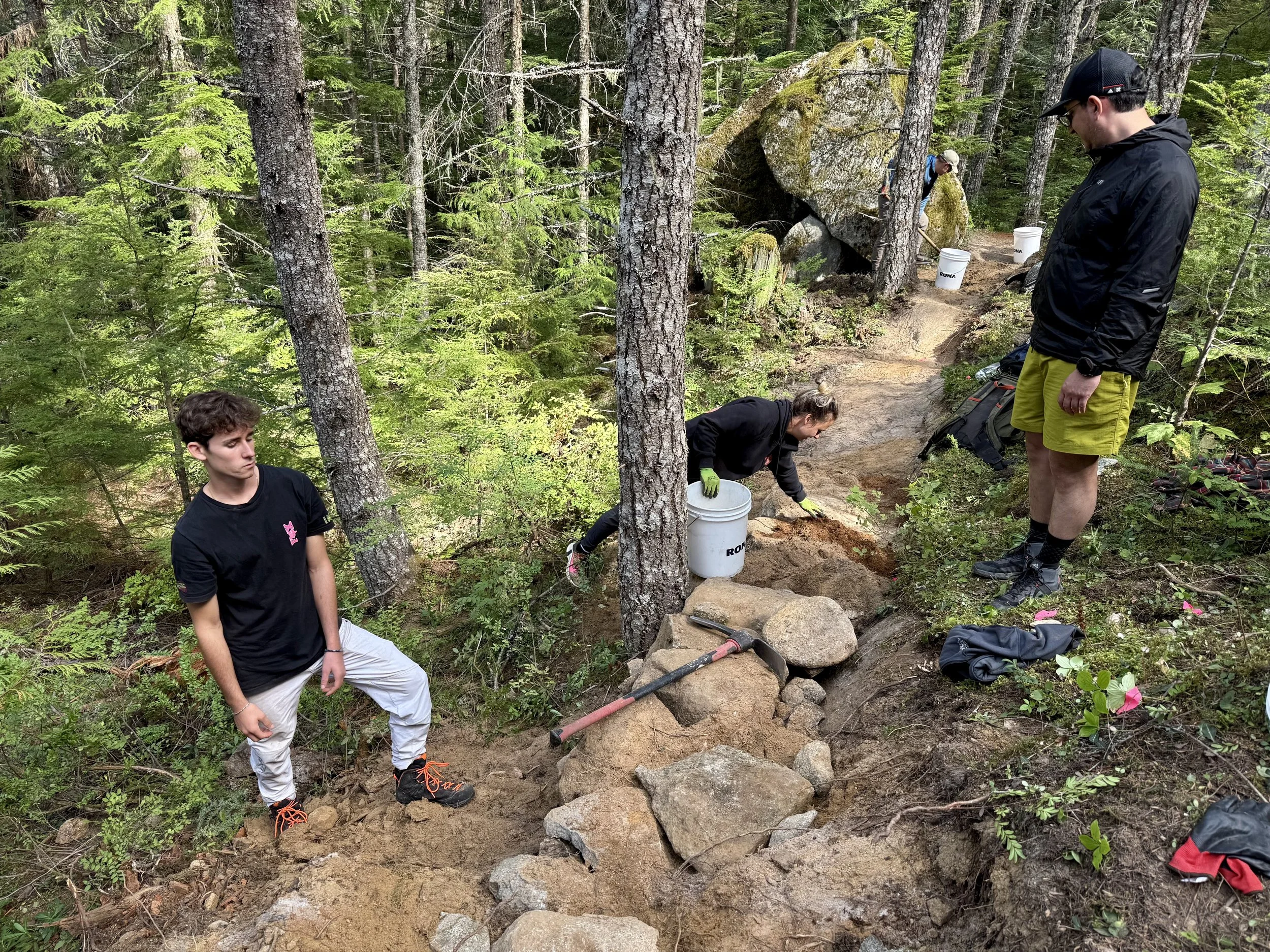 Already? It is for my Whistler Adventure School students! They just finished this fall’s Sustainable Trail Building course. This session’s field work started with a bypass on Upper Business Time. We studied line selection, practiced benching while solving a punchy climb and water damage. “It’s all downhill now!” Rockwork and trail finishing was studied on the Rock Rabbit Elongated Experience…still doesn’t sound quite right. Bridge Building techniques took place on “Old Trainwreck”, by the highway. Coincidentally, that bridge represents the unofficial ground breaking on the Mystic-Function blue descent (which also needs a better name, by the way). That trail will ultimately lead riders to our solid new bridge, and all of the goodies available in Function Junction!