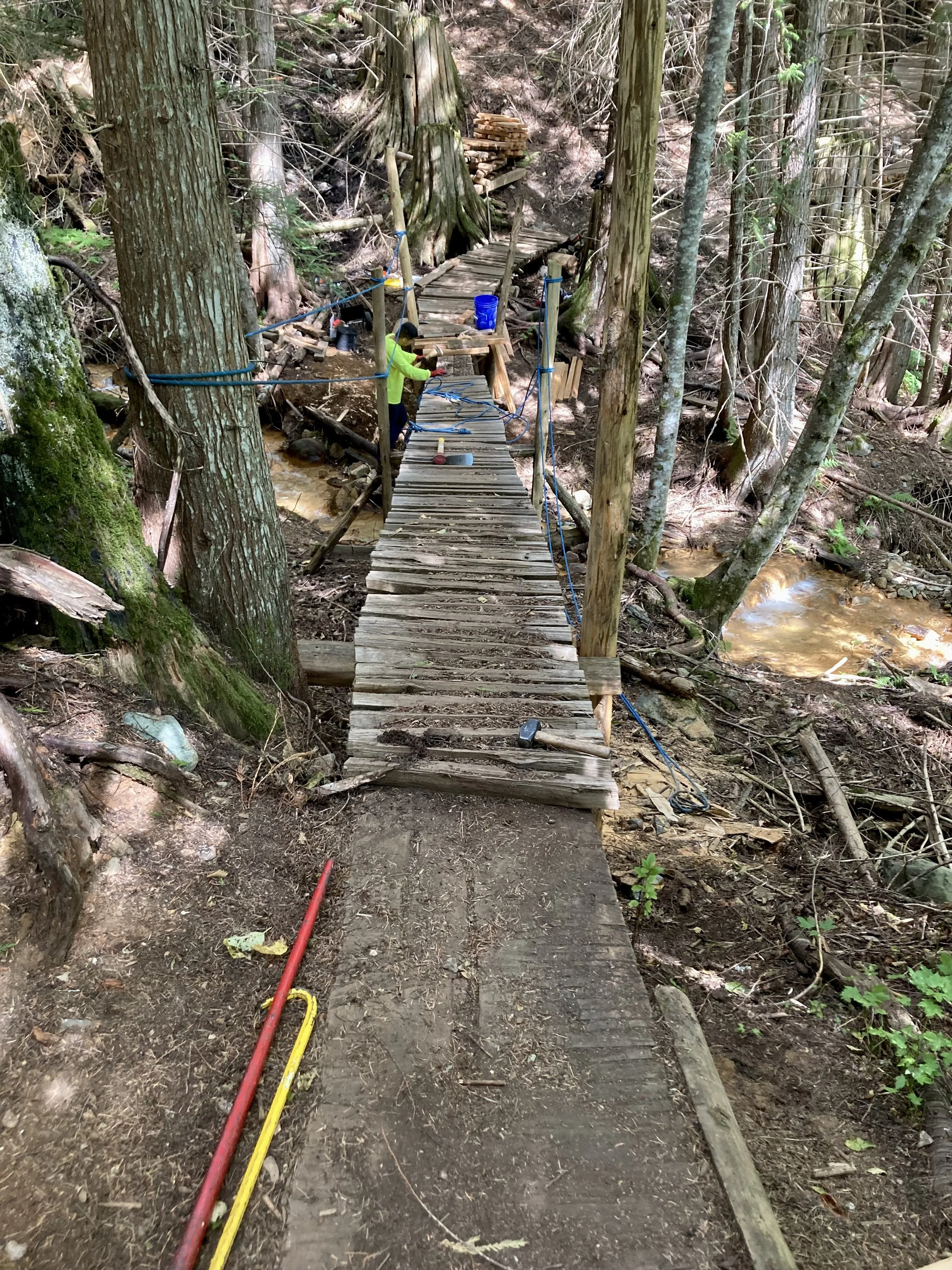 Across the road, there was one last project left to complete on Get Over It: propper railings for the high creek crossing. The previous rope set-up was so low that it looked more like “fall enhancer” than fall protection.... We used leftover cedar from last week’s projects to raise the rope lines. We also installed some wider decking and improved the approach for good measure. I have many tricks up my sleeve for improvised carpentry but I needed to re-invent the wheel when it came to securing the ropes. It made me miss Adam (he went back to university) for his internet tutorial savviness. Strangely, as soon as I opened youtube after work, the first video suggested was a knot tying tutorial!