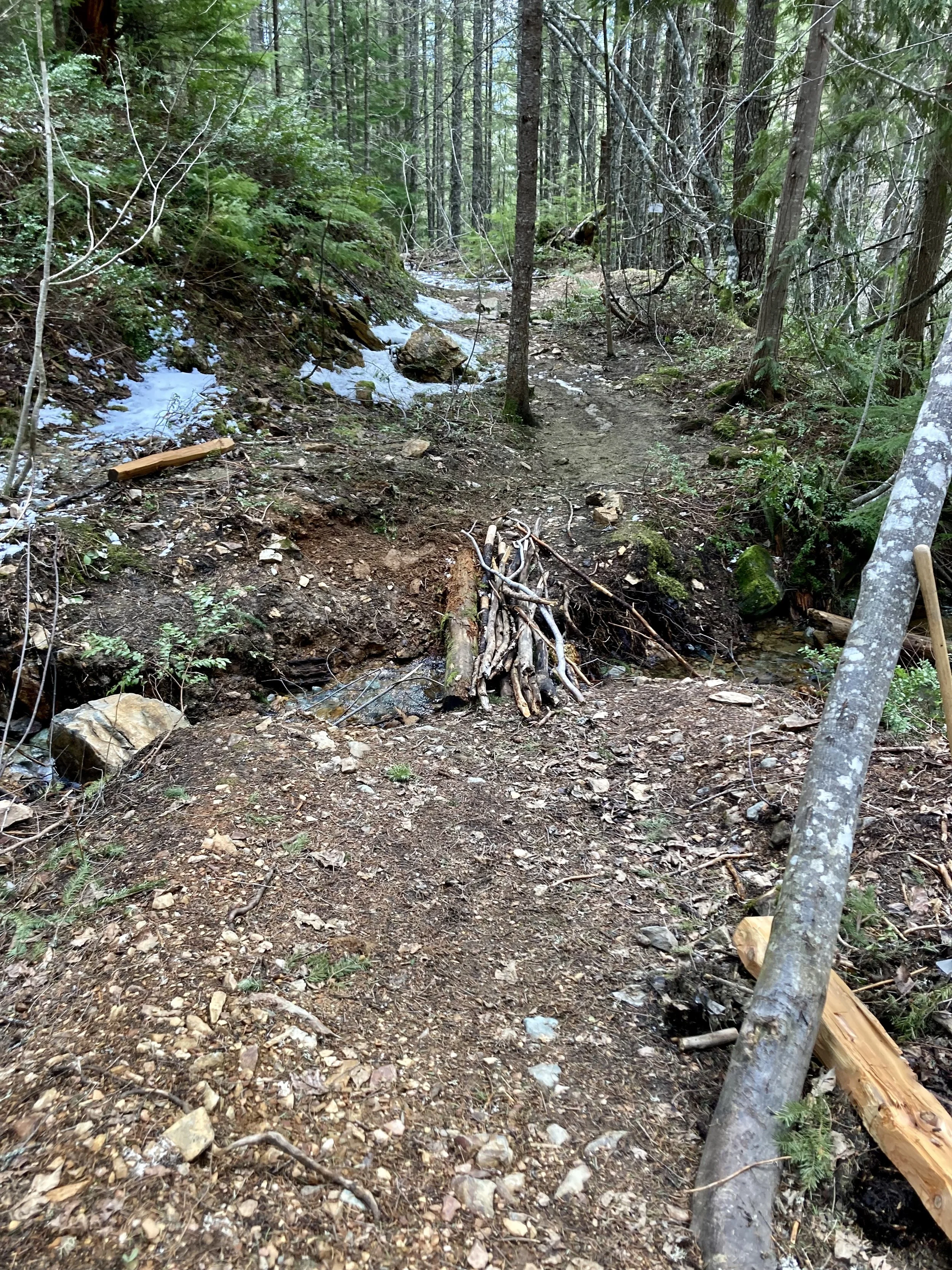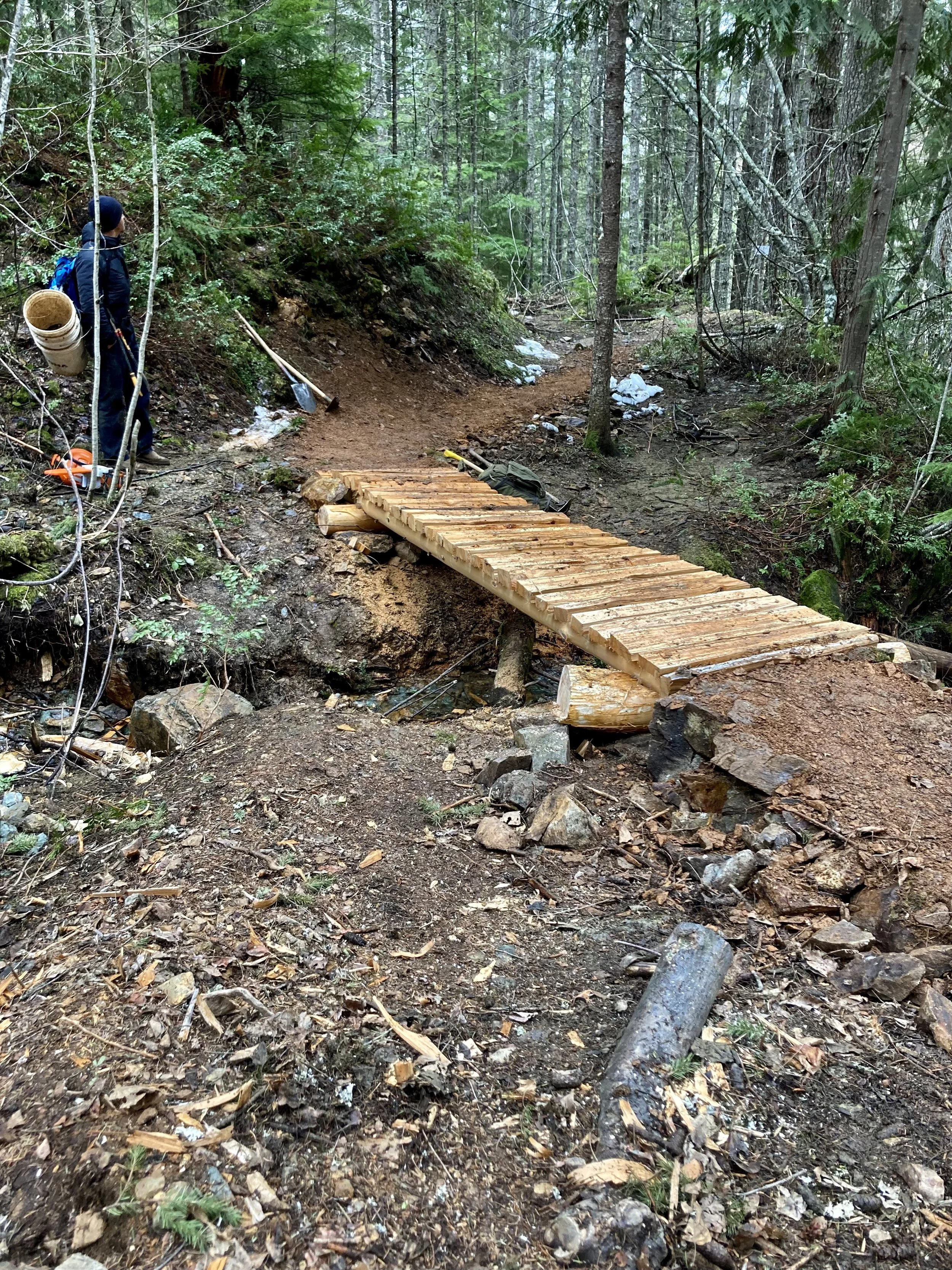 We first got AM/PM rideable (more work to come) and then built a bridge over one of the newer creeks impeding No View. The roadway ditch crossing will get a culvert installed as soon as possible…