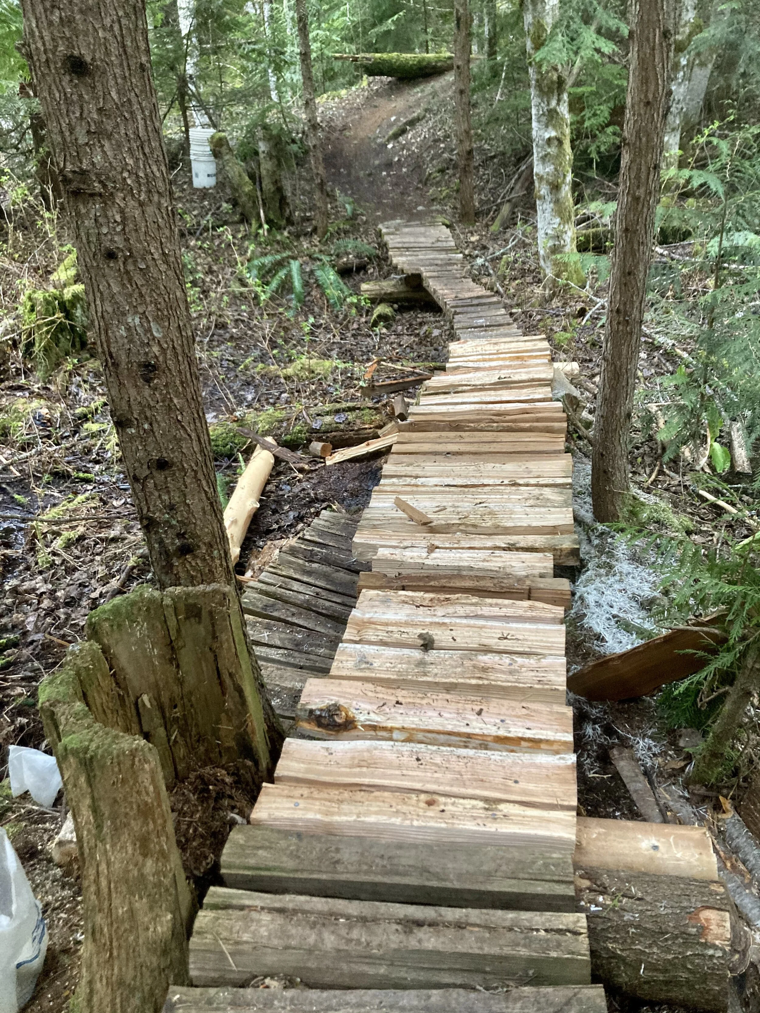 Next, we repaired the broken bridges on Garbage and Trainwreck. Quality decking cedar was harder to find than graffiti or toilet paper around there… seriously. Angry face.