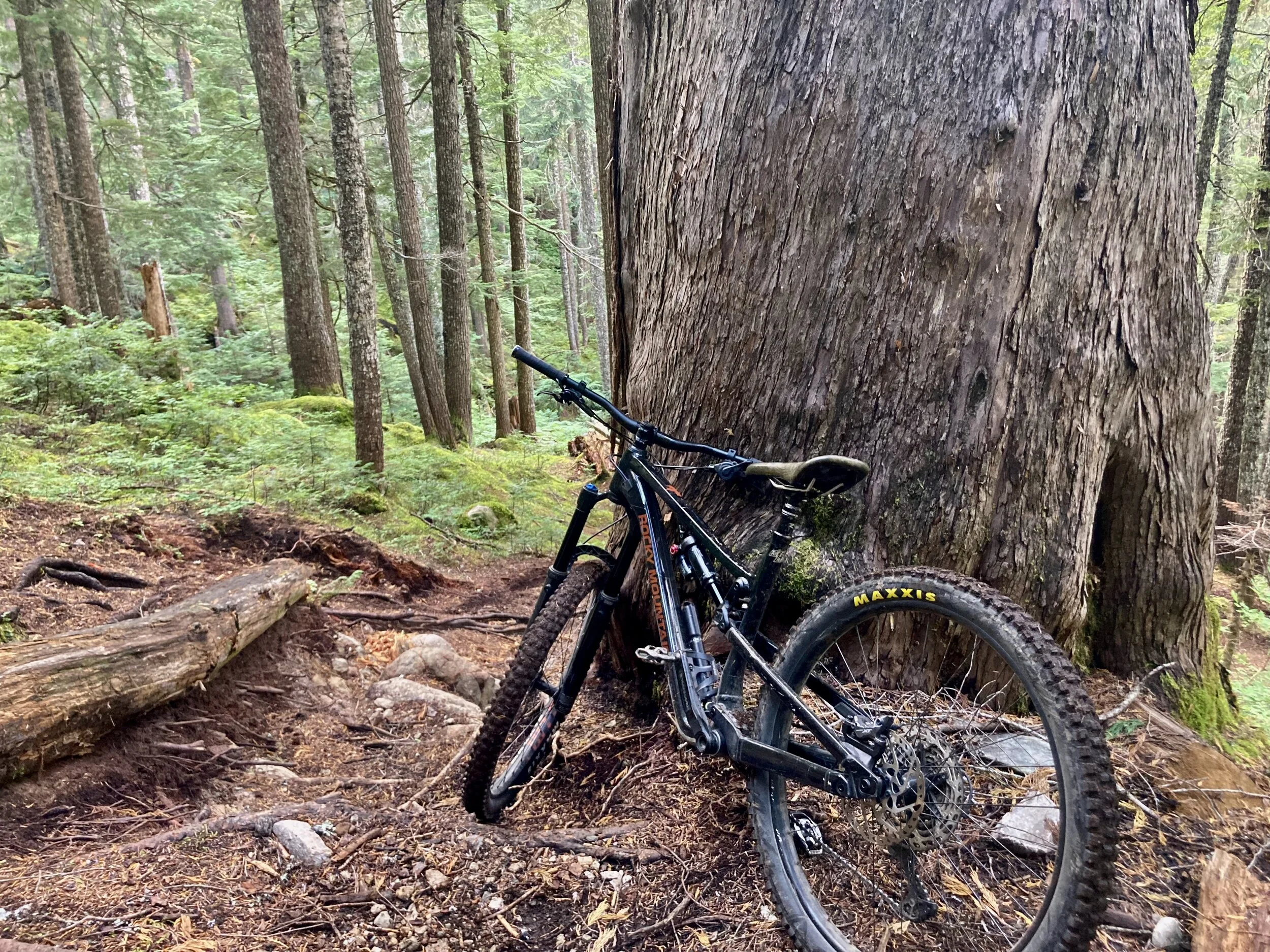 The rest of us continued up through the massive Douglas Firs upgrading Baby Snakes. The narrow bench showed evidence of tires leaving the trail… into the creek waaaaayyyyy down below!