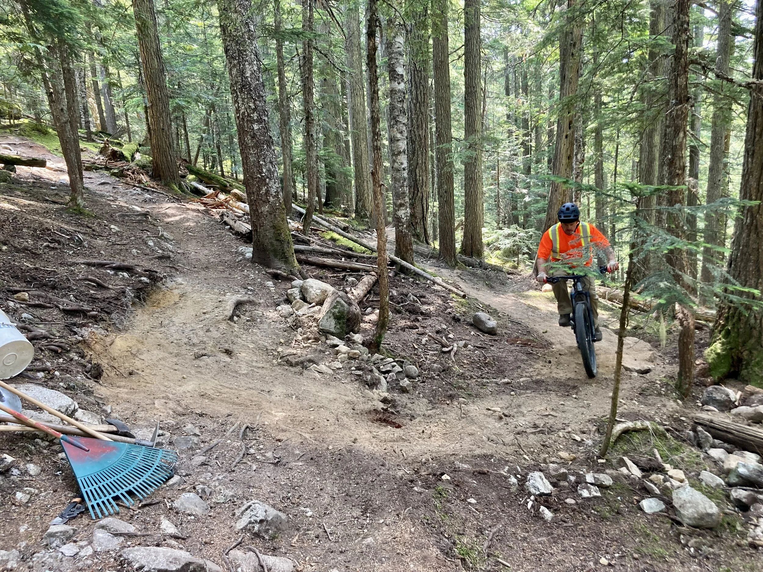 Performing spot repairs is not easy when conditions are bone dry (plus the added burden of lugging fire suppression equipment long distances between projects) so we continued the theme of “improving connectivity” in the lower Sproatt area. First, we gave Rock Rabbit a proper connection to THC, then, we completed the Working Class exit chute ride-around (Pat calls it “Hardly Working”...).