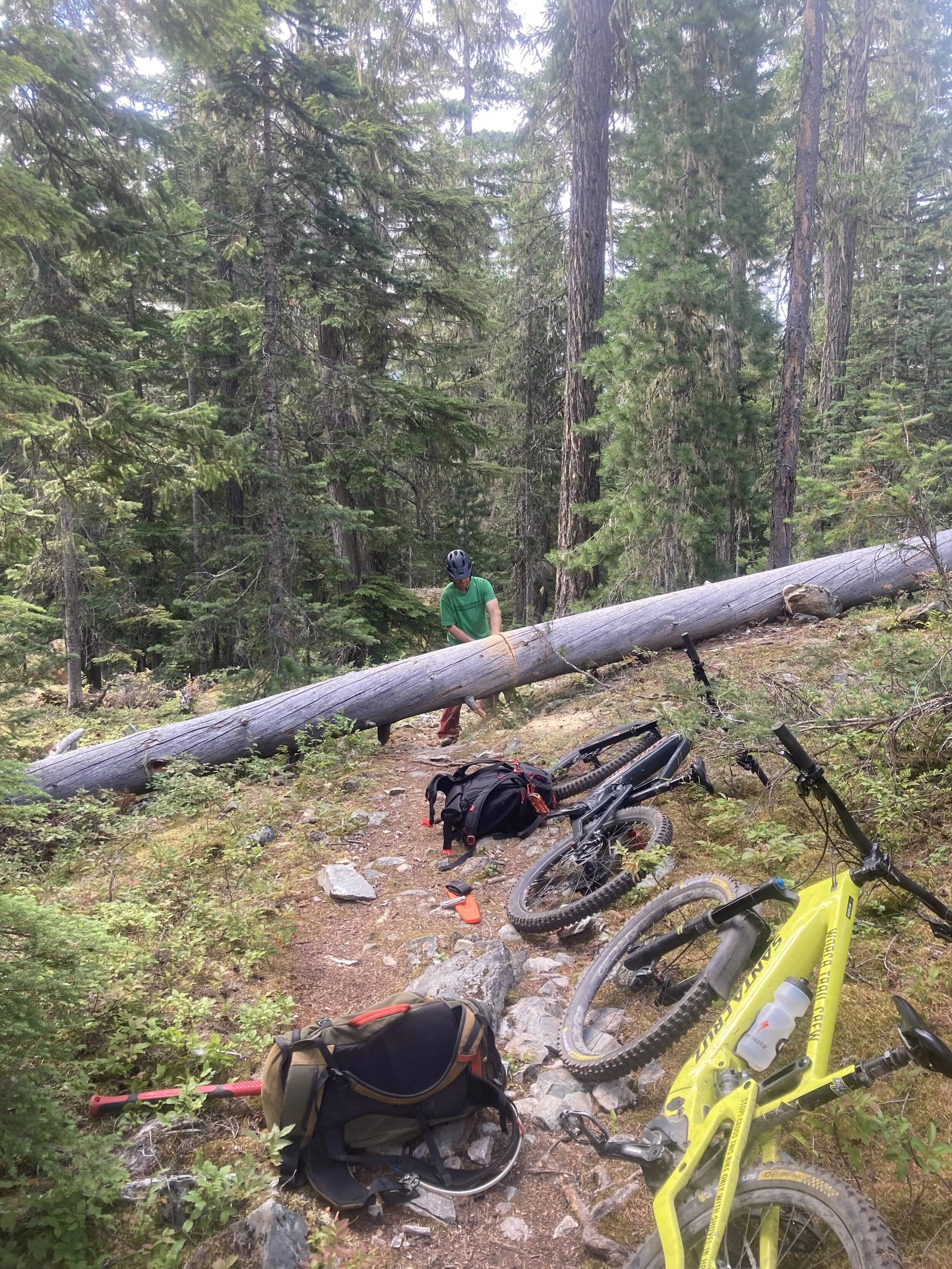 The kind folks at Santa Cruz stepped up their support for the trail crew (again!) by donating another Heckler e-bike to help us get our tools to far-away locations. The timing of new-bike and new-rain was perfect. My inbox has been filled by local shredders nagging me to clear Zanarchy and Gargamel. One of Whistler’s most engaging double black trails, covered in large windfall trees. I sent Pat and Benoit on this expert riding and cutting mission. Both the bikes and electric chainsaw excelled. I suppose the riders fared well too…