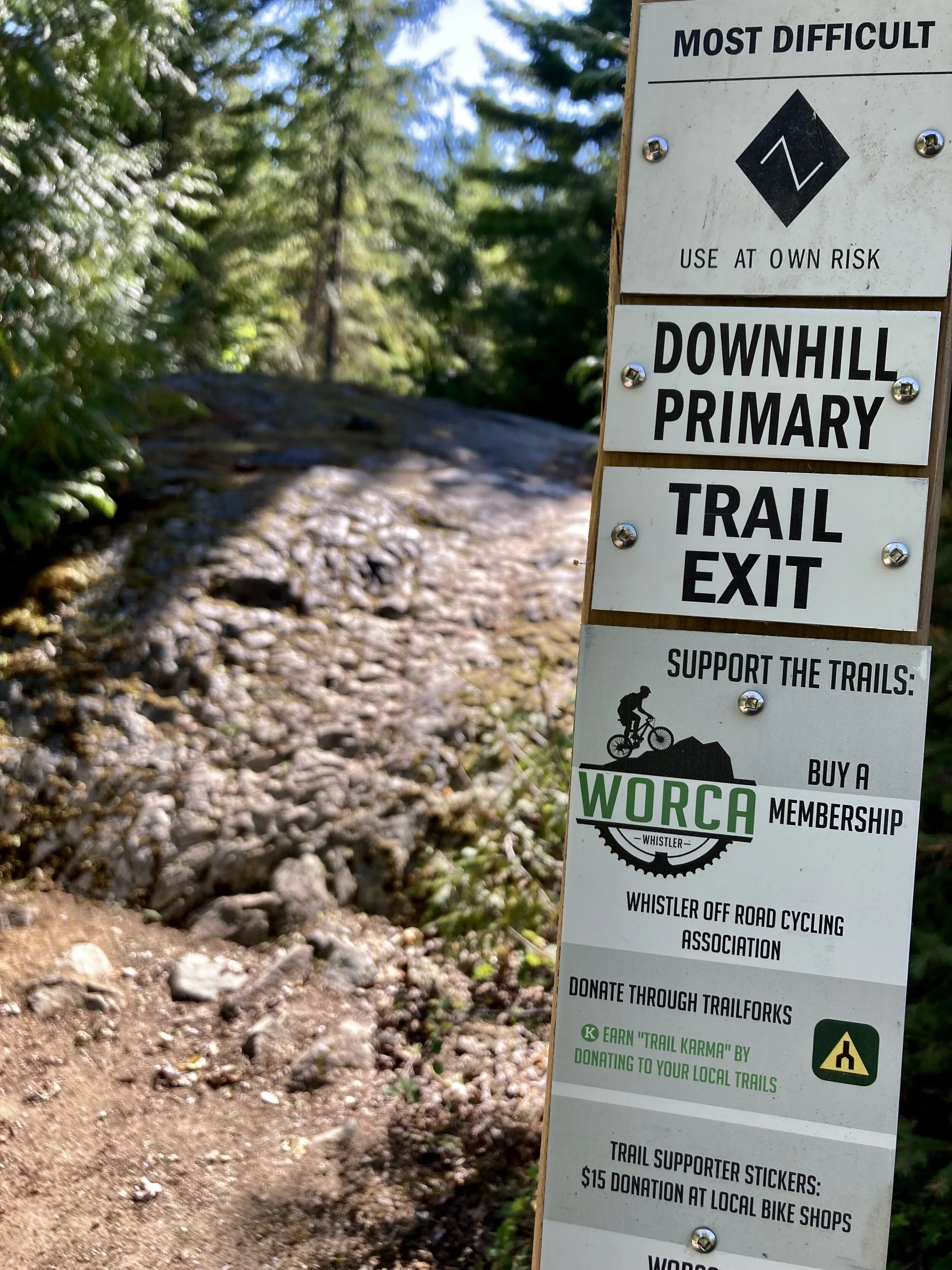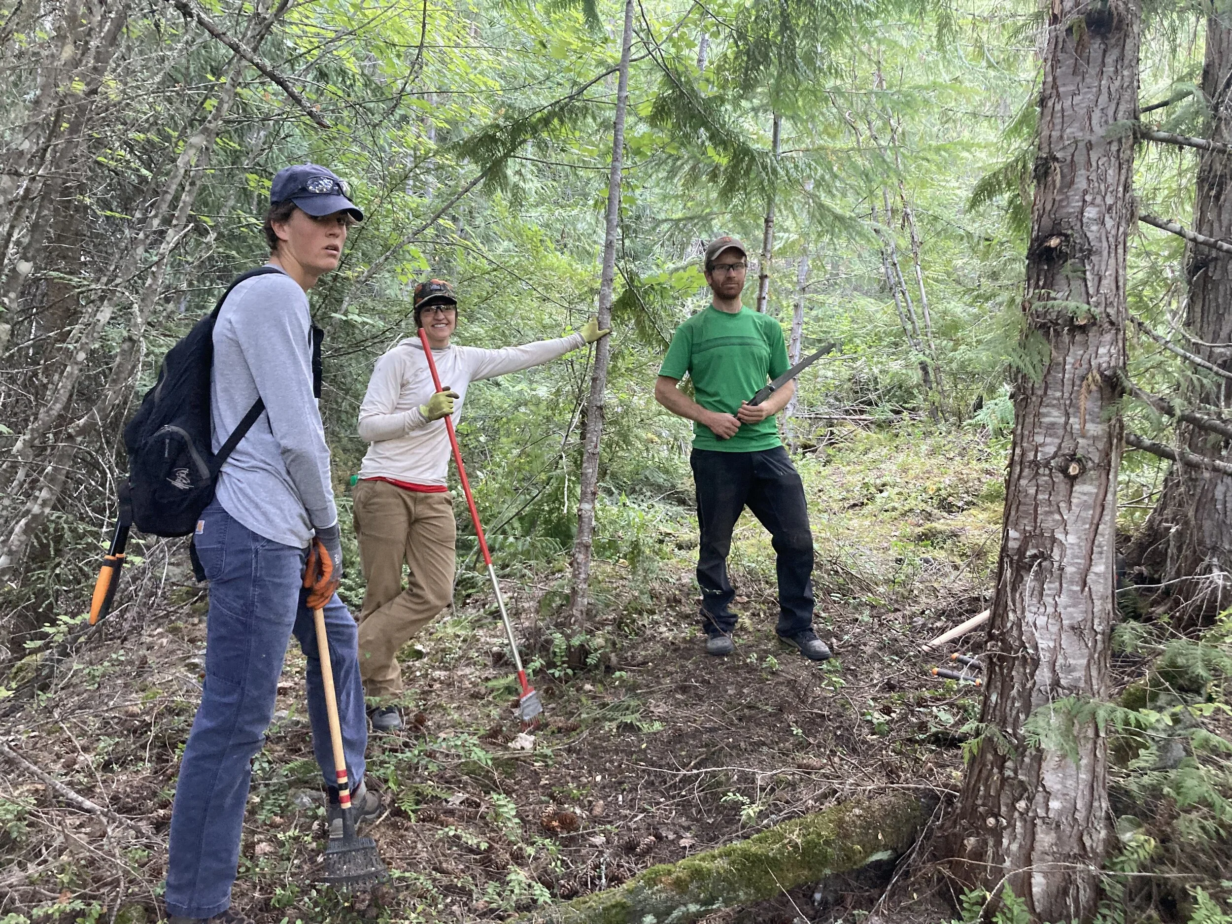 Just before we set off for our daily pole-saw, (plastic) rake, and lopper missions, I was starstruck by Squamish trail building legends Jim and Gary who were on their way up to Out There. We shared trail building stories and they commended the crew for a job well done.