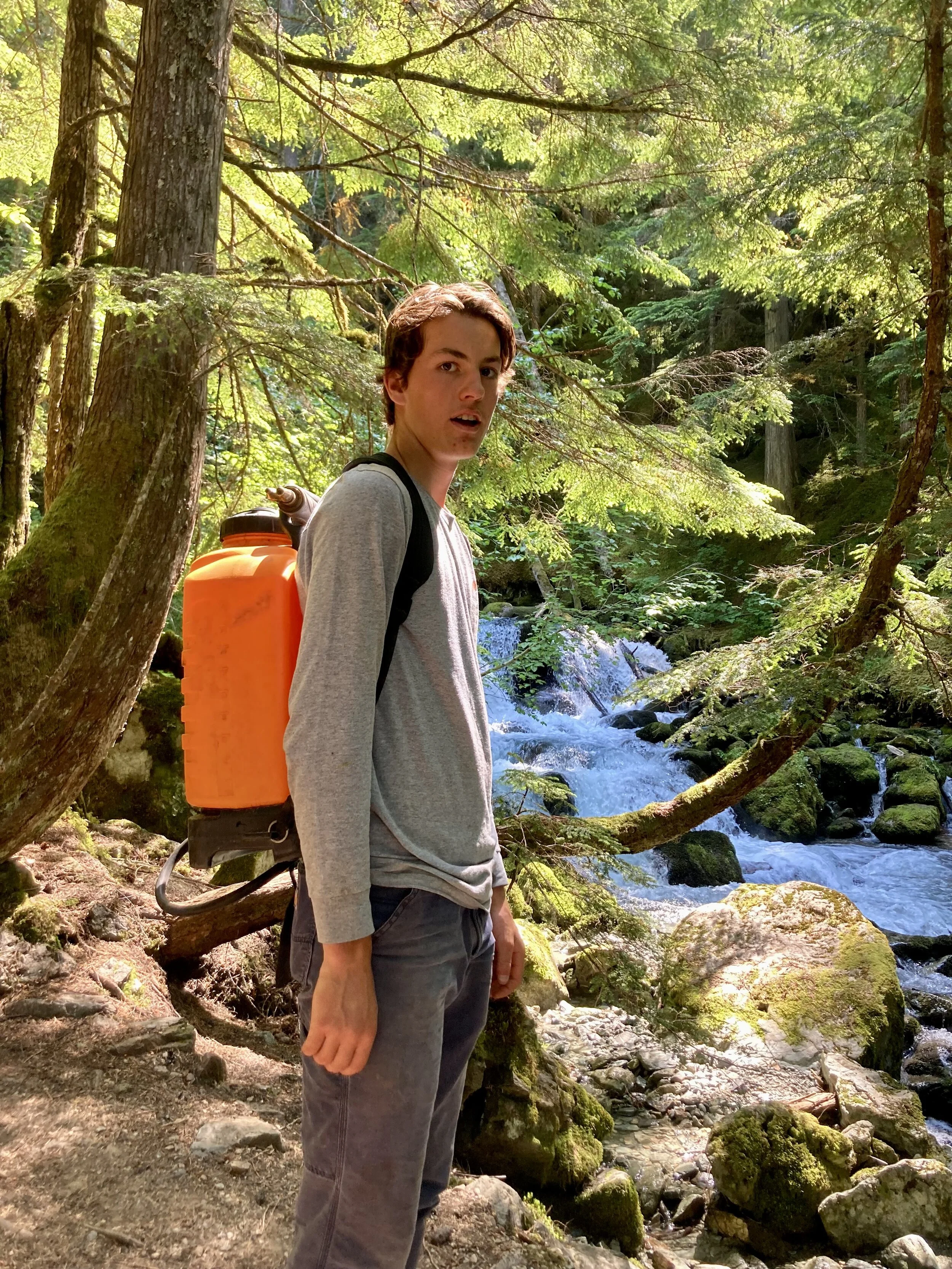 Power tools and digging often spark, so we’re carefully following the provincial protocols for forest interface work. For the trail crew, it means carrying water tanks to work sites and sticking to morning repairs. We spend the afternoons performing low-risk maintenance: loppers and pole-saws to clear the eye-poking branches that curl down when dry.