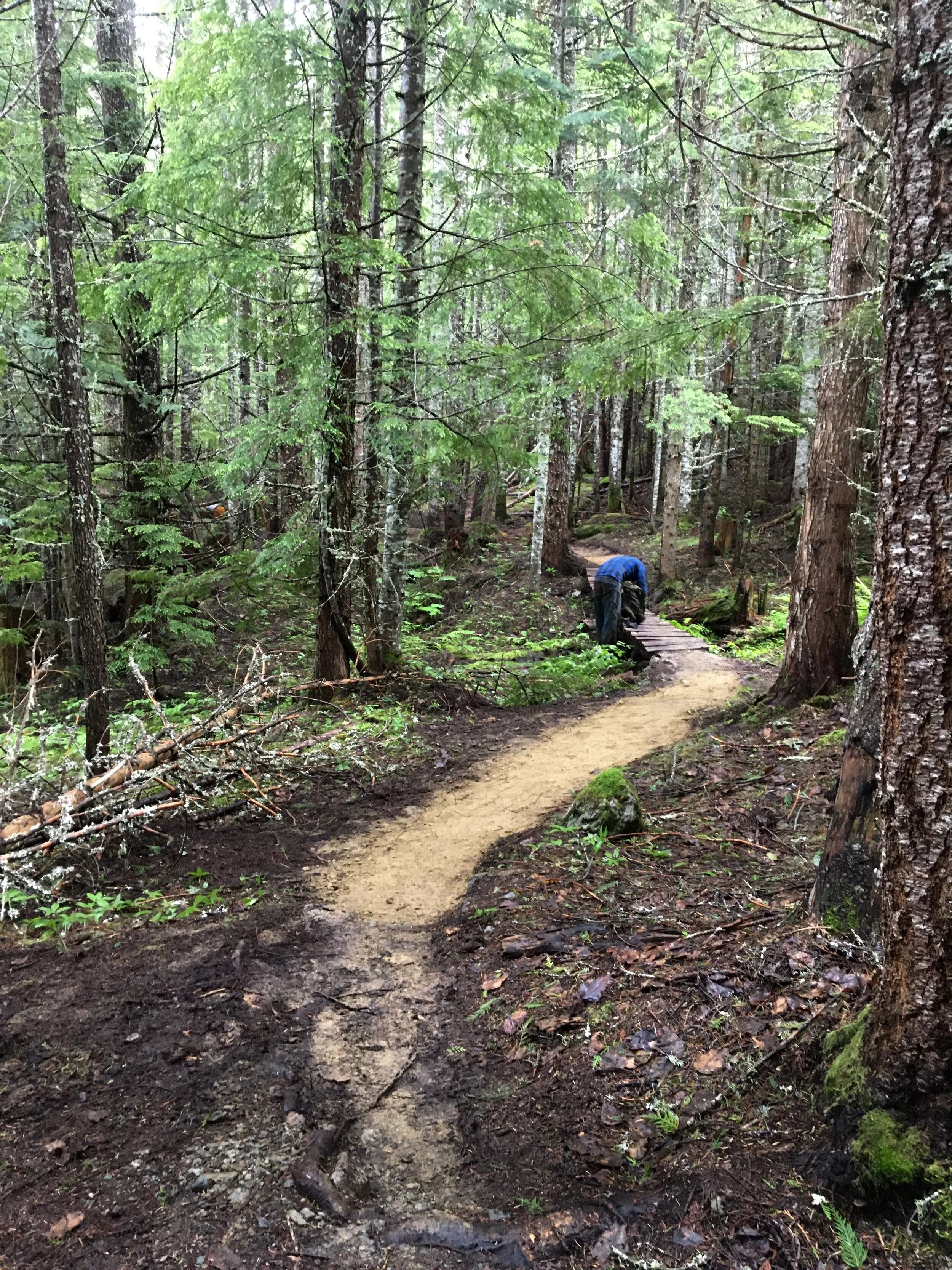 This week the trail crew continued upgrading Industrial Waste. We moved literal mountains of duff and black slime off of the trail. The new recruits gathered tons of rocks and sweet orange dirt to properly weather-proof the tread. There’s still more to do though...