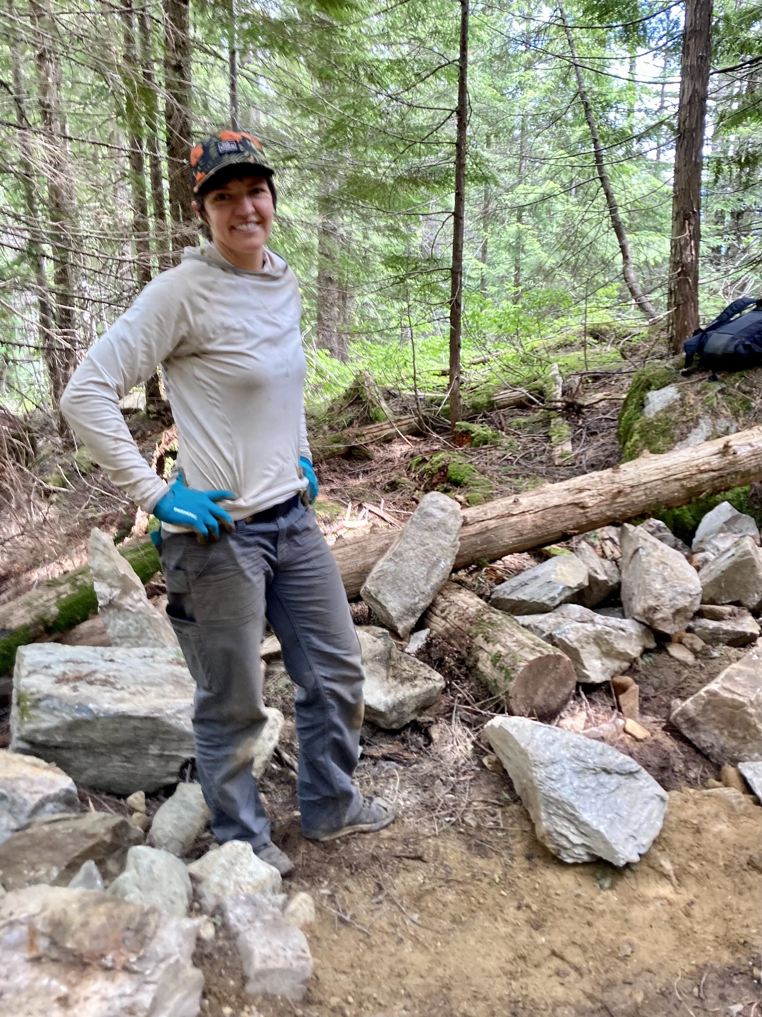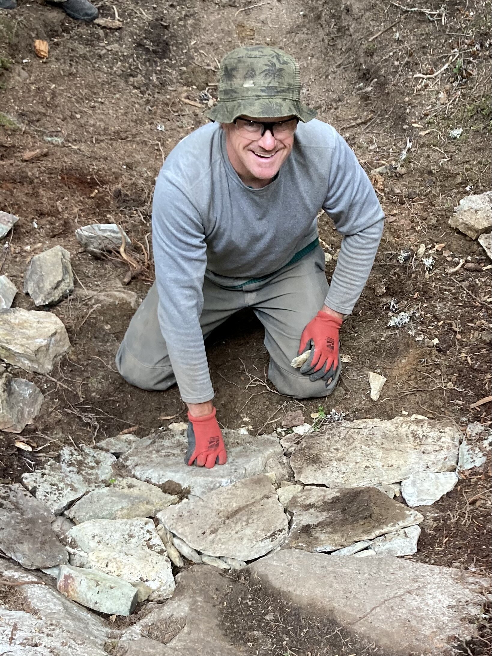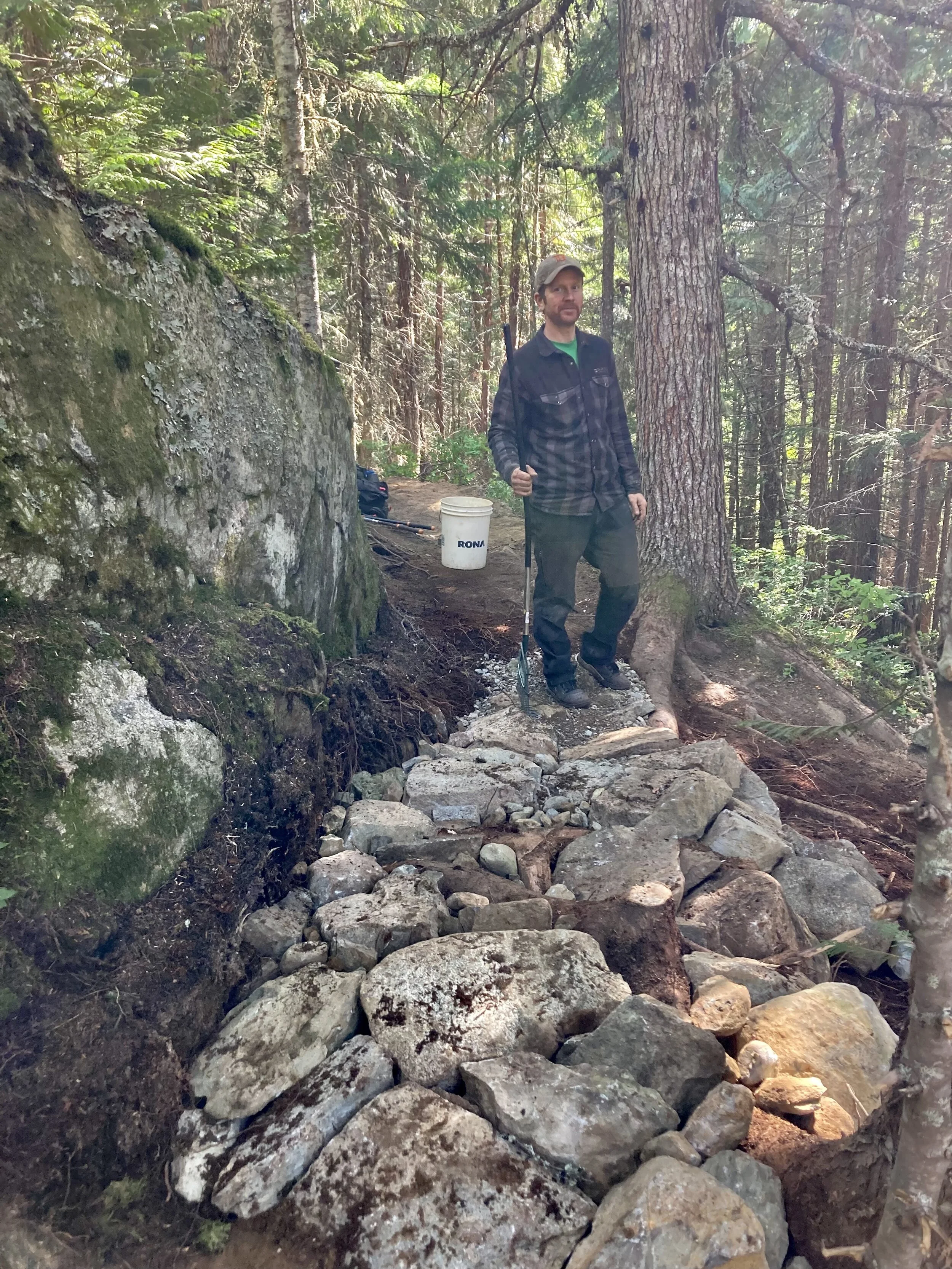 Our current major objective is the “near treeline zone” of Lord of the Squirrels (to upgrade the rooty climb sections). The plan is to gradually move the tools up from the valley bottom, performing repairs along the way. This greatly improves the quality of our commutes (and speed).