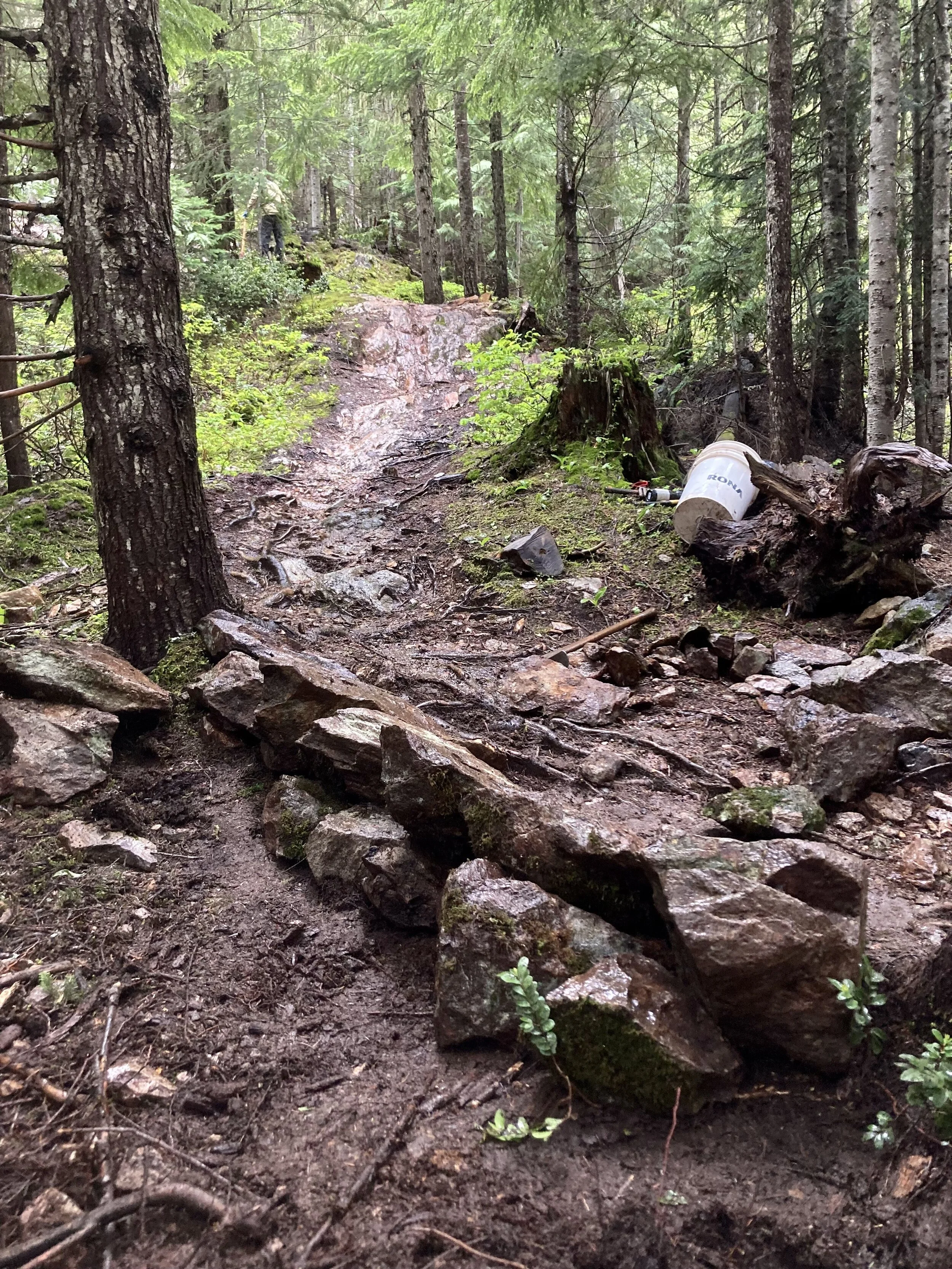 Our strategic climb up Sproatt mountain was fraught with the worst that June-uary could throw at us: curtains of rain, sleet and more cold rain. That moisture has been supercharging plants around the valley so we delayed heading up to higher elevation to give the Hot Dog/ Beaver pass zone a trim. We also “detoured” into Chipmunk rebellion to make sure the drains were… draining.